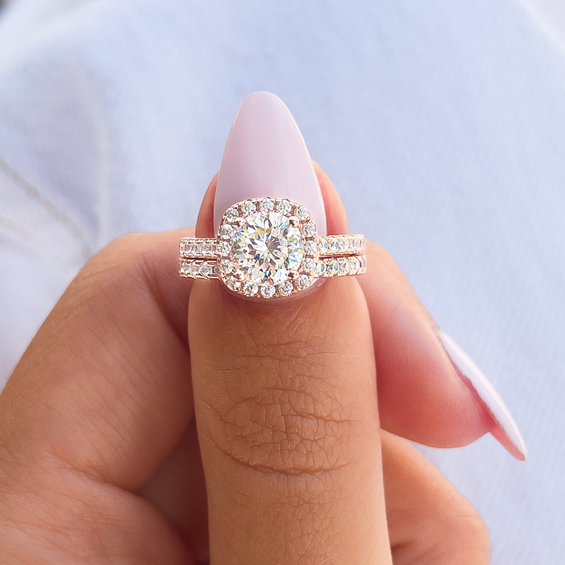 When designing The Evermore in rose gold, we wanted to capture the essence of pure romance and created our reigning best selling wedding set in a stunning rose gold hue. Featuring a 1.5 carat round cut center stone set in a halo and an elegant half-eternity wedding band, this timeless semi-channel 925 sterling silver set will forever be reminiscent of your beautiful love story. Wear The Evermore - Rose Gold on its own for a timeless vibe, or pair it with The Zoey for something more unique! Also available in silver and gold.