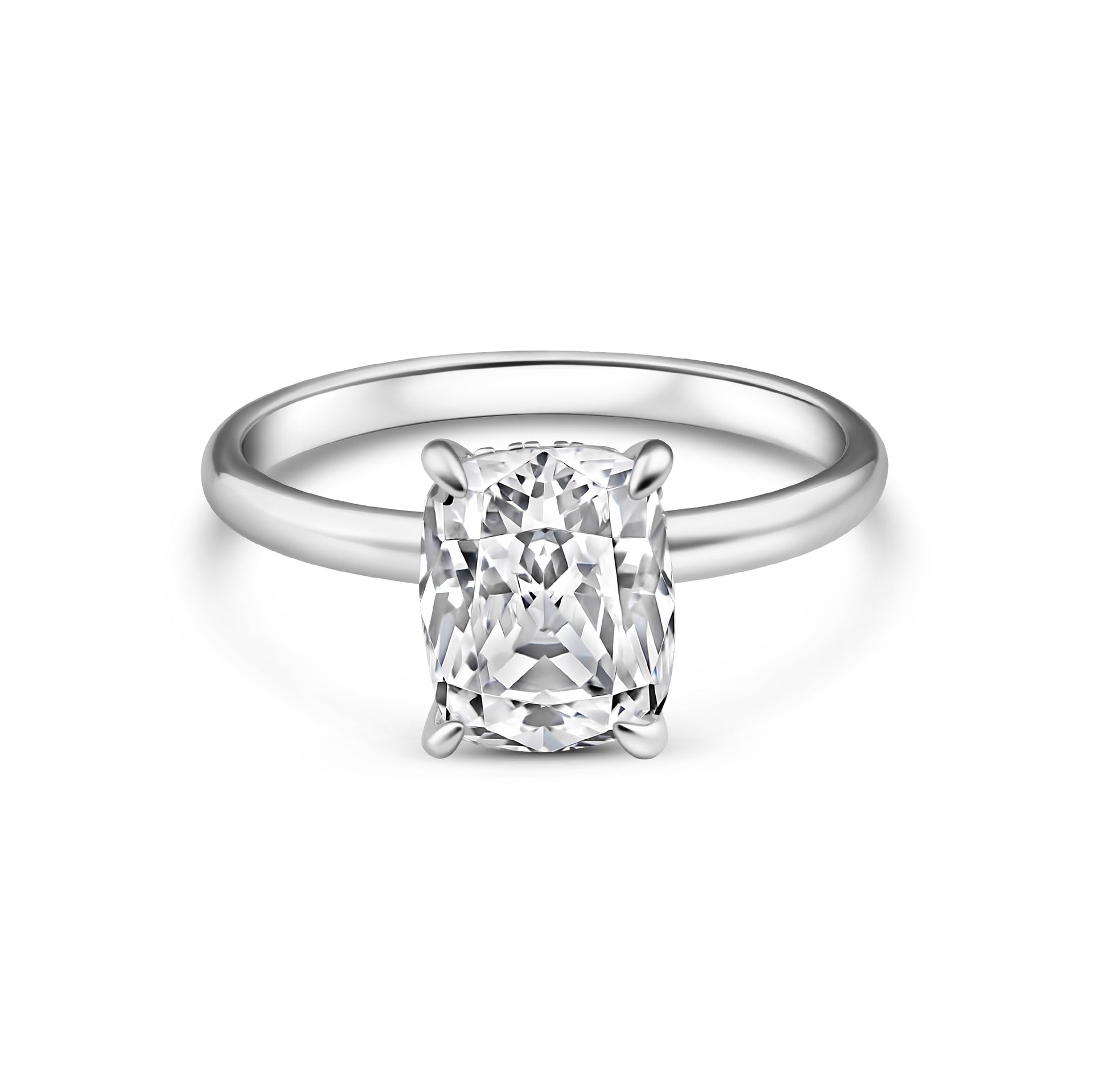 If bold statement pieces are your style, then The Alexis is your perfect match. This classic engagement ring is designed with a 4 carat, conflict–free elongated cushion cut center stone and a sparkly hidden halo that’s set on a polished 925 sterling silver solitaire band. The Alexis is the ideal choice for a bride who loves simplicity, fine lines, and a ring that looks good from every direction. The bold center stone will steal the spotlight every time while the added details give it the extra shine that it needs. Pair this ring effortlessly with any of our wedding bands like The Adeline for a vintage vibe, or The Eternity to bring more sparkle to your bridal stack. Also available in gold.