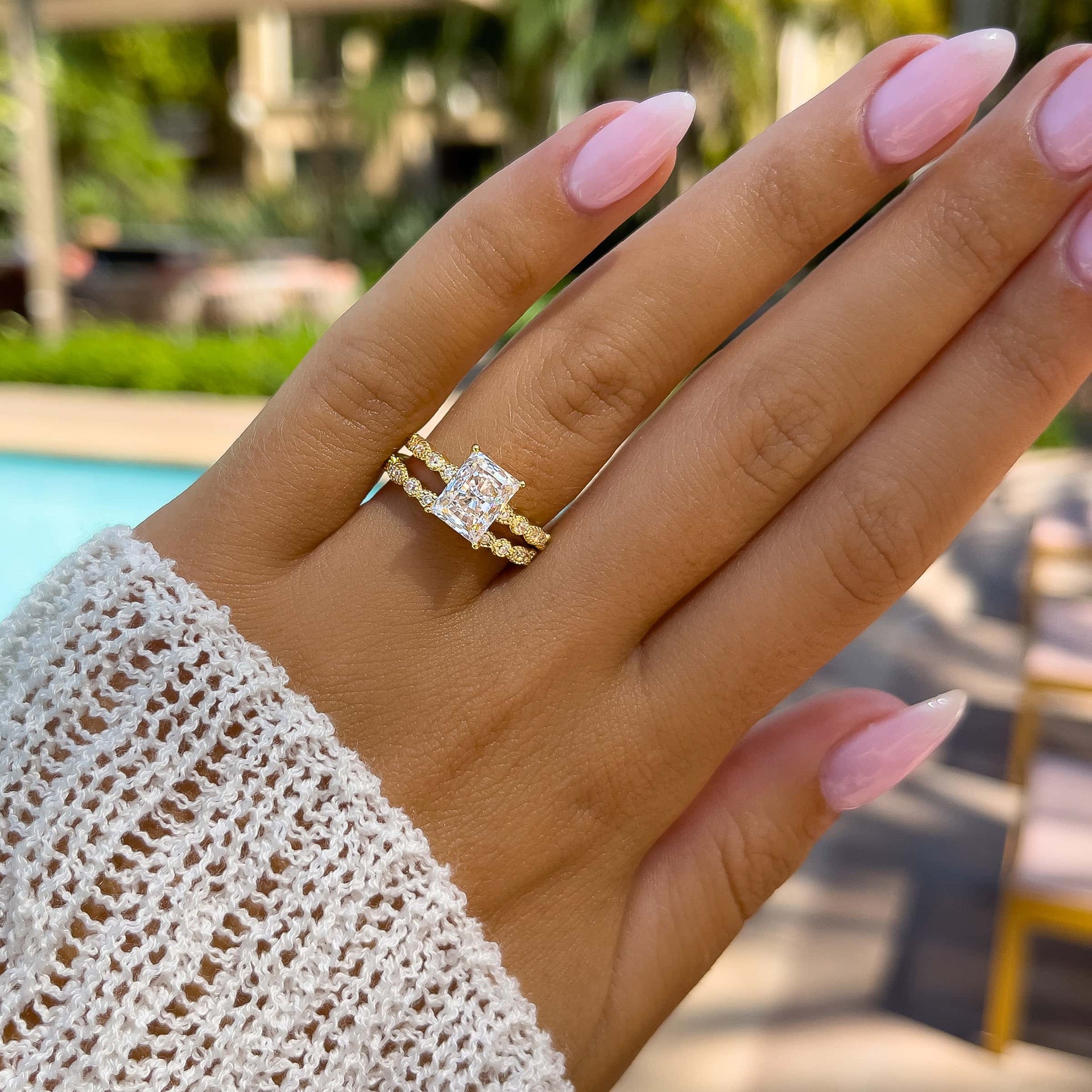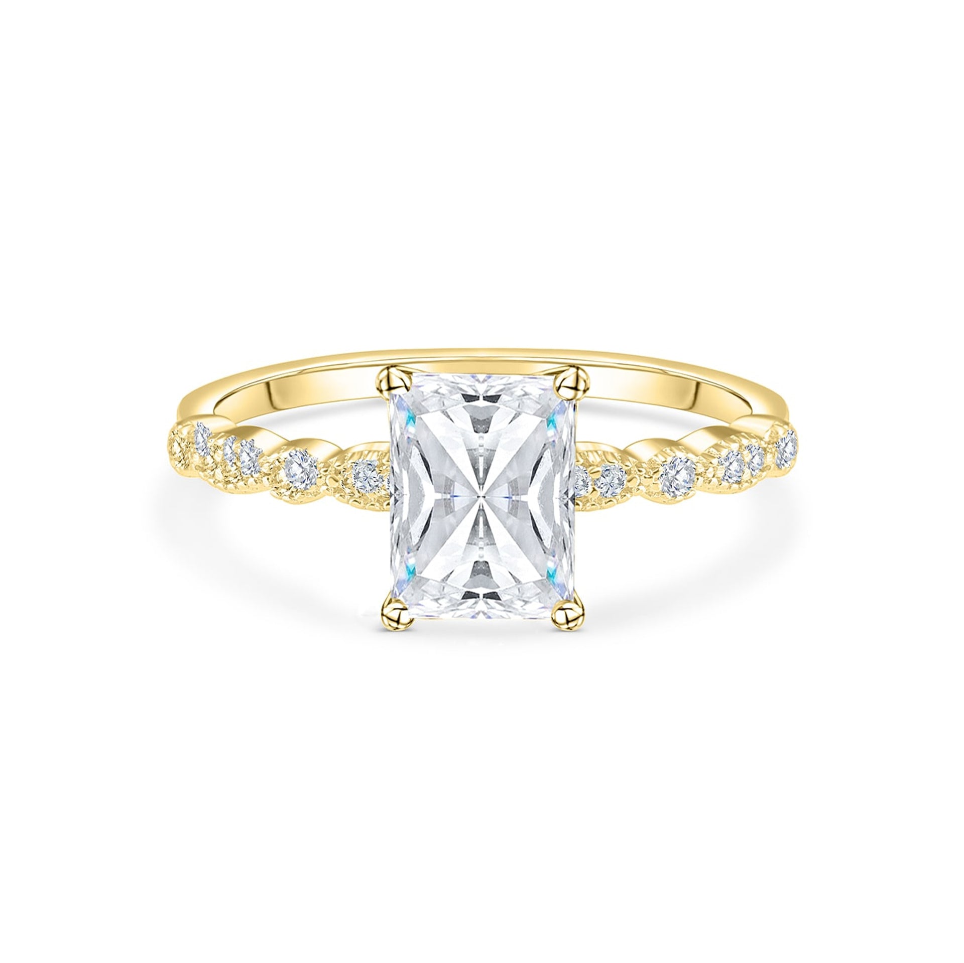 Your favorite radiant cut ring just got a lot more sophisticated with this new gold finish! The Alexandria graces a 1.5 carat conflict free simulated diamond stone set on an ultra-refined 2.5mm vintage inspired band. Feminine yet bold, this engagement ring will not only catch your eye, but it’ll steal your heart! For a matching wedding set, pair it with The Forever band. Also available in silver and rose gold.