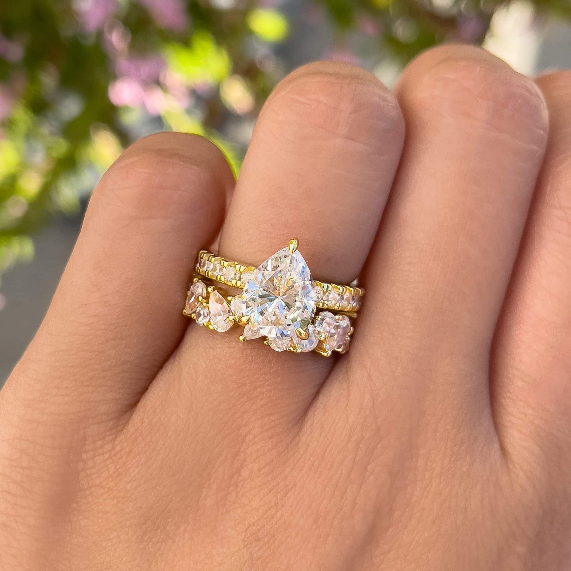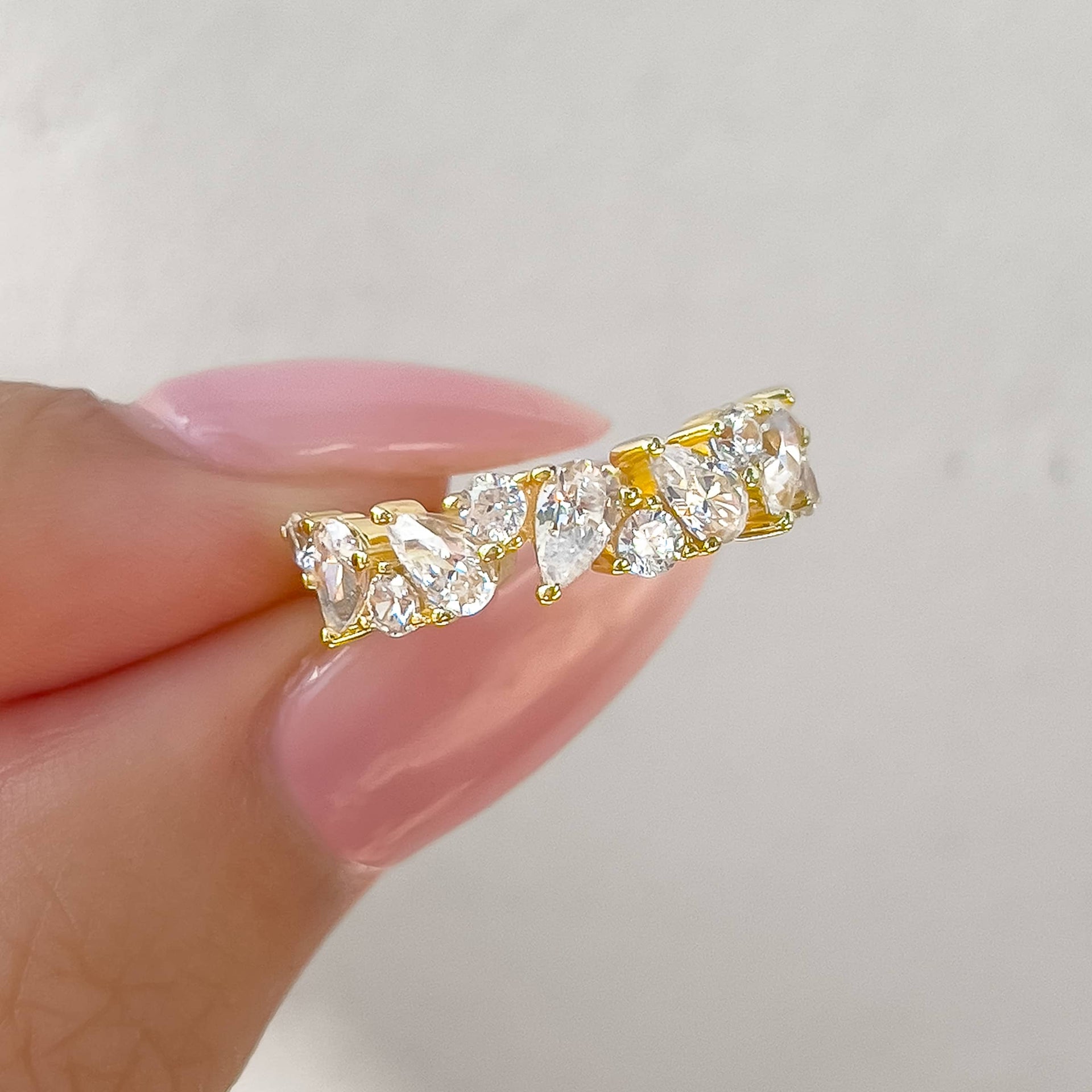 Introducing a uniquely designed wedding band that's anything but ordinary. The Alia features a stunning display of alternating pear and round cut stones that are carefully set on a sleek gold band. Whether you want to add flair to your wedding set or just adorn your finger with beautiful gems, this ring is versatile in every way. We love to see her paired with The Amelia for a sparkly combination, stacked with The Elena for a modern and vintage set, or even worn solo as a standalone masterpiece! Also available in silver.