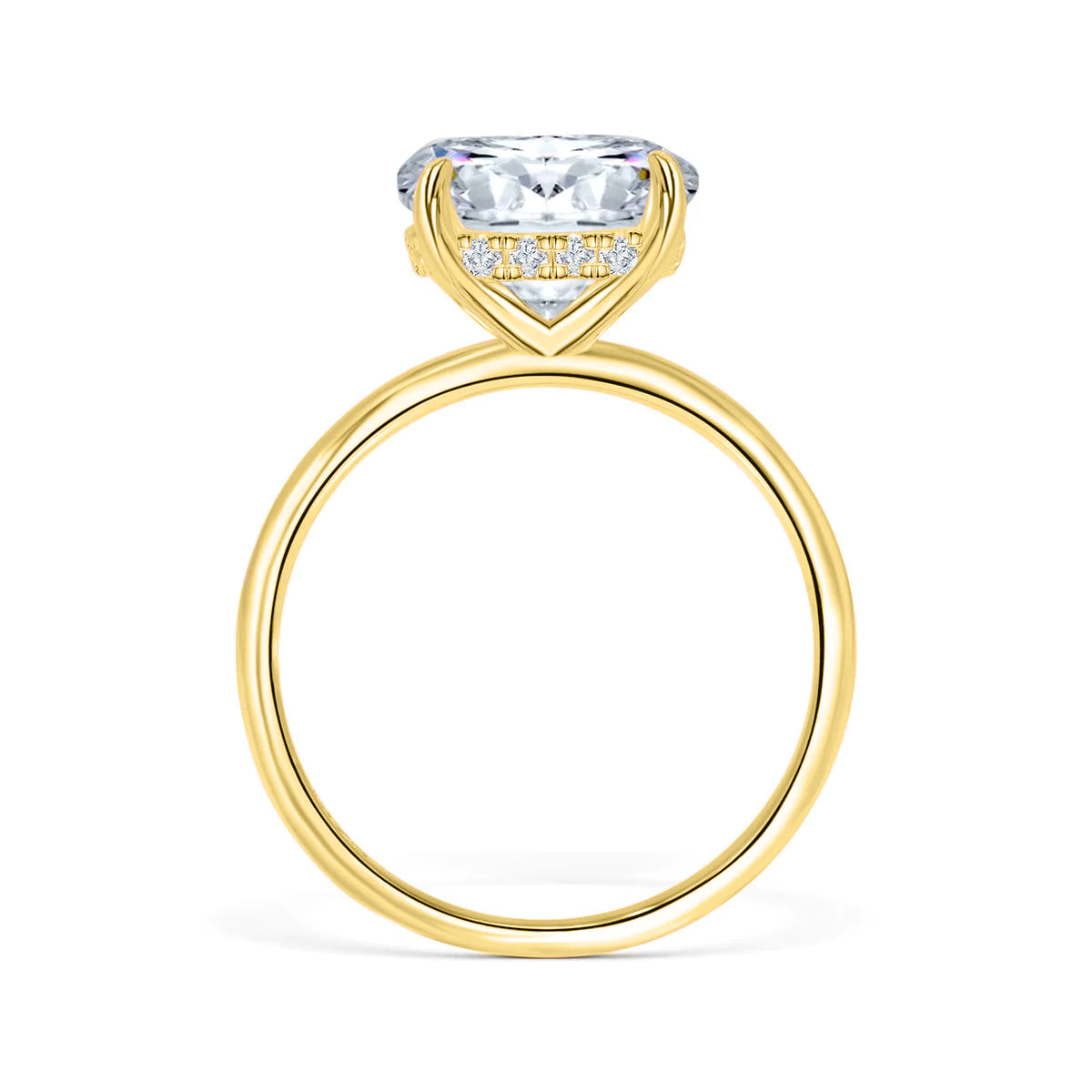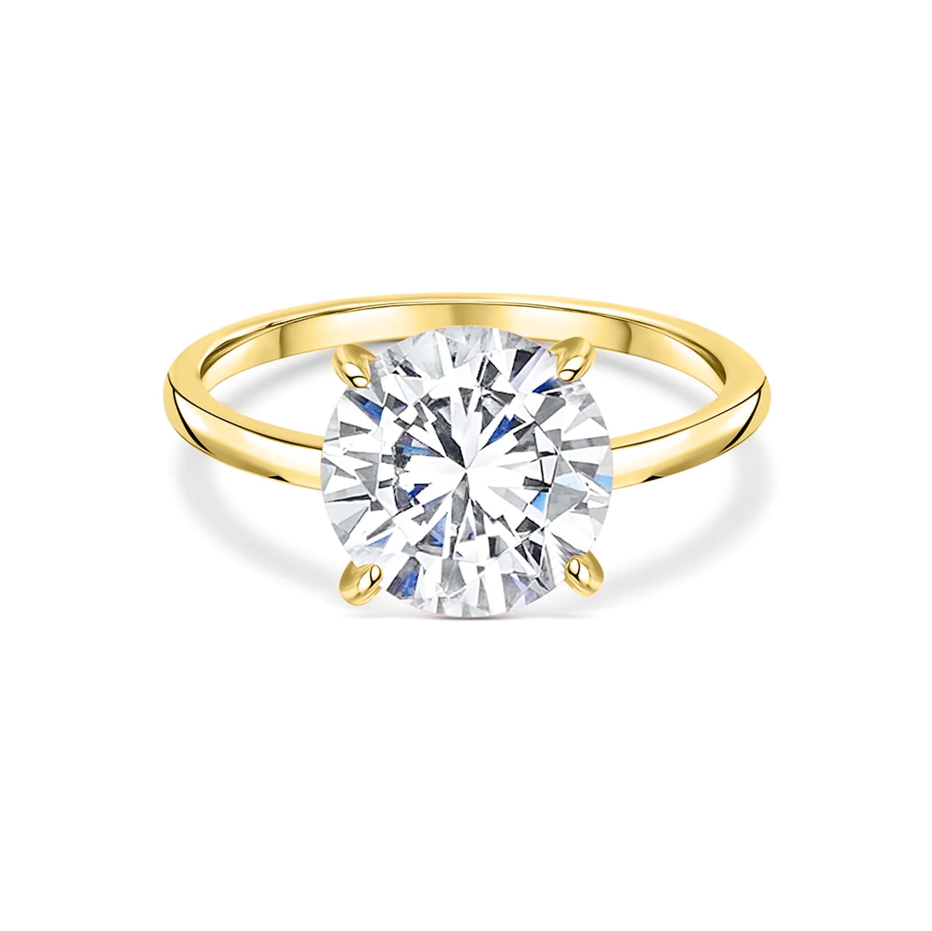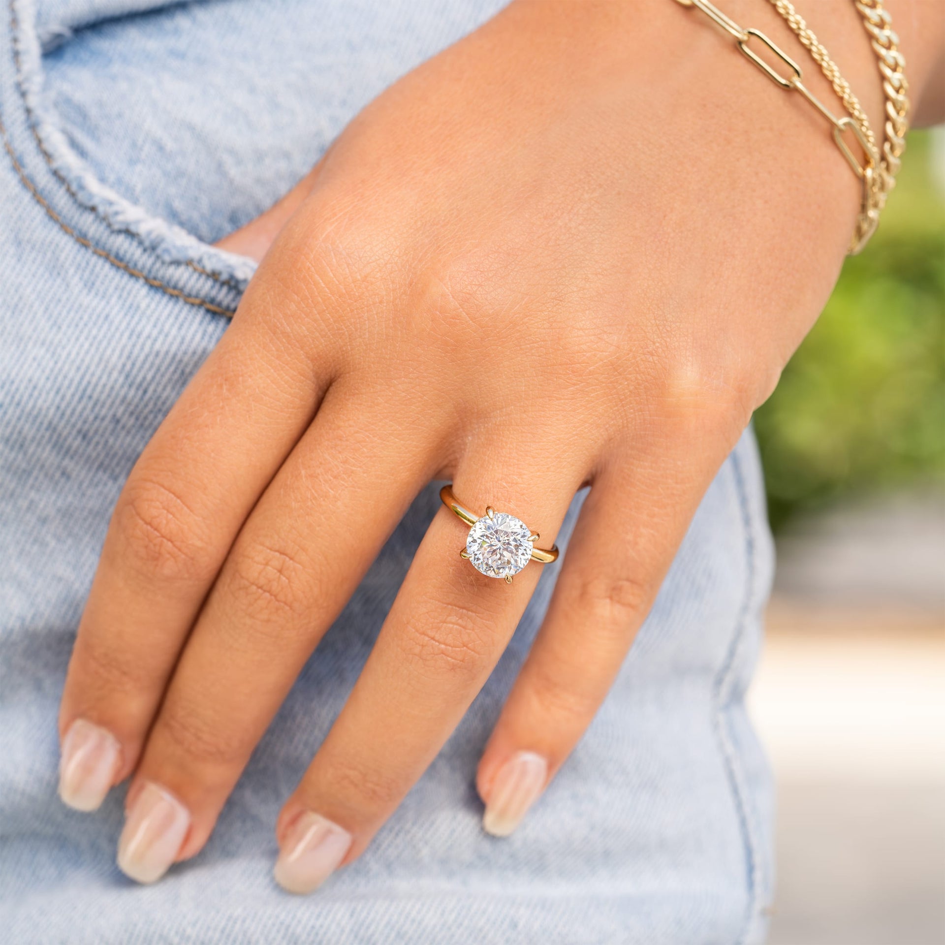 Prepare to completely fall in love with this ring. The Chelsea is the epitome of true elegance and beauty. Its gold solitaire band adds warmth and sophistication to any look. The conflict free 3 carat round cut simulated diamond center stone sits on top of an alluring hidden halo, radiating a sparkle you can’t miss! Its simplistic charm makes it the perfect ring to pair with any band. This classic look that has endless intrigue also comes in silver and rose gold! Pair it with The Desire for a minimalist style or wear it with The Sadie for a uniquely detailed wedding ring set.