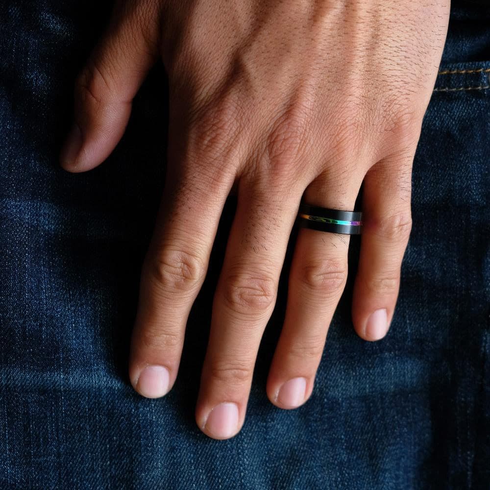 This one is made for those who want a ring that’s high quality and fun. Crafted to perfection, The Dragon Glass tungsten carbide ring with a rainbow inlay is sleek and has a nice weight to it. With a vivid multicolor stripe running boldly down the center, you’ll stand out without a doubt. This ring checks all the boxes: it’s hypoallergenic, durable and ultra scratch-resistant. What more could you want?