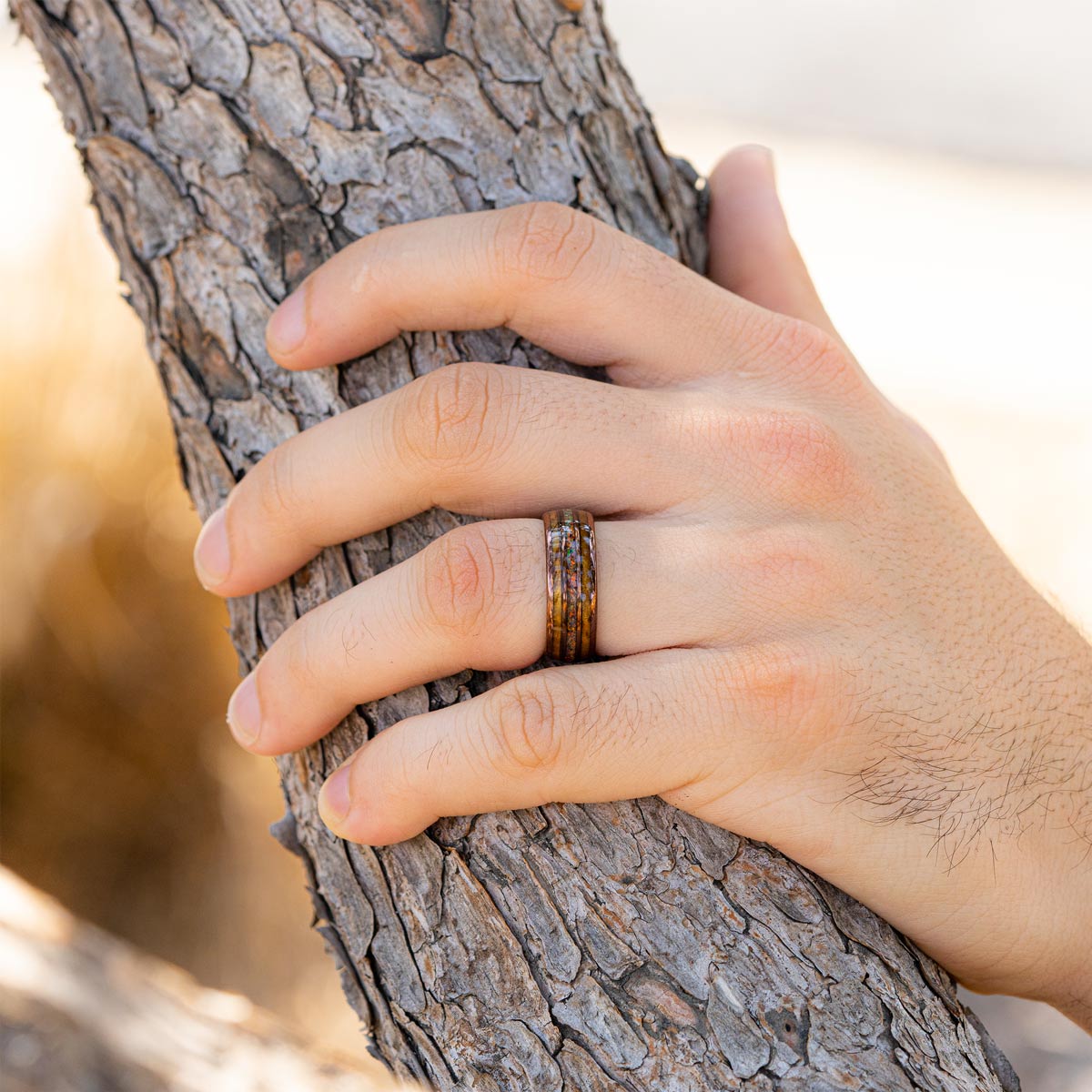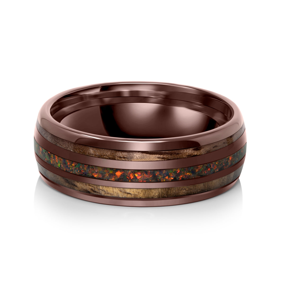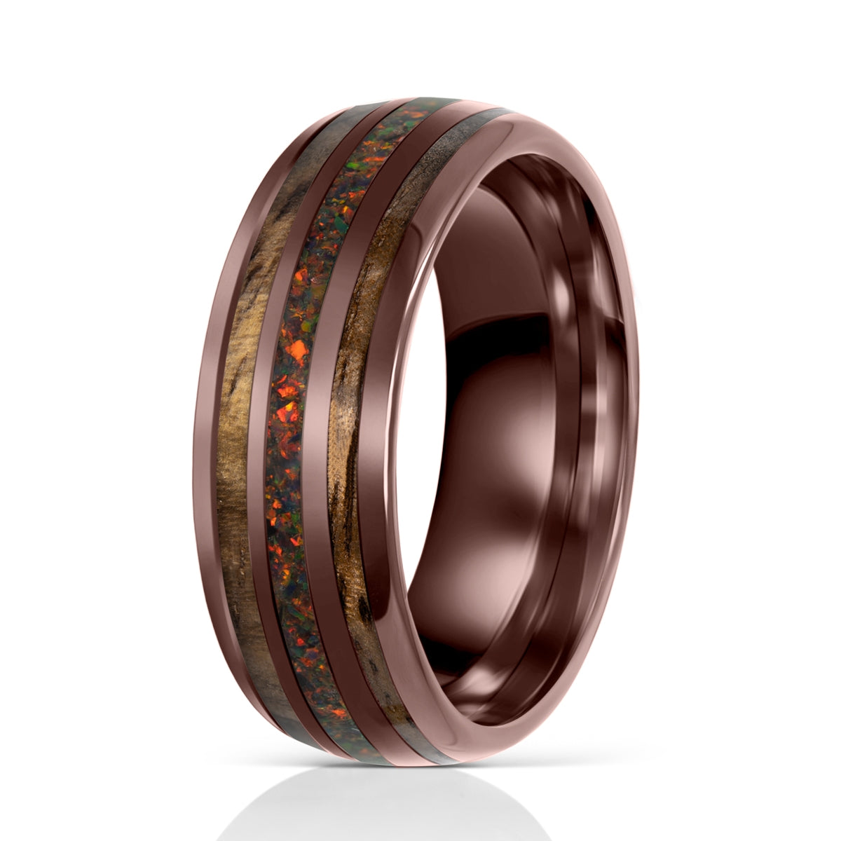 Crafted from high-quality tungsten carbide, The Ember combines strength with luxury. The bronze tungsten base provides a resilient foundation, while the lab-created fire opal and Hawaiian Koa Wood inlays add a touch of unique charm. This wedding band is not only stylish but also durable, offering a sleek and comfortable fit that stands the test of time.