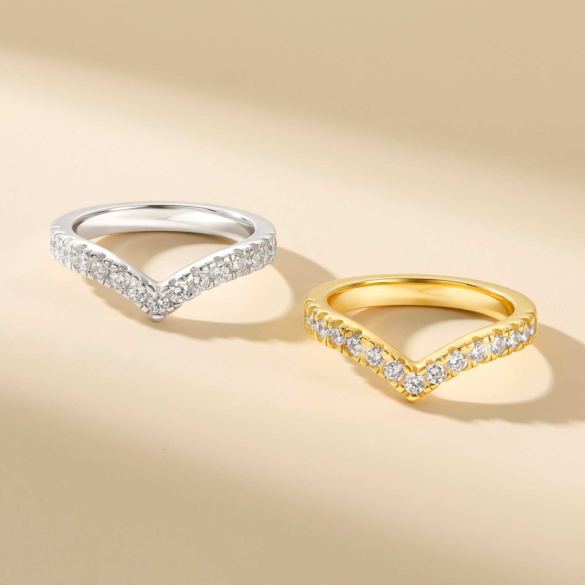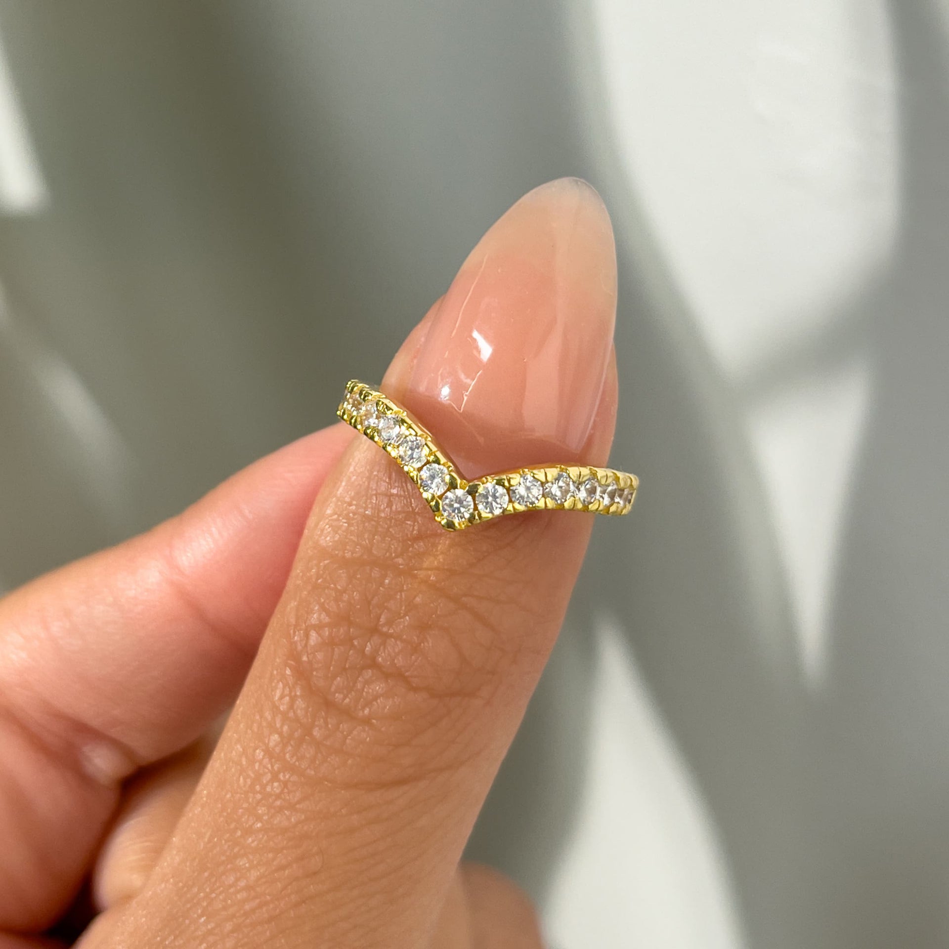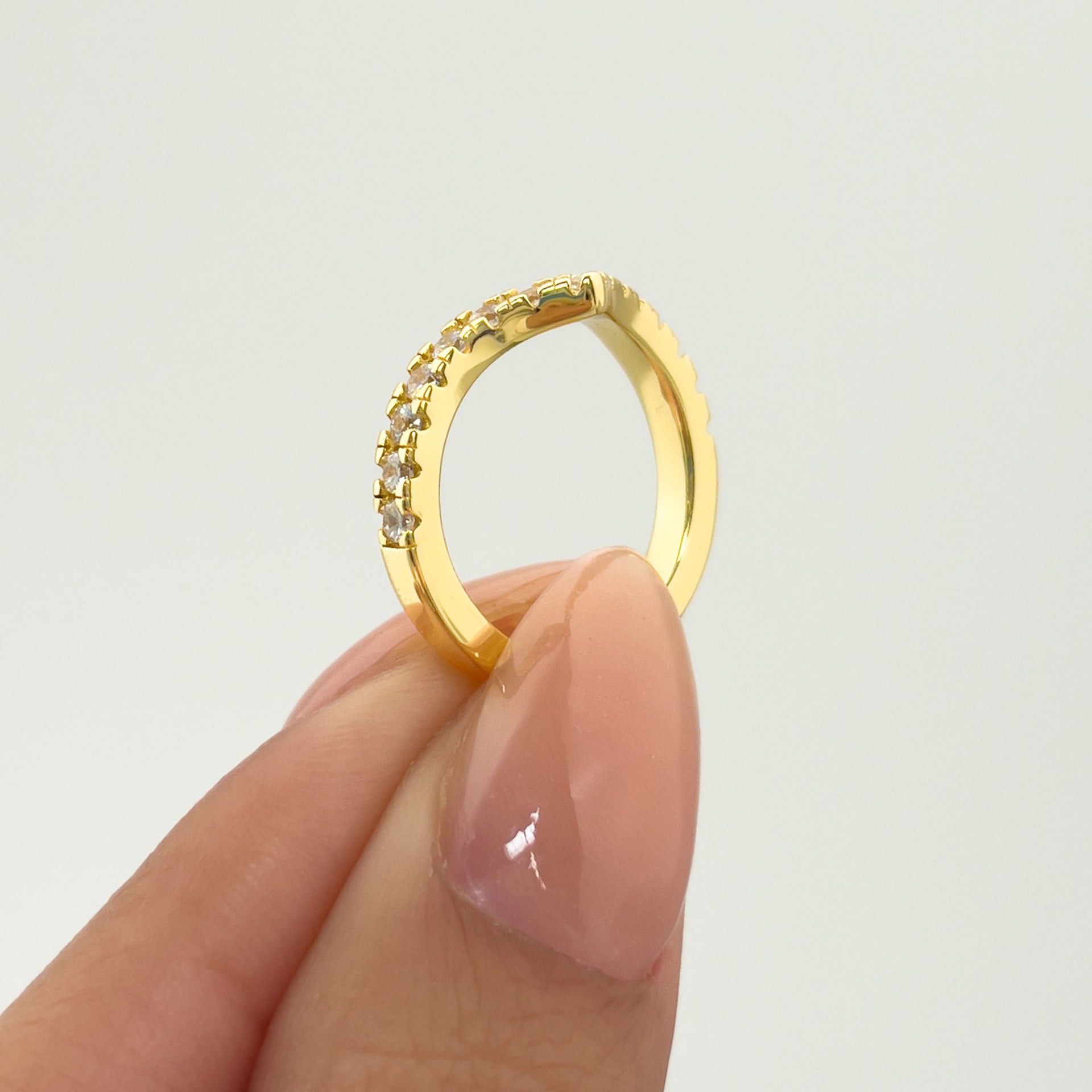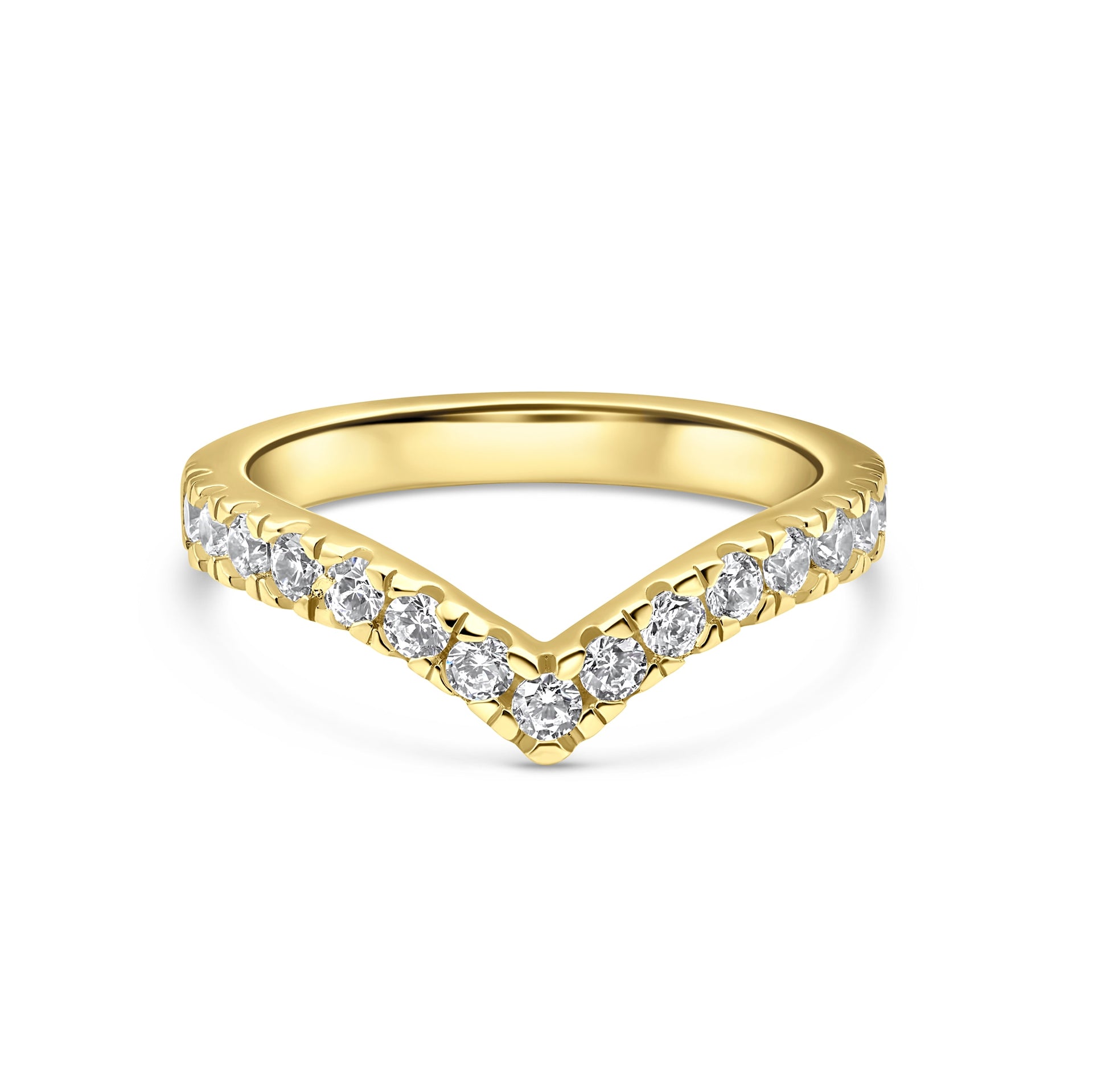 Make every hour golden hour with The Erika. We took the design of our beloved Zoey band and made it bigger and more iconic. The Erika is a half eternity chevron band crafted with a brilliant set of conflict-free simulated diamonds sitting on top of a yellow gold polished band. This ring has a width of 2.6mm making it a sure standout no matter how you style it. The Erika’s V shape design makes it a perfect match for any of our engagement rings. Pair it with The Amelia for the ultimate sparkly stack or let her shine on her own as a staple everyday piece. Also available in silver.