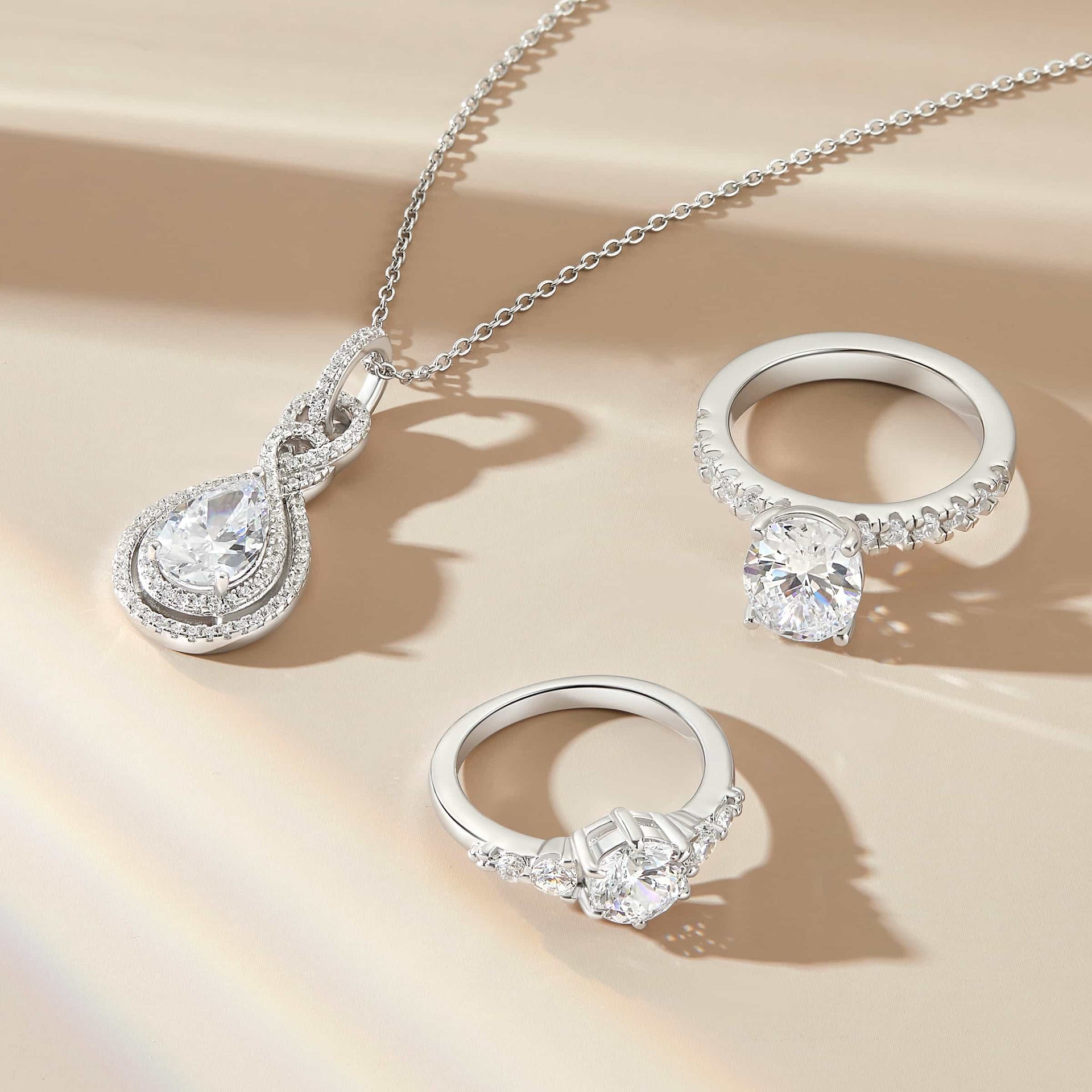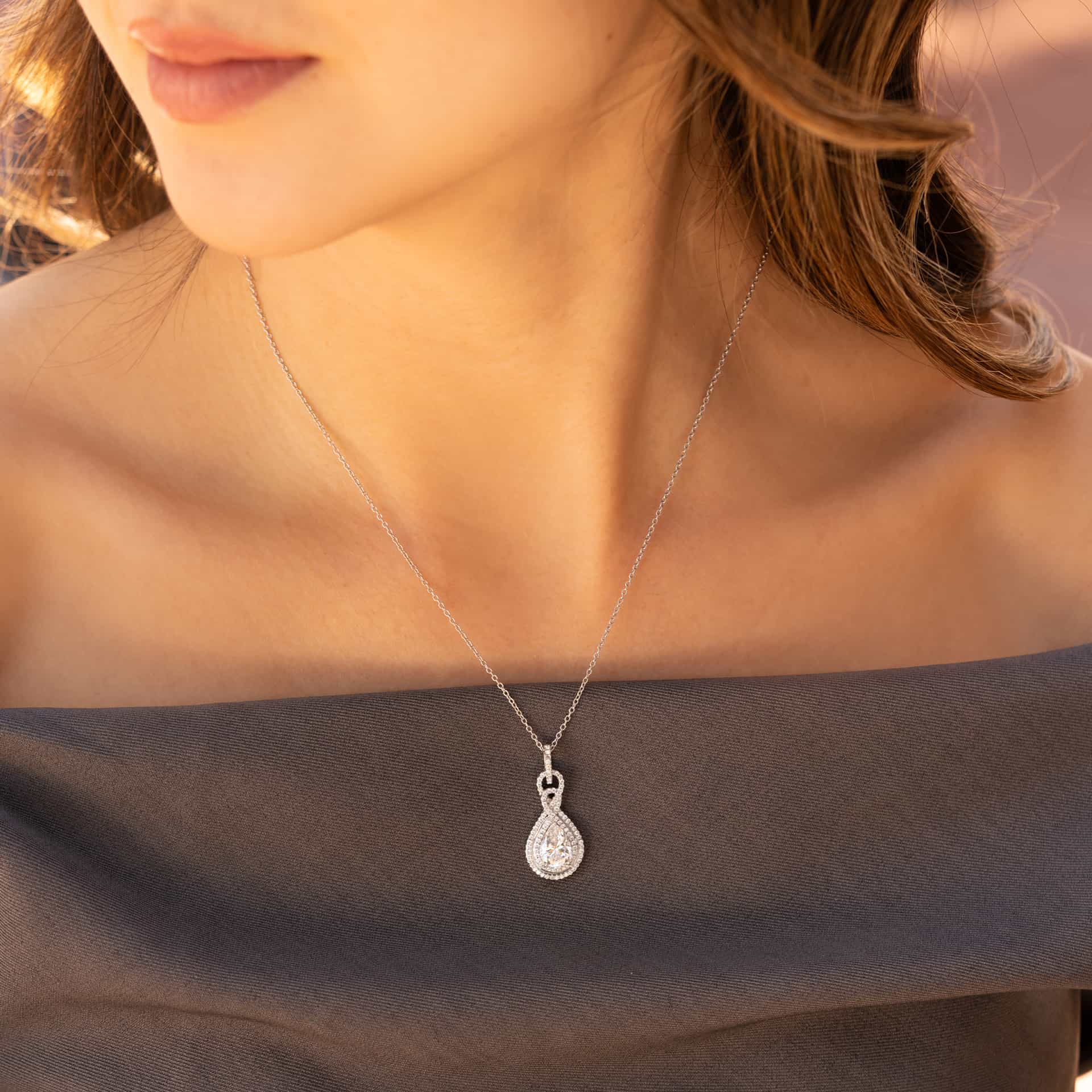 When you’re wearing this stunner, believe us: HEADS. WILL. TURN! The Harmony features an opulent, layered figure 8 pendant encrusted in shimmering gems. Inside the figure 8 is a dazzling 2 carat teardrop shaped stone that multiplies the WOW factor by 10000x! Made with the highest quality 925 sterling silver, simulated diamonds, and plated in rhodium, this piece will keep its radiance for years to come!