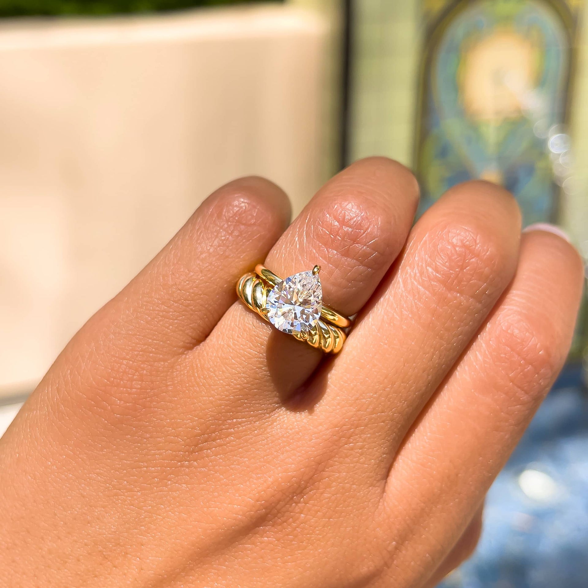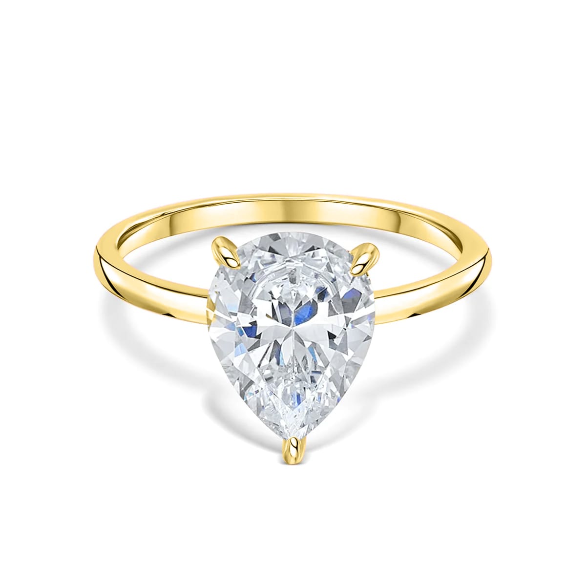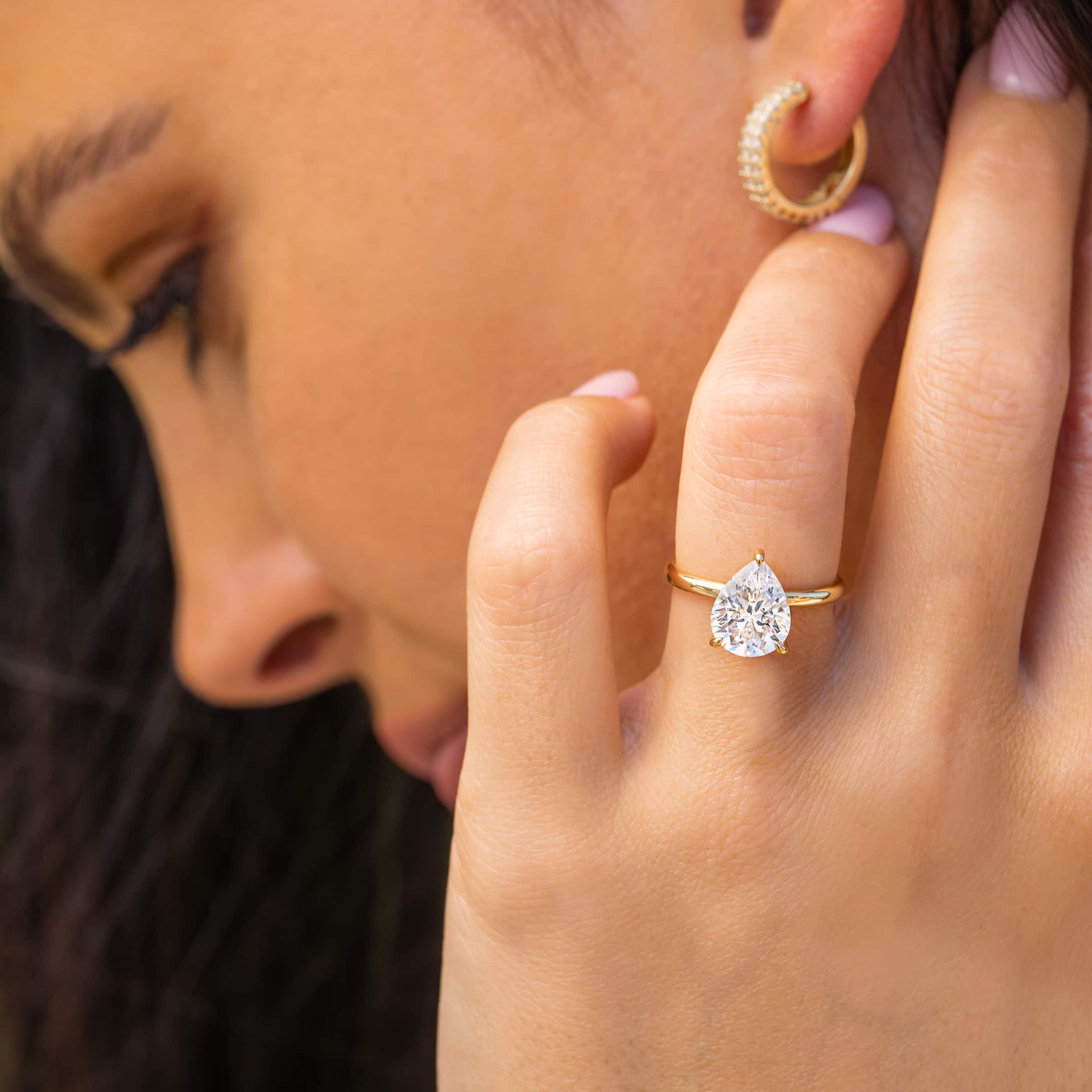 Looking for minimalistic elegance? The Kira was designed with just this vibe in mind. Featuring a bold 3 carat pear cut center stone and stunning hidden halo detail, the sparkle this ring brings is unmatched! Its minimal, sleek gold solitaire band proves that when selecting your forever engagement ring, simple and effortless are the way to go! Worn alone, it is gorgeous, but for a uniquely timeless wedding ring stack, pair it with The Sadie or The Eternity. Also available in silver and rose gold.