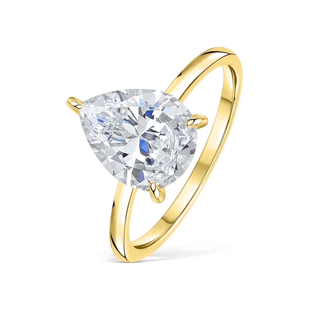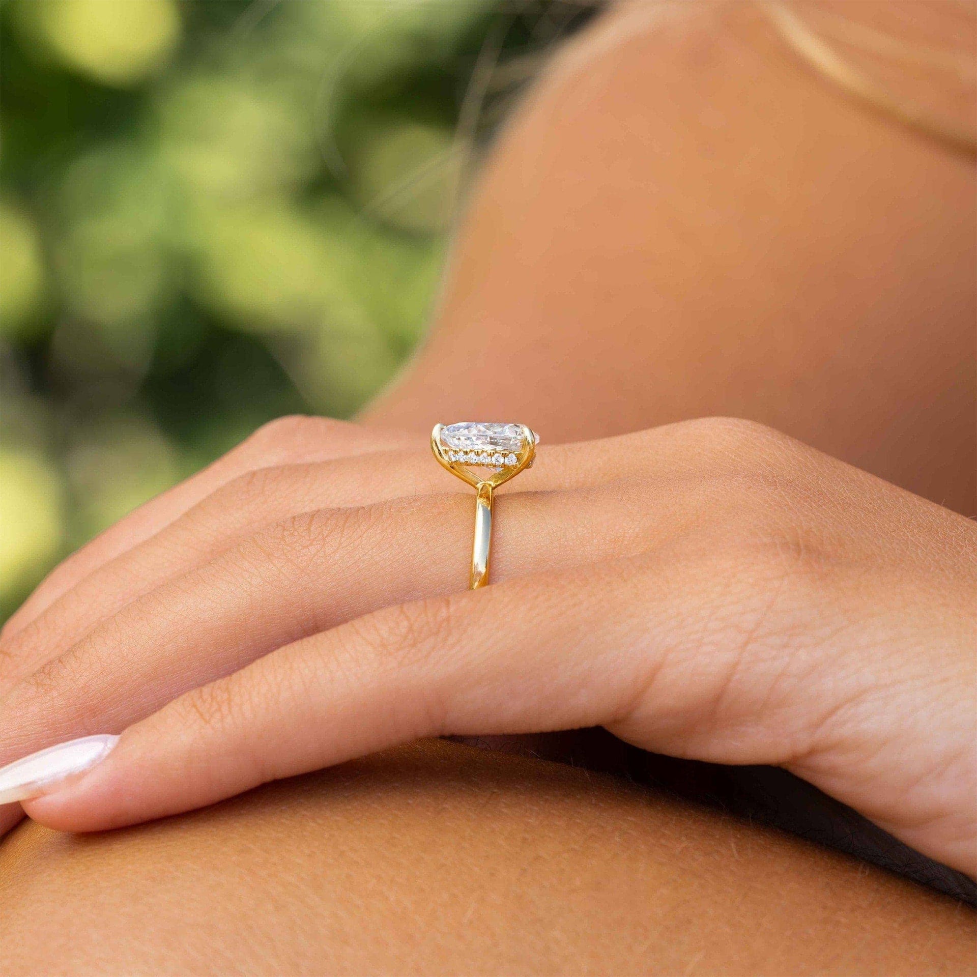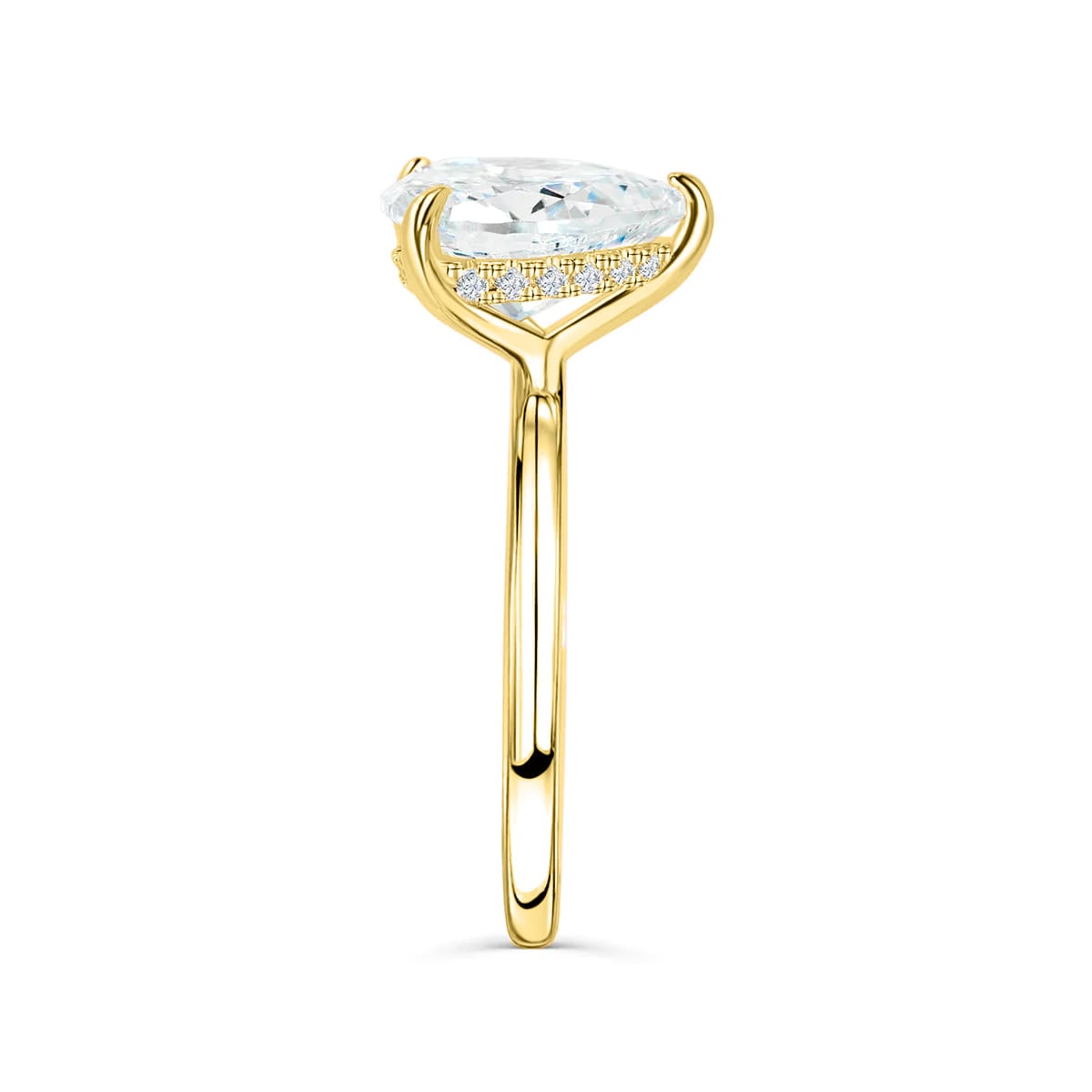 Looking for minimalistic elegance? The Kira was designed with just this vibe in mind. Featuring a bold 3 carat pear cut center stone and stunning hidden halo detail, the sparkle this ring brings is unmatched! Its minimal, sleek gold solitaire band proves that when selecting your forever engagement ring, simple and effortless are the way to go! Worn alone, it is gorgeous, but for a uniquely timeless wedding ring stack, pair it with The Sadie or The Eternity. Also available in silver and rose gold.