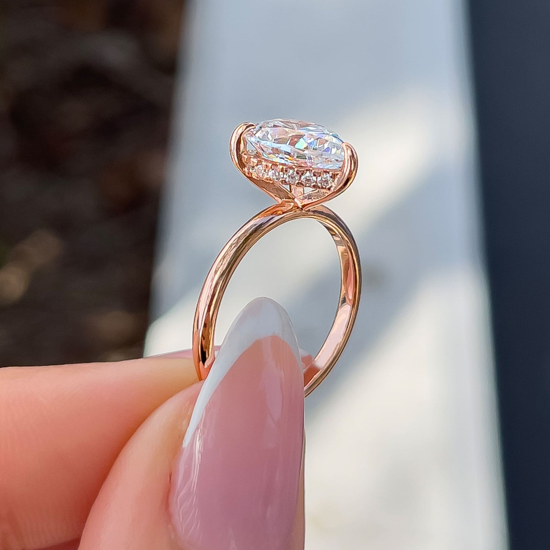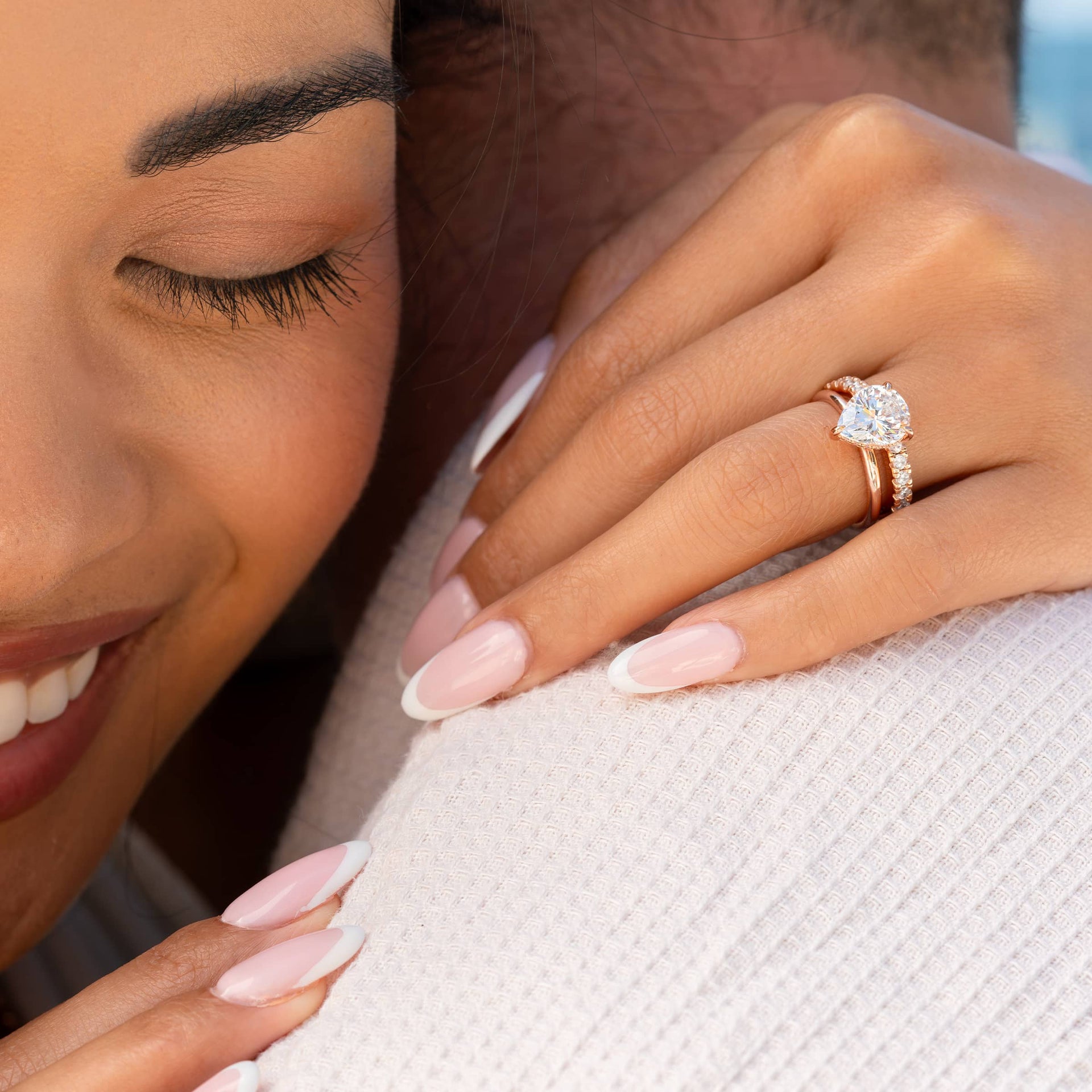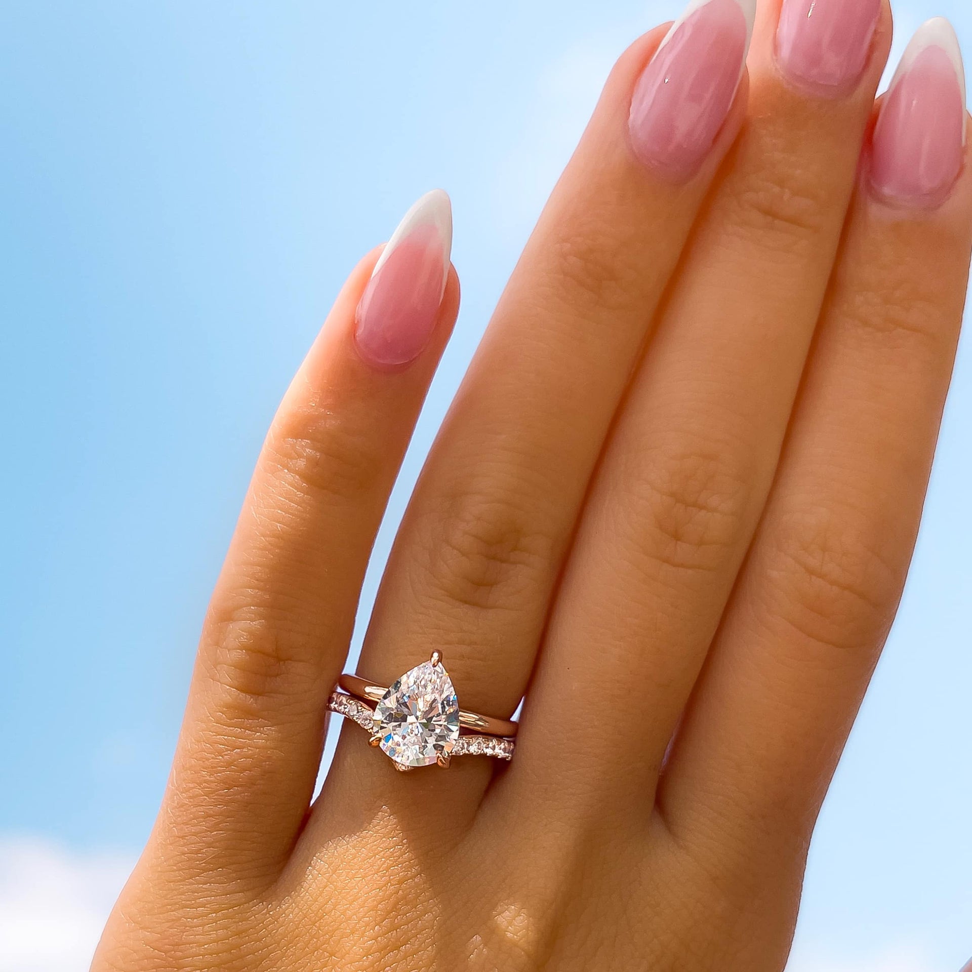 Let it sparkle! You’re going to want to show off this ring (and trust us, people will ask to see it). At a jaw-dropping 3 shimmering carats, The Kira is the perfect blend of glamour and elegance. Whether you’re walking into a meeting, a black-tie event, or the local grocery store, feel confident in this stunning pear cut hidden halo ring. Also available in silver and gold.We love pairing it with The Forever or The Mia for a sweet and sparkling set. Also available in silver and gold.