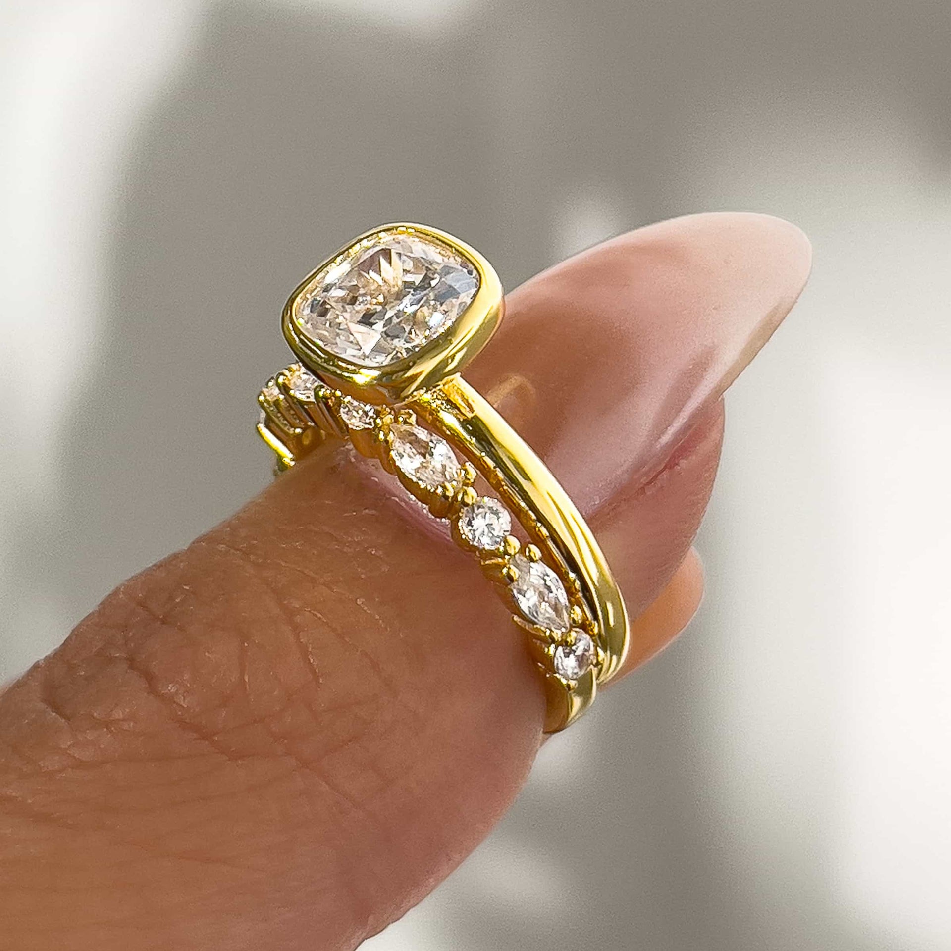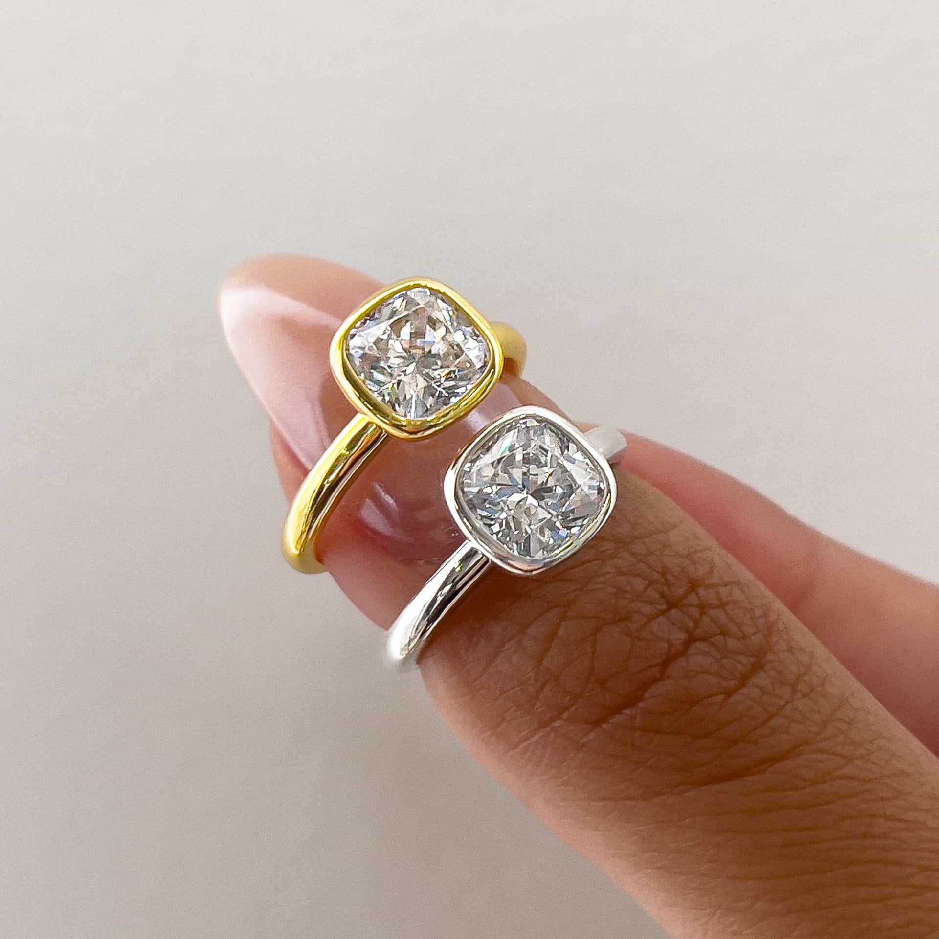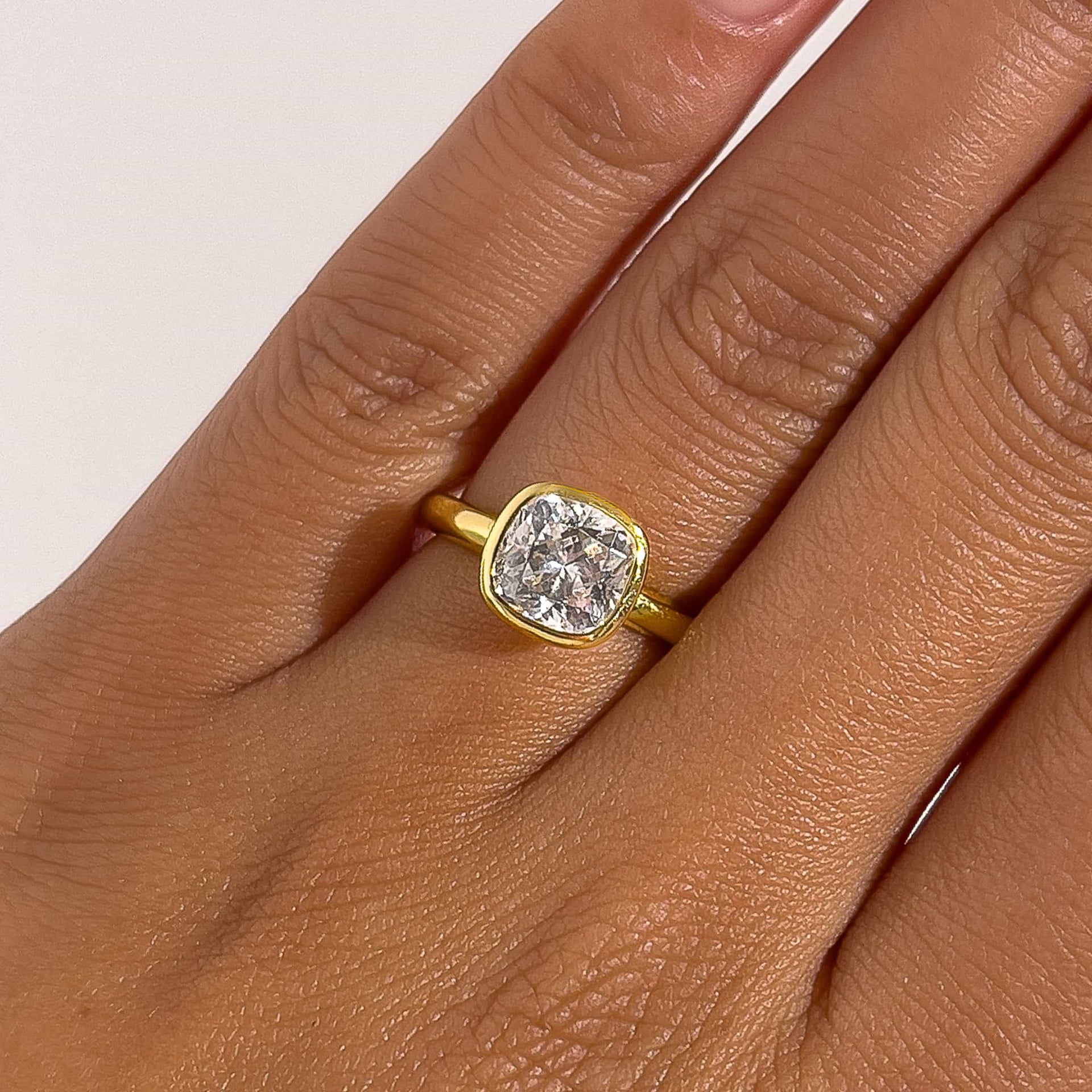 Classic with a fresh twist, The Margot brings warmth and charm to a timeless design. Featuring a dazzling 2 carat cushion cut conflict-free center stone in a bezel setting atop a solitaire band, this engagement ring is finished with a shiny 18k yellow gold plating. It's romantic shape and low profile make it ideal for the bride who loves a vintage touch without all the fuss. Want to add extra flair? Pair some of our wedding bands like The Promise or The Eternity for a sparkly stacked combo that will turn heads. Also available in silver.