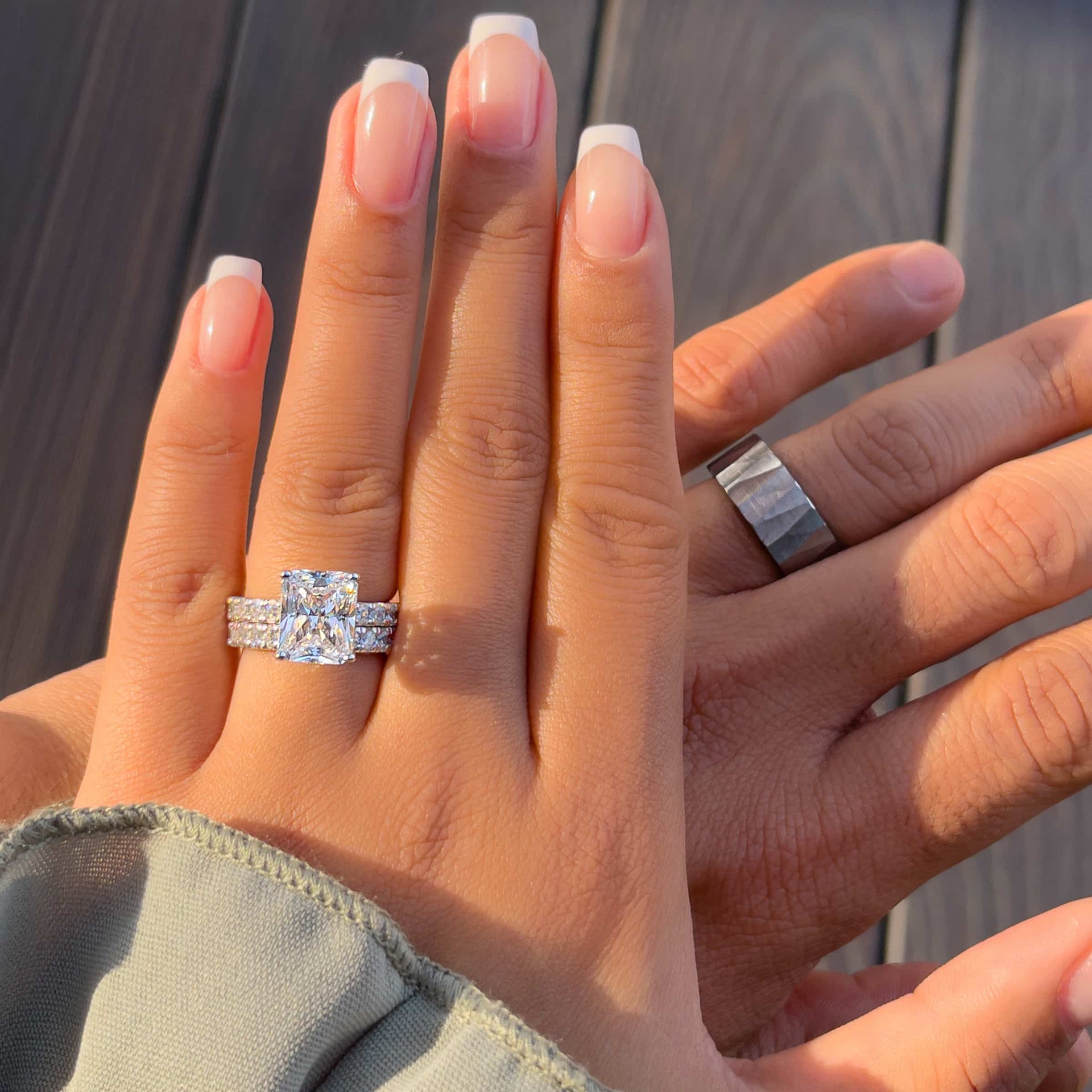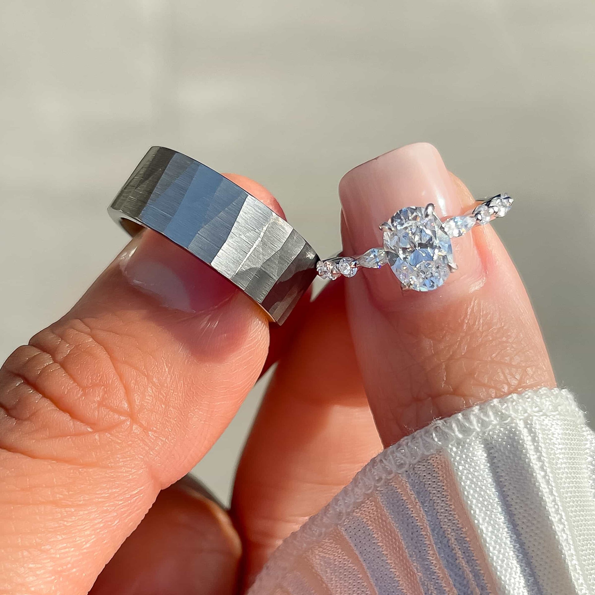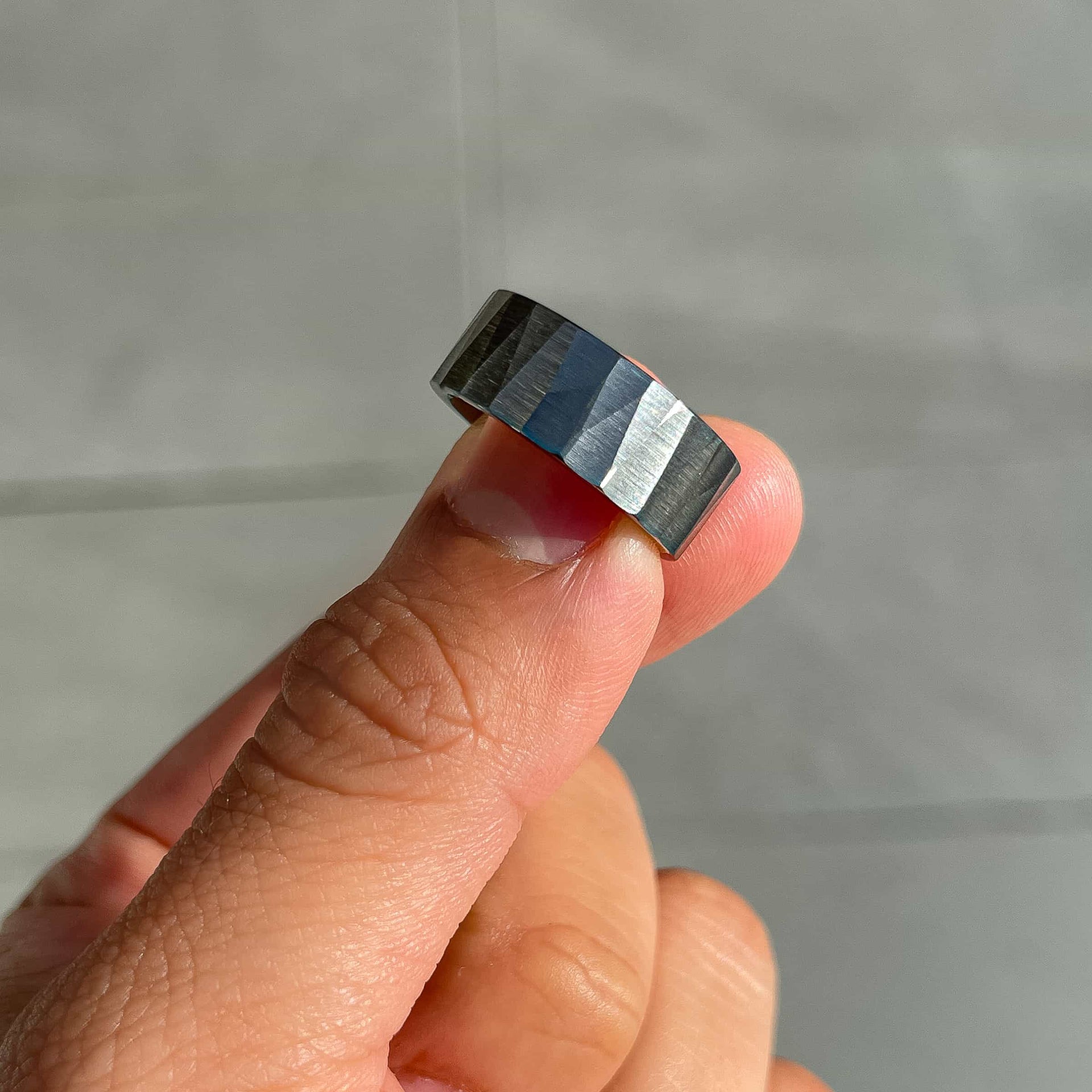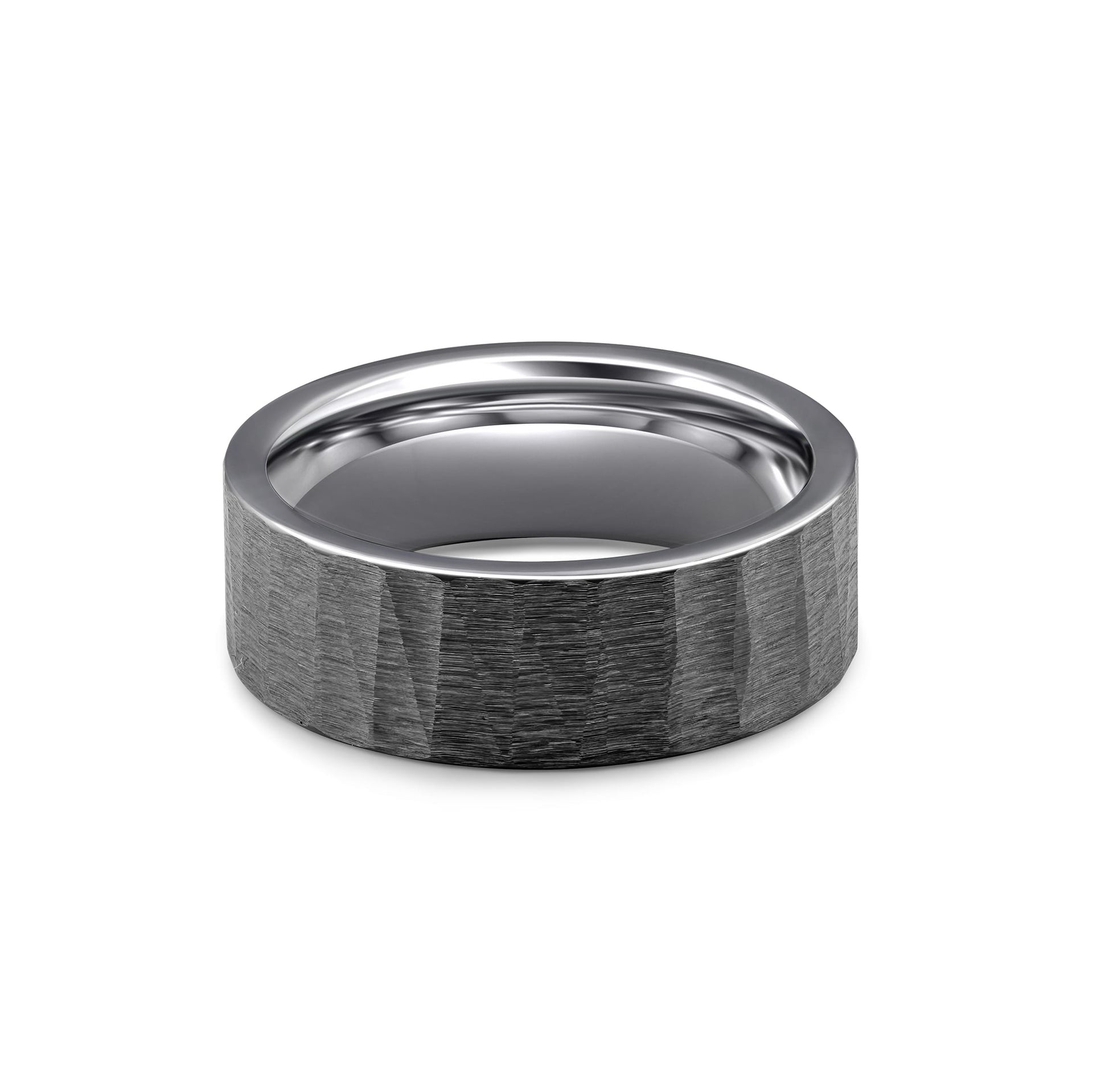 The Zeus is the answer for those looking for a wedding ring that’s tough, comfortable, and striking from all angles. This rugged wedding band is made with tungsten carbide, a metal that’s strong enough to last a lifetime and light enough for all day wear. The outside of the ring is designed with a hammered texture in a sophisticated matte finish while the interior provides a smooth and comfortable fit in sleek polished silver. The detailed lines of The Zeus create an armored pattern that match the strength and durability that this ring is built with. It combines everything you need into one ring and breaks the mold for standard bands.