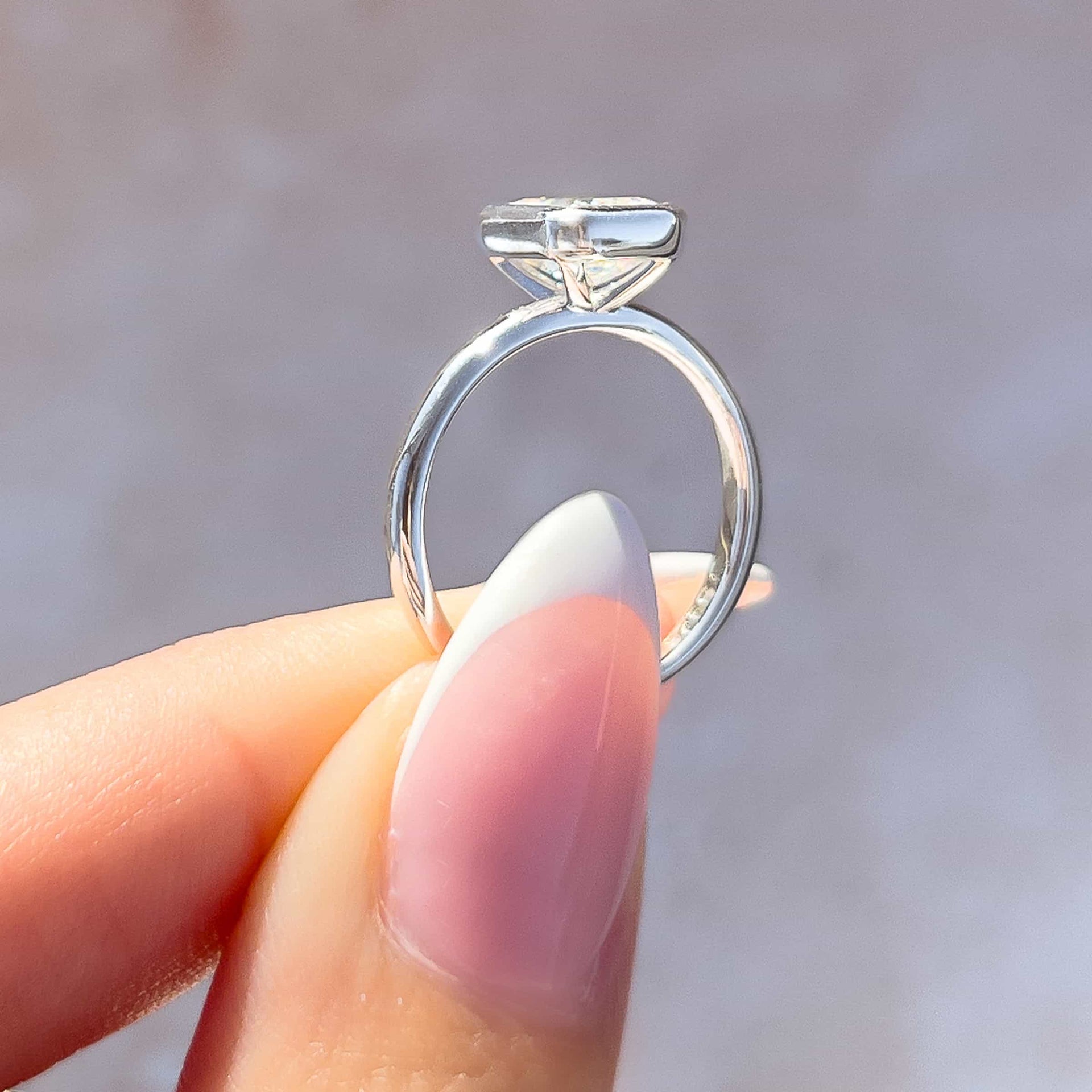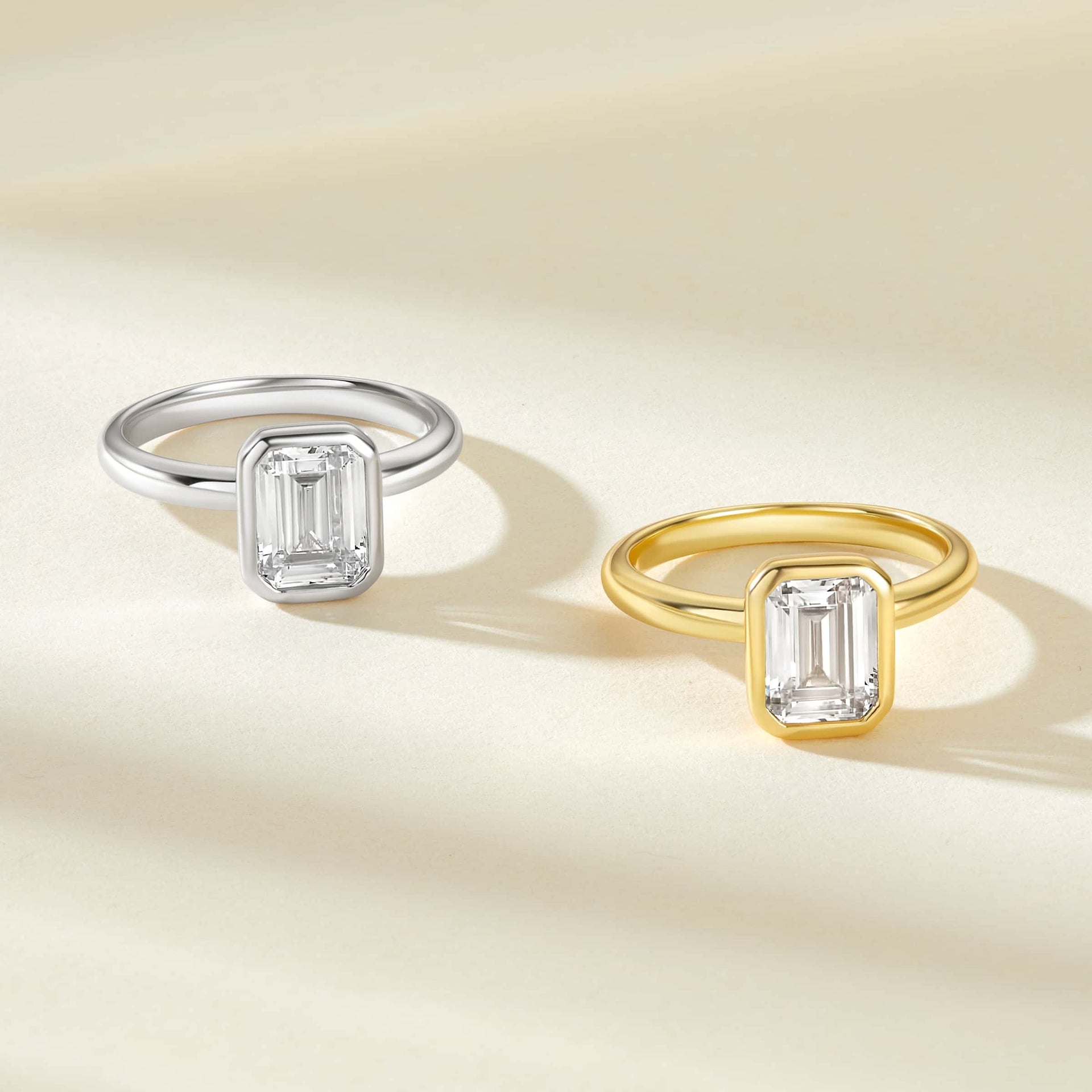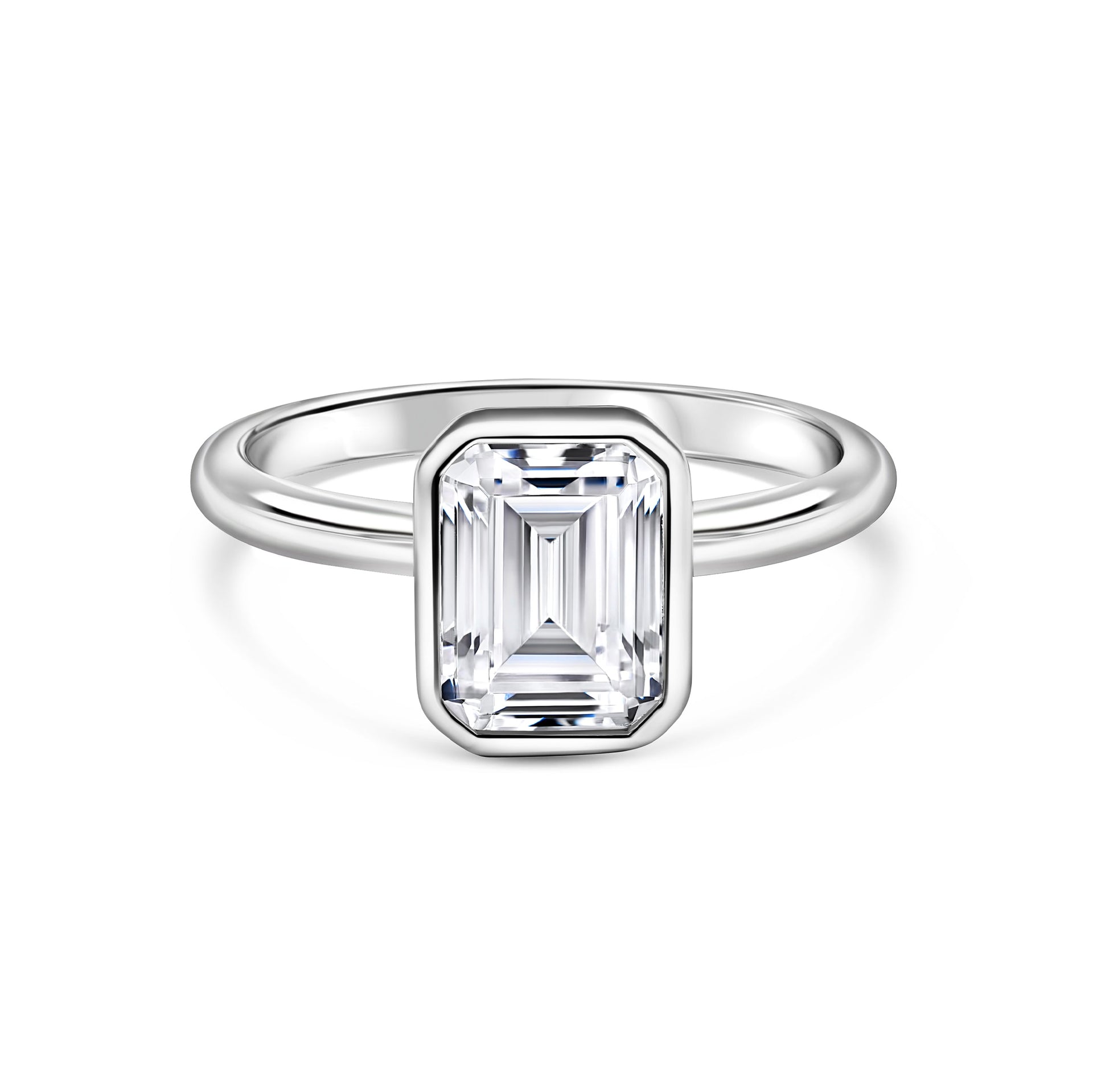 This engagement ring is the definition of modern sophistication. The Brielle is designed with a beautiful 1.5 carat emerald cut center stone encased in a bezel setting for a secure fit sitting on a 925 sterling silver solitaire band. With its cool tones and symmetric design, The Brielle is precisely what a bride needs to adorn her finger without all the added flash. But for those that still want a sparkly element to their bridal look, we recommend pairing her with The Artemis, or with The Forever bands for a stack that will blow people away. Also available in gold.