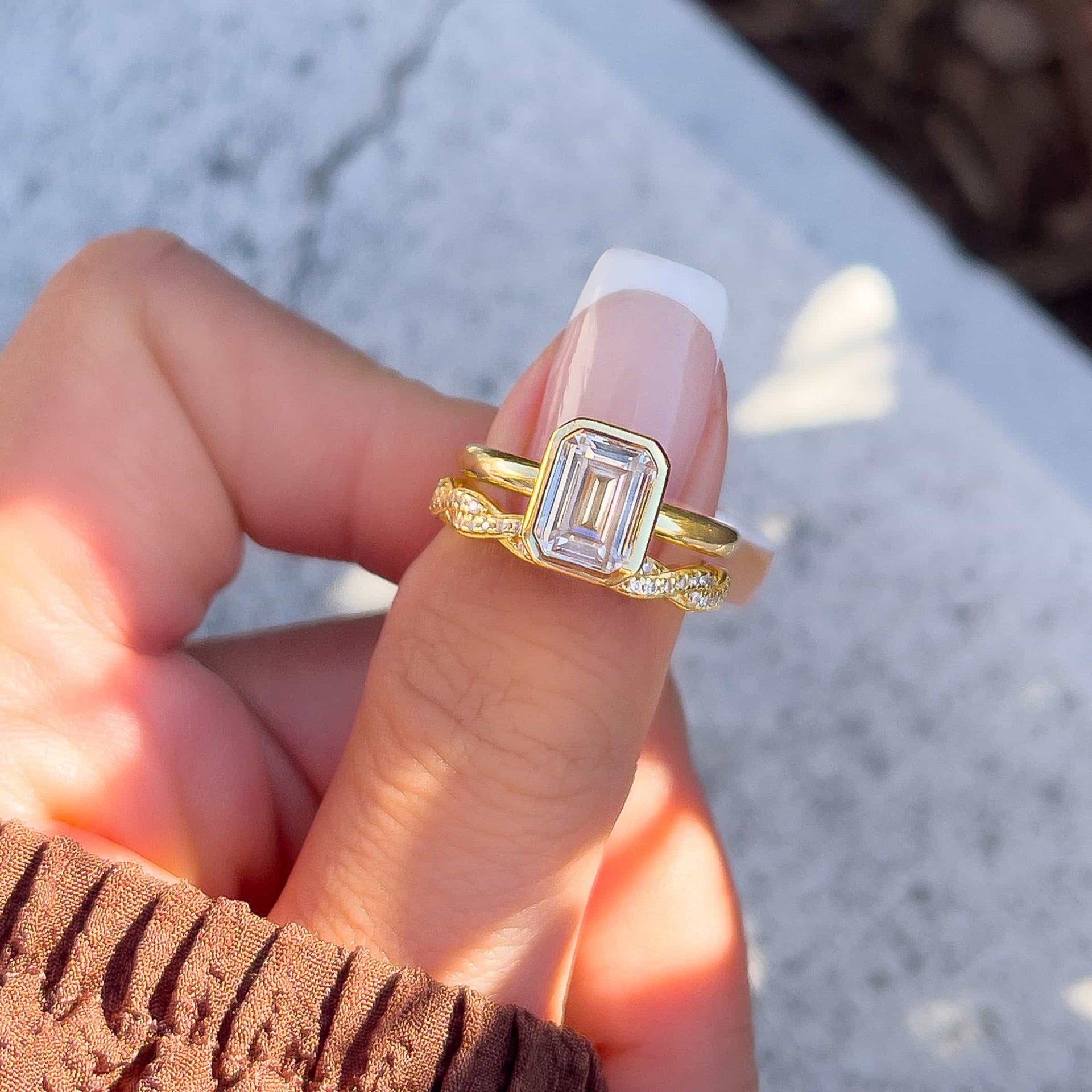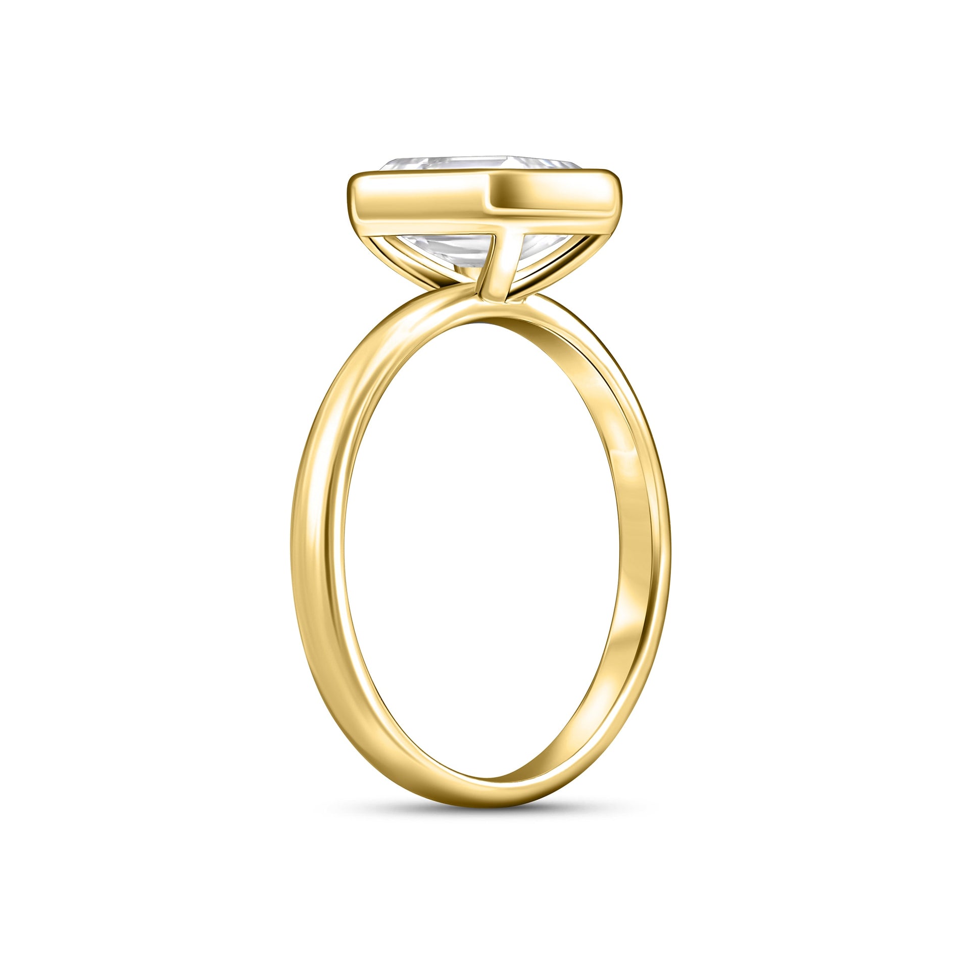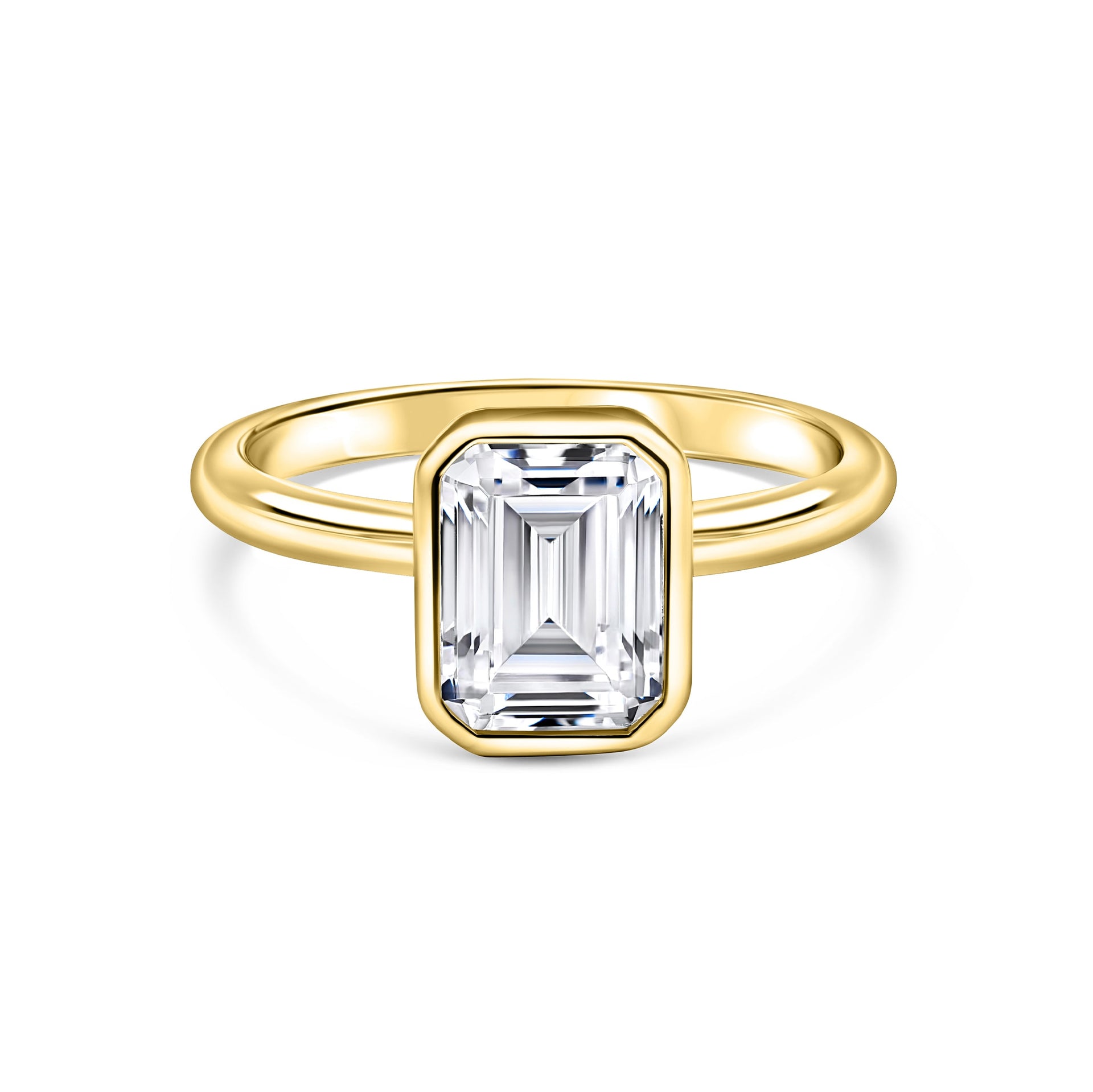 When it comes to making a statement without doing too much, The Brielle understands the assignment every time. This enchanting engagement ring features a beautiful 1.5 carat emerald cut center stone encased in a bezel setting for a secure fit sitting on a sleek gold solitaire band. It is an ideal choice for a bride that prefers intimacy over grandeur. Whether worn as an engagement ring or a daily signature piece, this ring embodies the perfect balance of minimalism and edge. And if you’re looking to add some sparkly personality to this look, we recommend pairing her with The Eternity or with The Sadie. Both of these bands will complement the ring’s simple features while also including a shimmering contrast that will make The Brielle stand out the way she is meant to. Also available in silver.