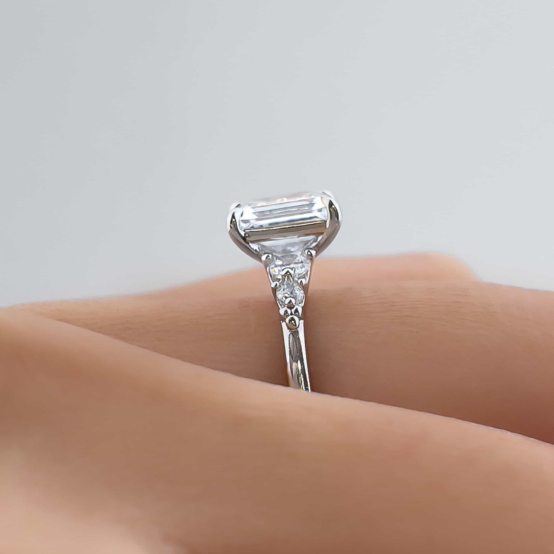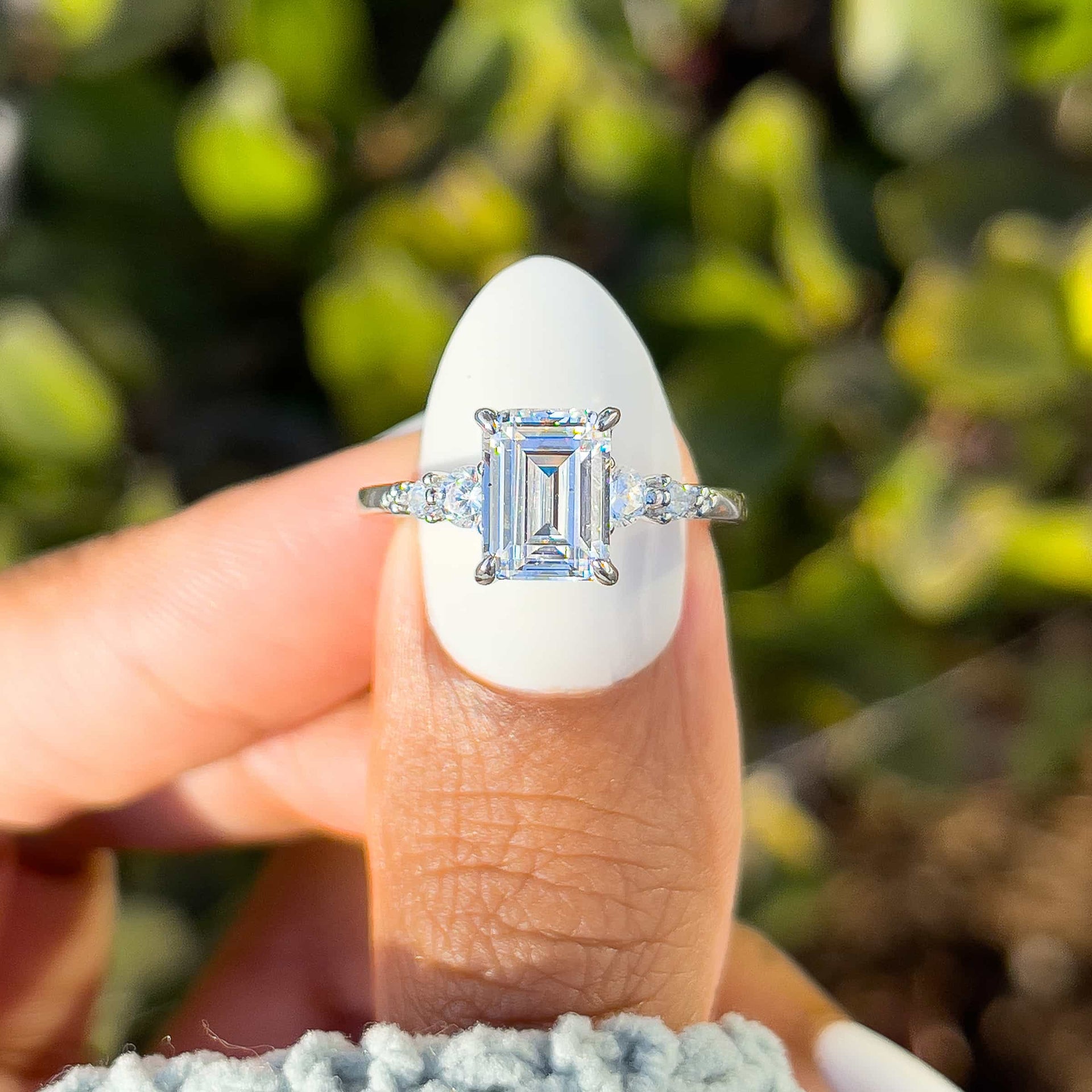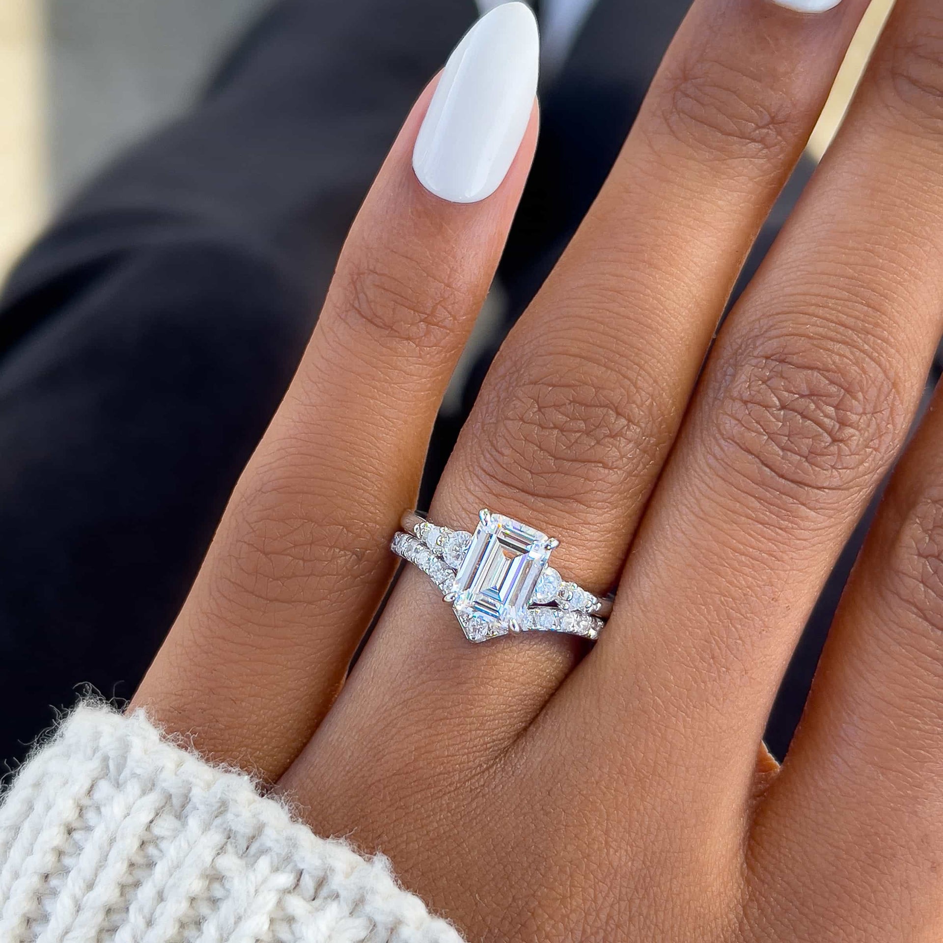 If you’re looking for a ring with effortless charm that still feels refreshingly modern, you’ll fall head over heels for The Caitlyn. This unique engagement ring is designed with a 1.5 carat conflict-free emerald cut center stone accompanied by 2 sets of dainty round cut side stones that sit perfectly on a sleek, silver solitaire band. The undeniable elegance of the emerald cut pairs seamlessly with its brilliant round cut side stones, adding a gorgeous touch of shimmer without overshadowing the star of the show. The symmetry and brilliance of The Caitlyn make it versatile enough to wear it with any of our minimalist bands or even our intricate stacks. Some of our favorite bands to see her with include The Adeline, The Alia, or The Zoey stacking set– but you truly can’t go wrong with any from our collection. Also available in gold.
