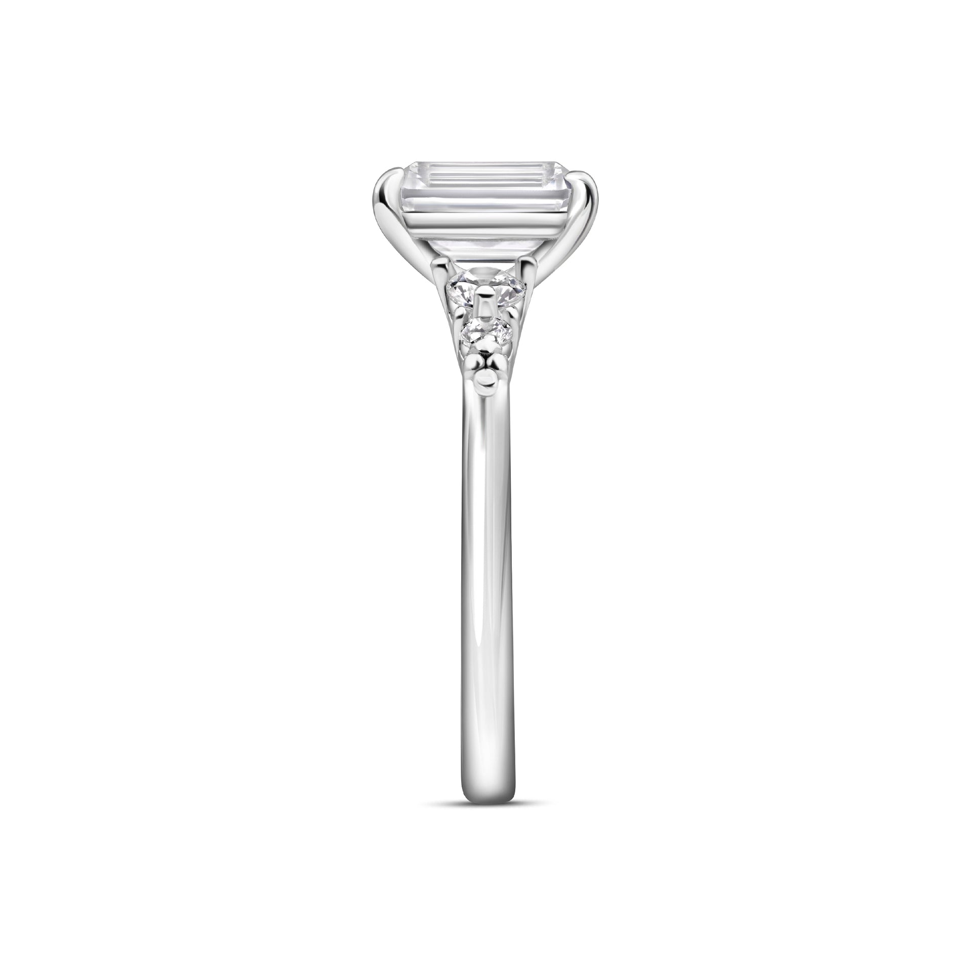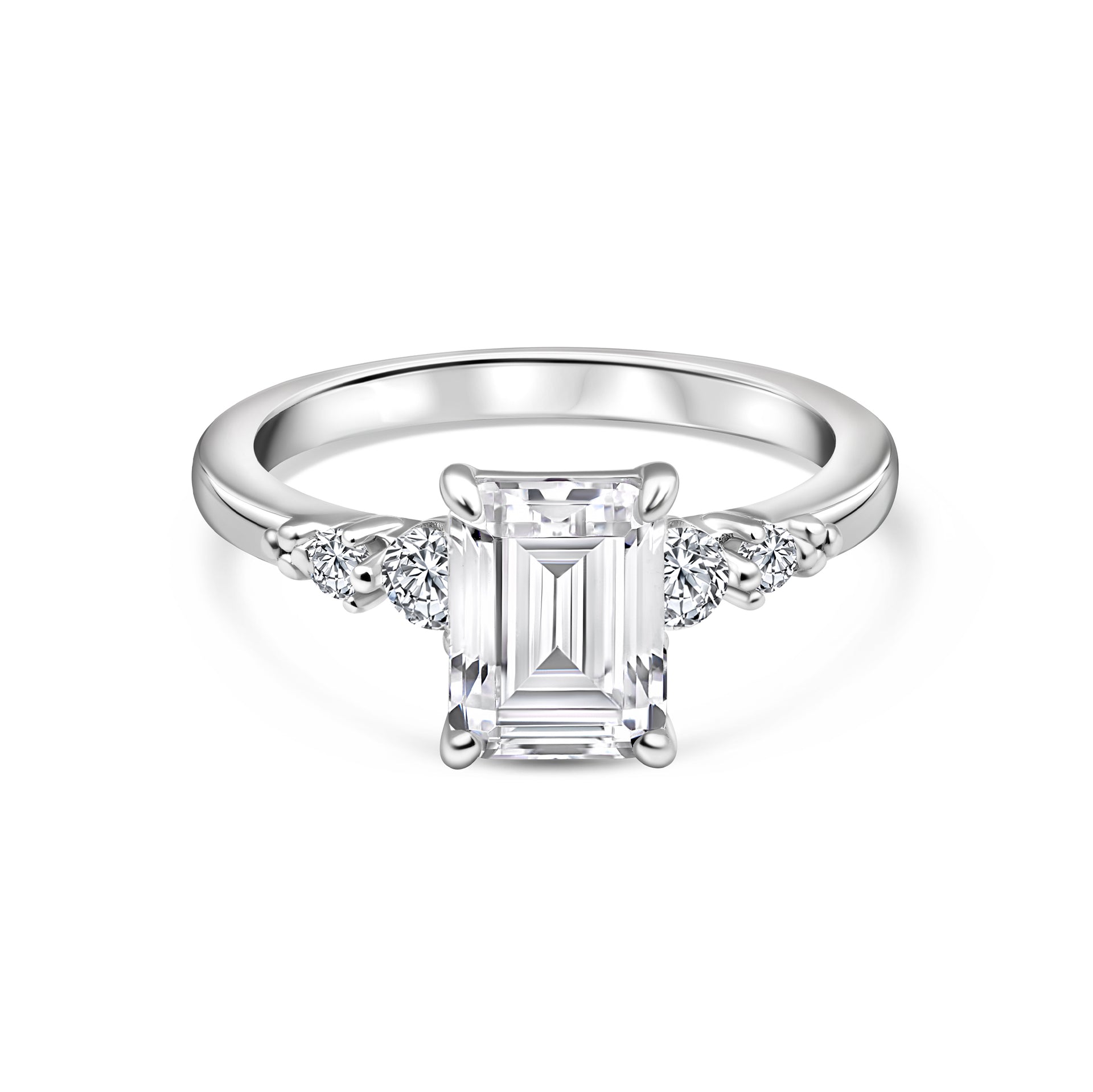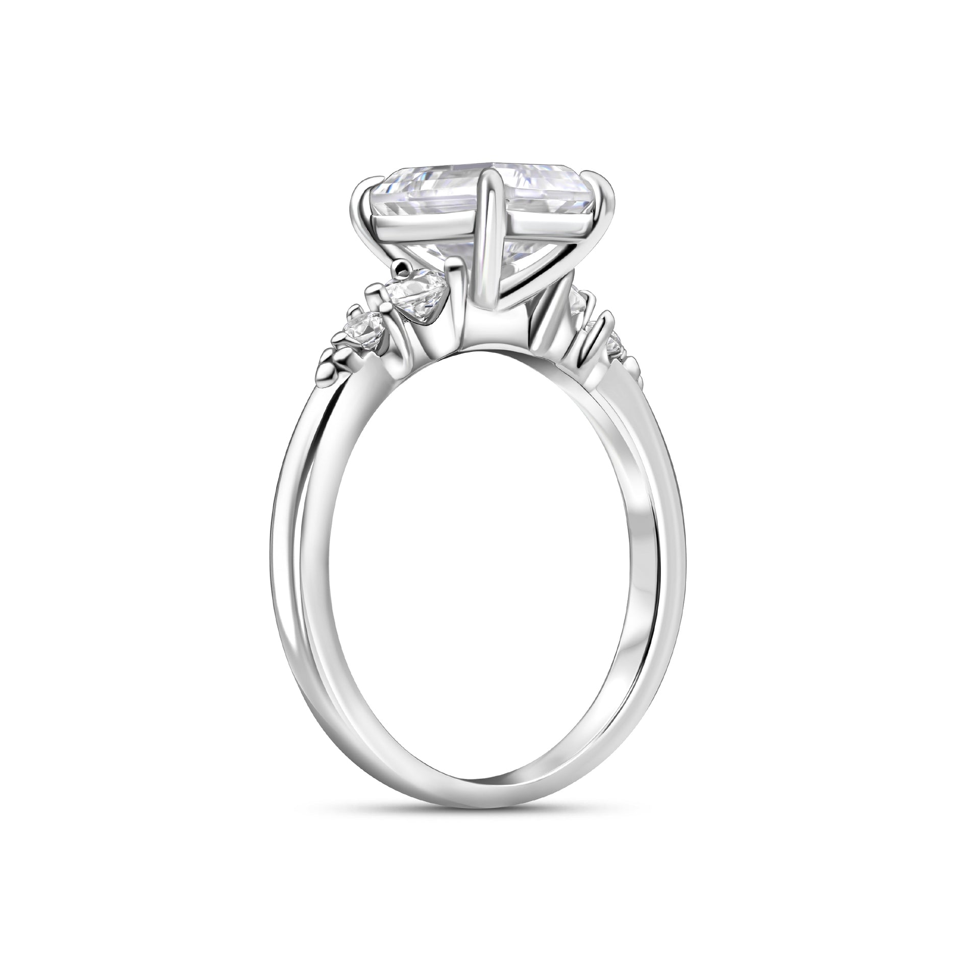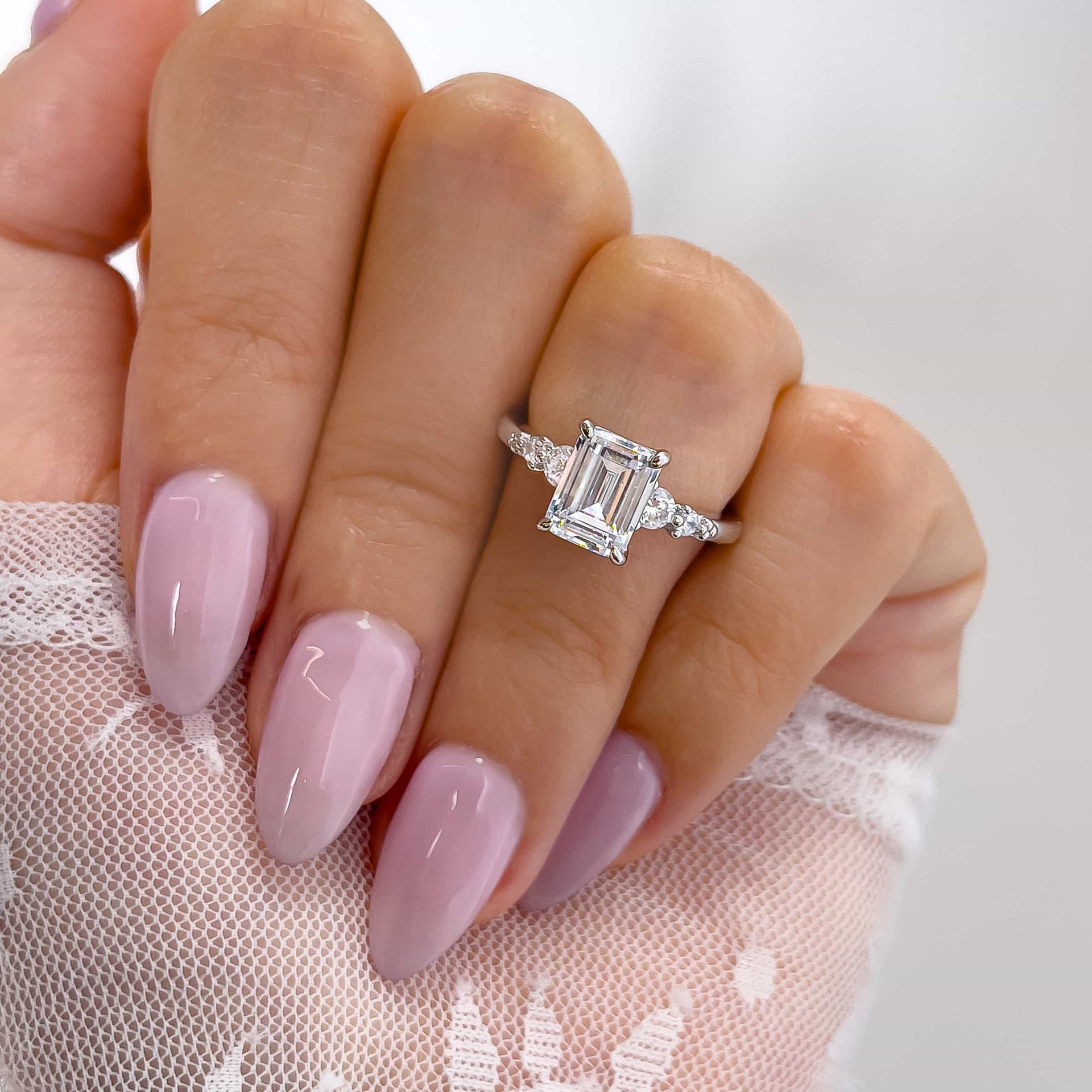 If you’re looking for a ring with effortless charm that still feels refreshingly modern, you’ll fall head over heels for The Caitlyn. This unique engagement ring is designed with a 1.5 carat conflict-free emerald cut center stone accompanied by 2 sets of dainty round cut side stones that sit perfectly on a sleek, silver solitaire band. The undeniable elegance of the emerald cut pairs seamlessly with its brilliant round cut side stones, adding a gorgeous touch of shimmer without overshadowing the star of the show. The symmetry and brilliance of The Caitlyn make it versatile enough to wear it with any of our minimalist bands or even our intricate stacks. Some of our favorite bands to see her with include The Adeline, The Alia, or The Zoey stacking set– but you truly can’t go wrong with any from our collection. Also available in gold.