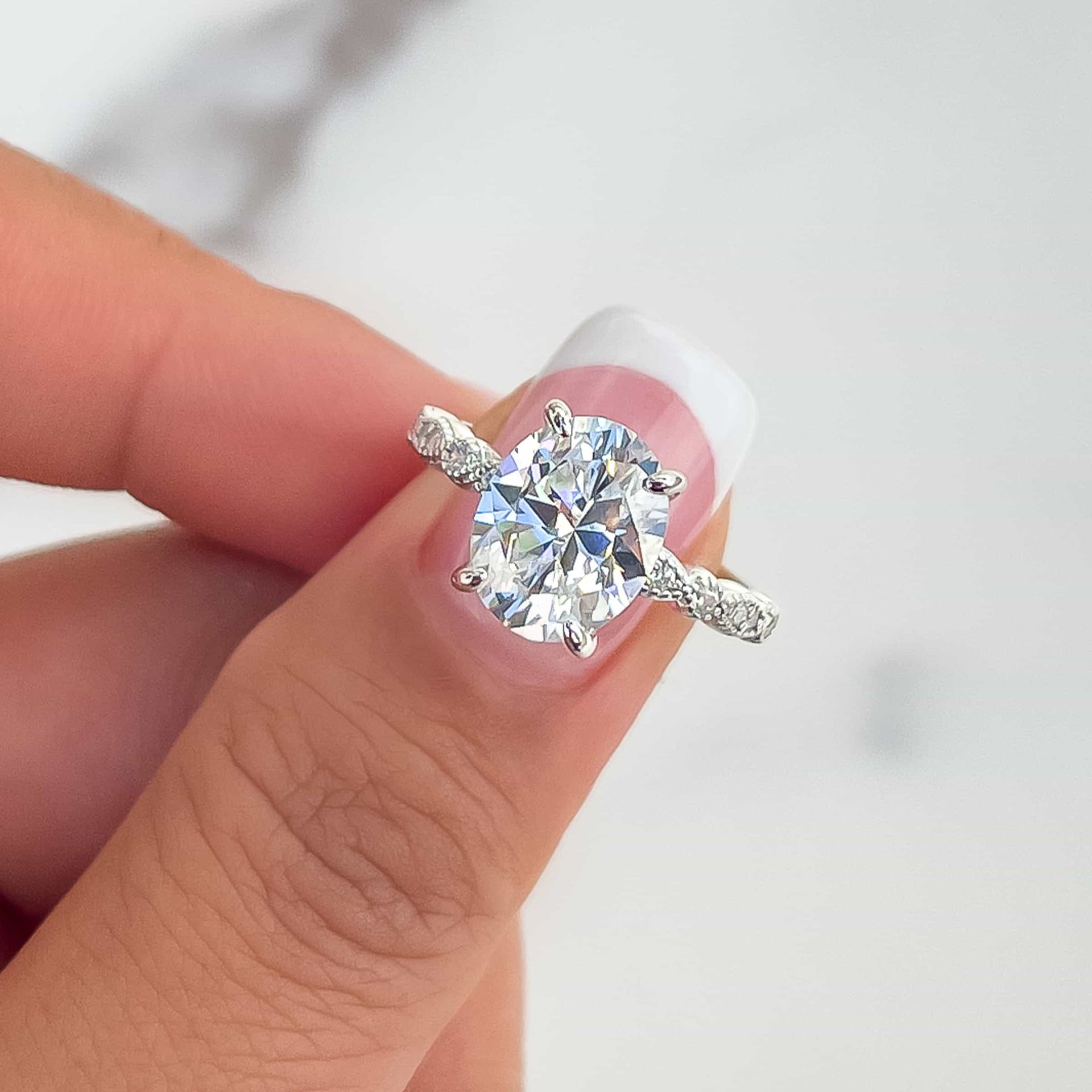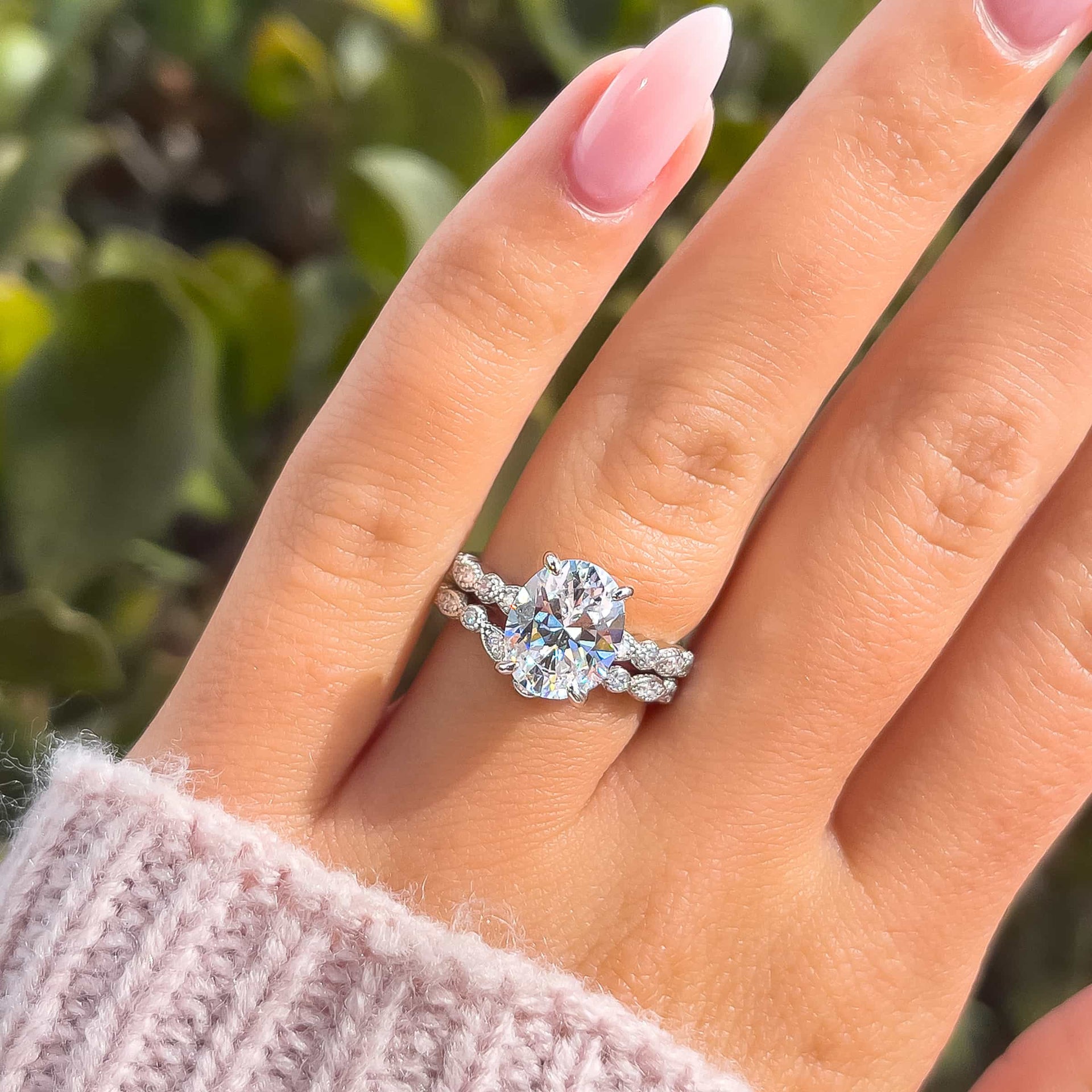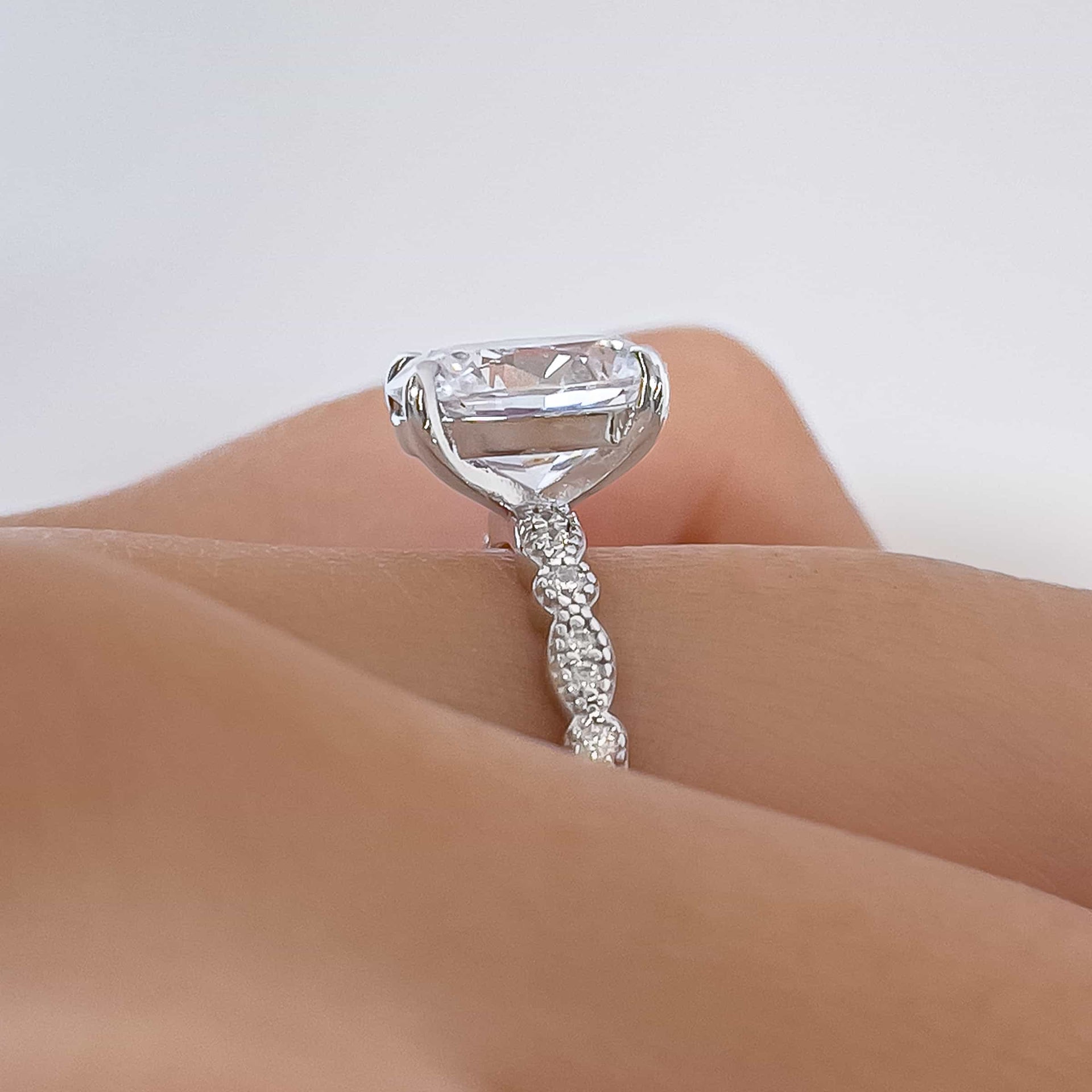 This engagement ring simply feels like a vintage dream. The Delaney is crafted with a jaw dropping 3 carat oval cut conflict-free center stone that’s complimented by a unique half eternity band made in a milgrain design with a sleek 925 sterling silver finish. The Delaney’s textured band adds brilliant detailing that creates a vintage bridal look while still preserving a modern and elegant style. The size of the center stone also provides a sparkle that is larger than life, making this engagement ring the complete package for the bride who wants a dazzling statement piece with a classic touch. And if you can’t get enough of the textured band design, pair this beauty with The Adeline for an ultra vintage look, or stack her with The Promise stacking set for a dazzling triple threat. Also available in gold.