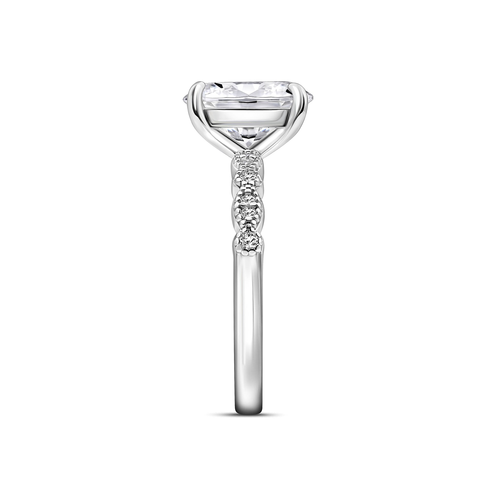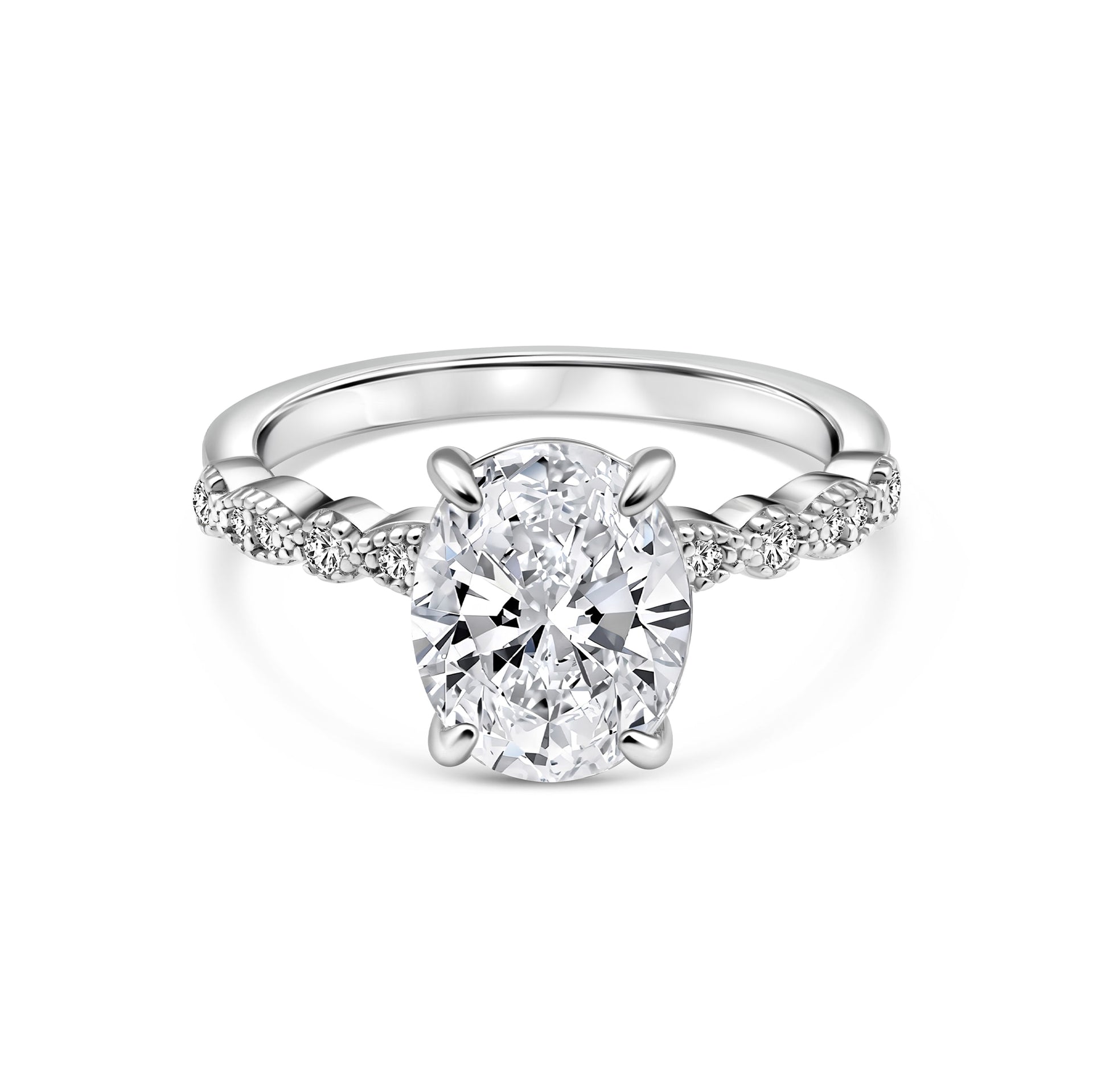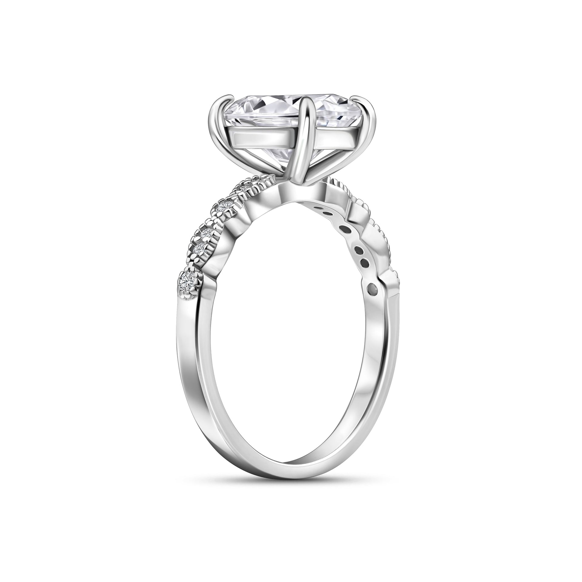 This engagement ring simply feels like a vintage dream. The Delaney is crafted with a jaw dropping 3 carat oval cut conflict-free center stone that’s complimented by a unique half eternity band made in a milgrain design with a sleek 925 sterling silver finish. The Delaney’s textured band adds brilliant detailing that creates a vintage bridal look while still preserving a modern and elegant style. The size of the center stone also provides a sparkle that is larger than life, making this engagement ring the complete package for the bride who wants a dazzling statement piece with a classic touch. And if you can’t get enough of the textured band design, pair this beauty with The Adeline for an ultra vintage look, or stack her with The Promise stacking set for a dazzling triple threat. Also available in gold.