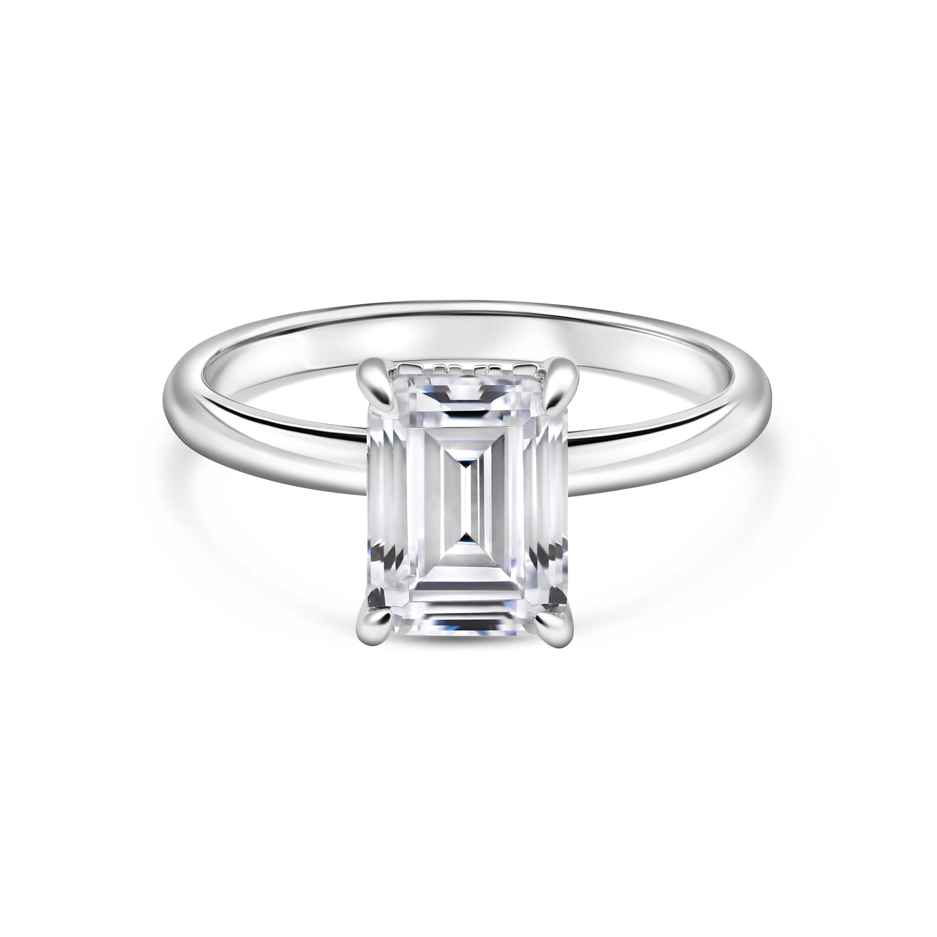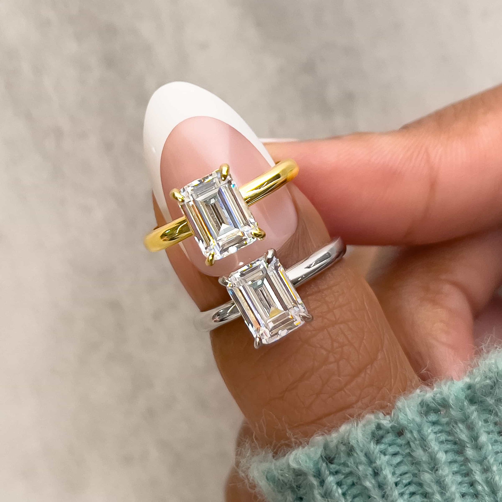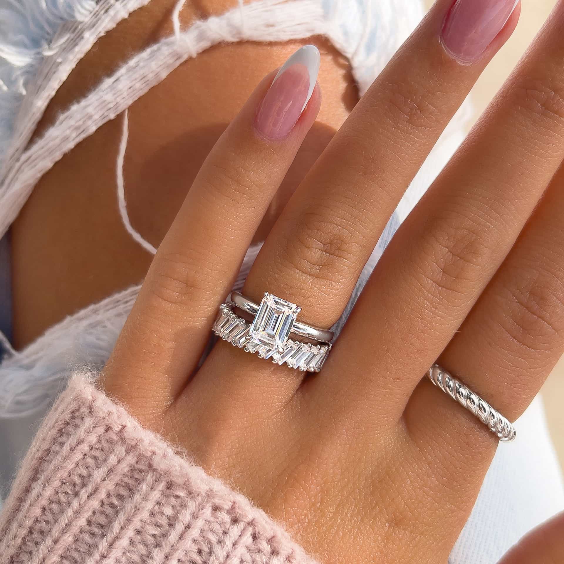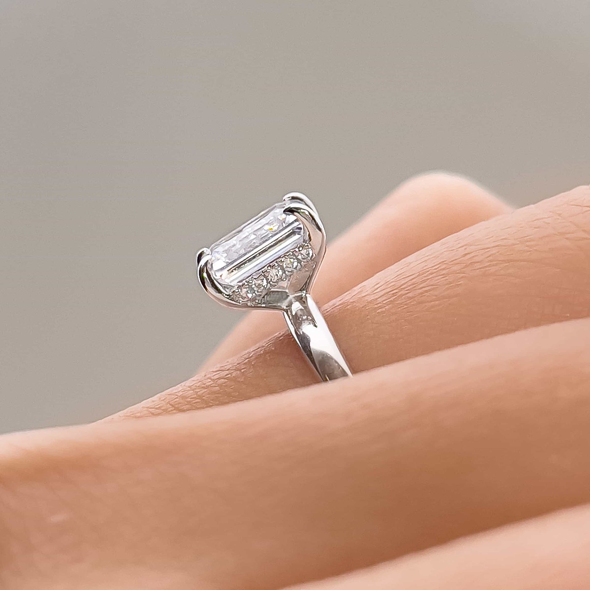 Meet the engagement keep you and everyone around you staring! The Destiny is an eye-catching, 1.5 carat emerald cut ring with a gorgeous hidden halo on a silver solitaire band. This mesmerizing conflict-free center stone is beautifully crafted with symmetrical lines that draw the eyes inward, adding the perfect touch of radiance and sophistication to your finger. The stunning silhouette of this ring pairs perfectly with The Artemis to create a shimmering pattern of stones that elegantly complement your finger, or stack it with The Adeline if you’re searching for that vintage feeling. Also available in gold.