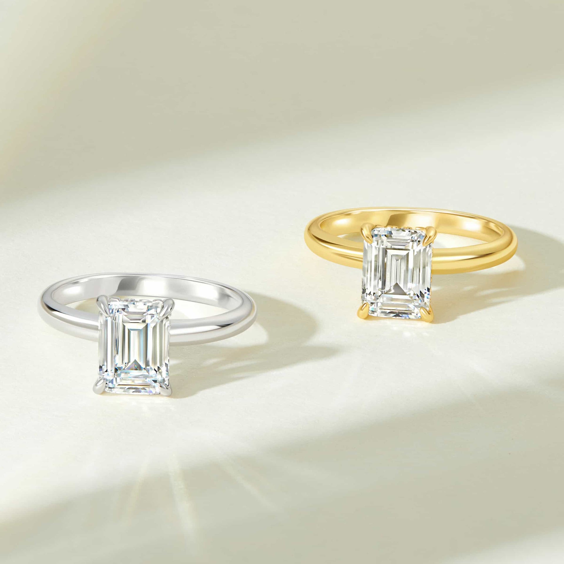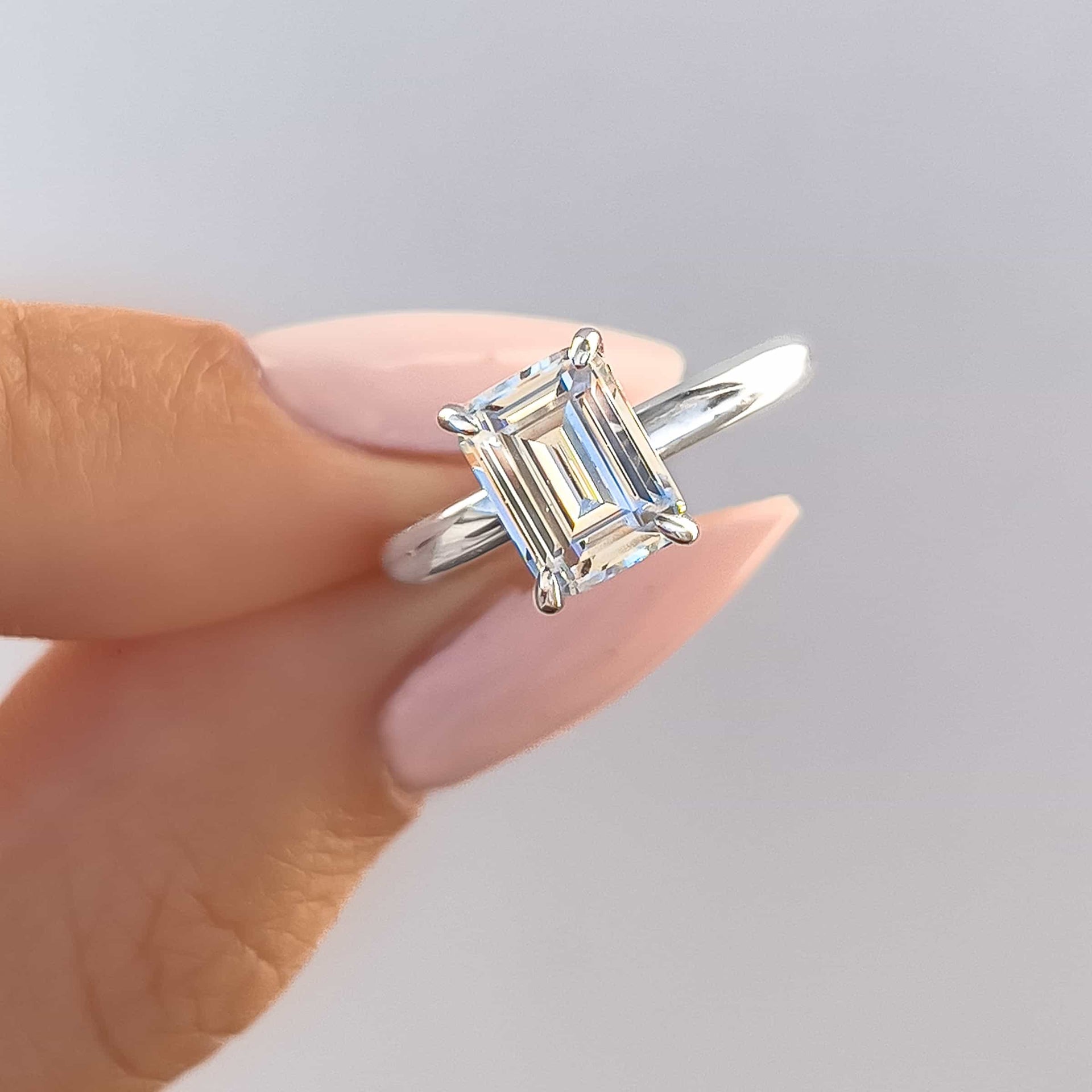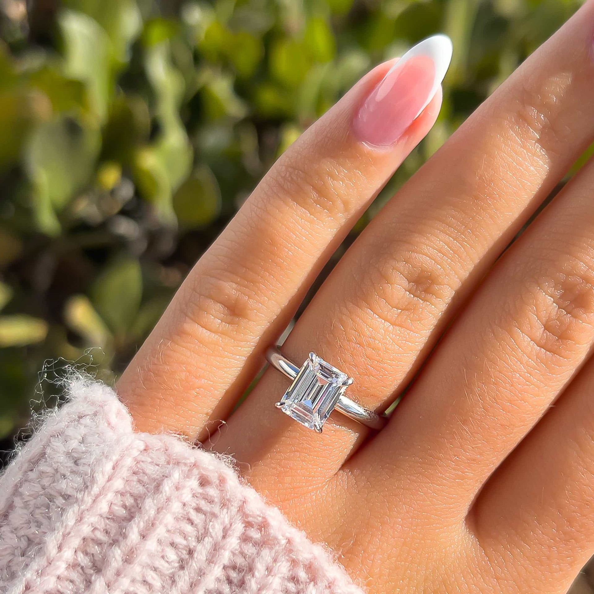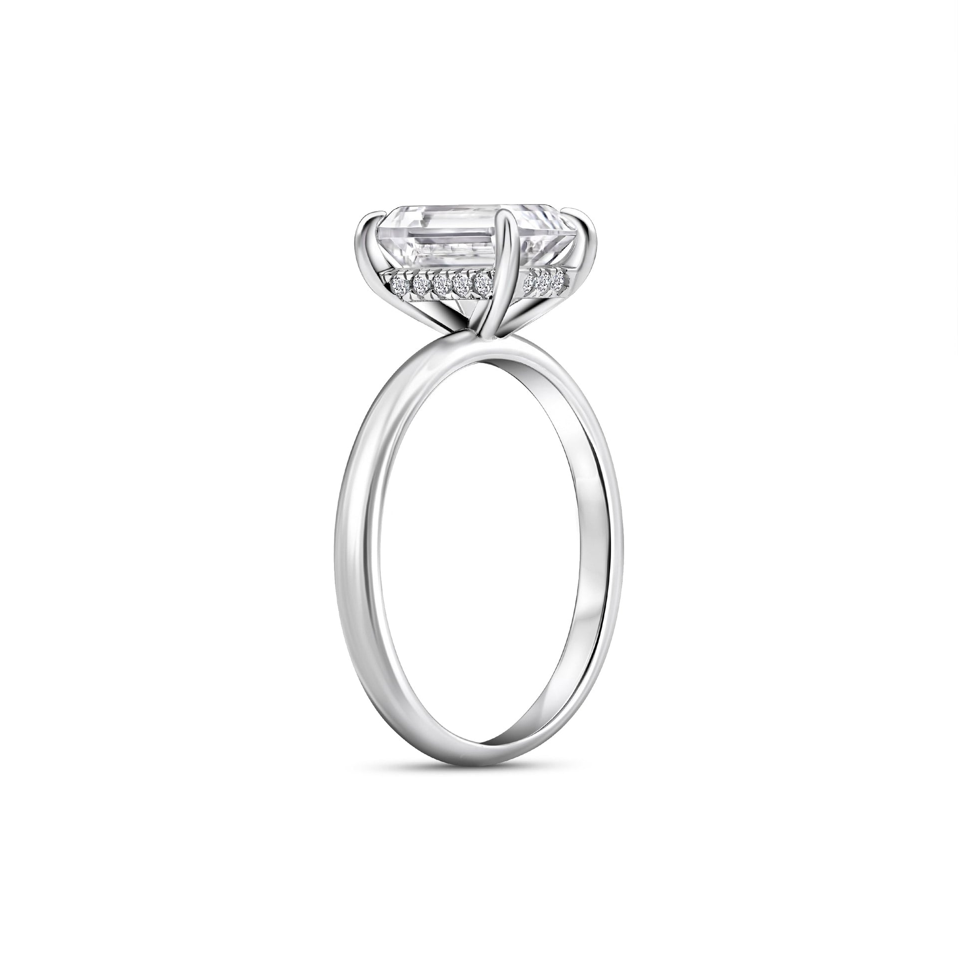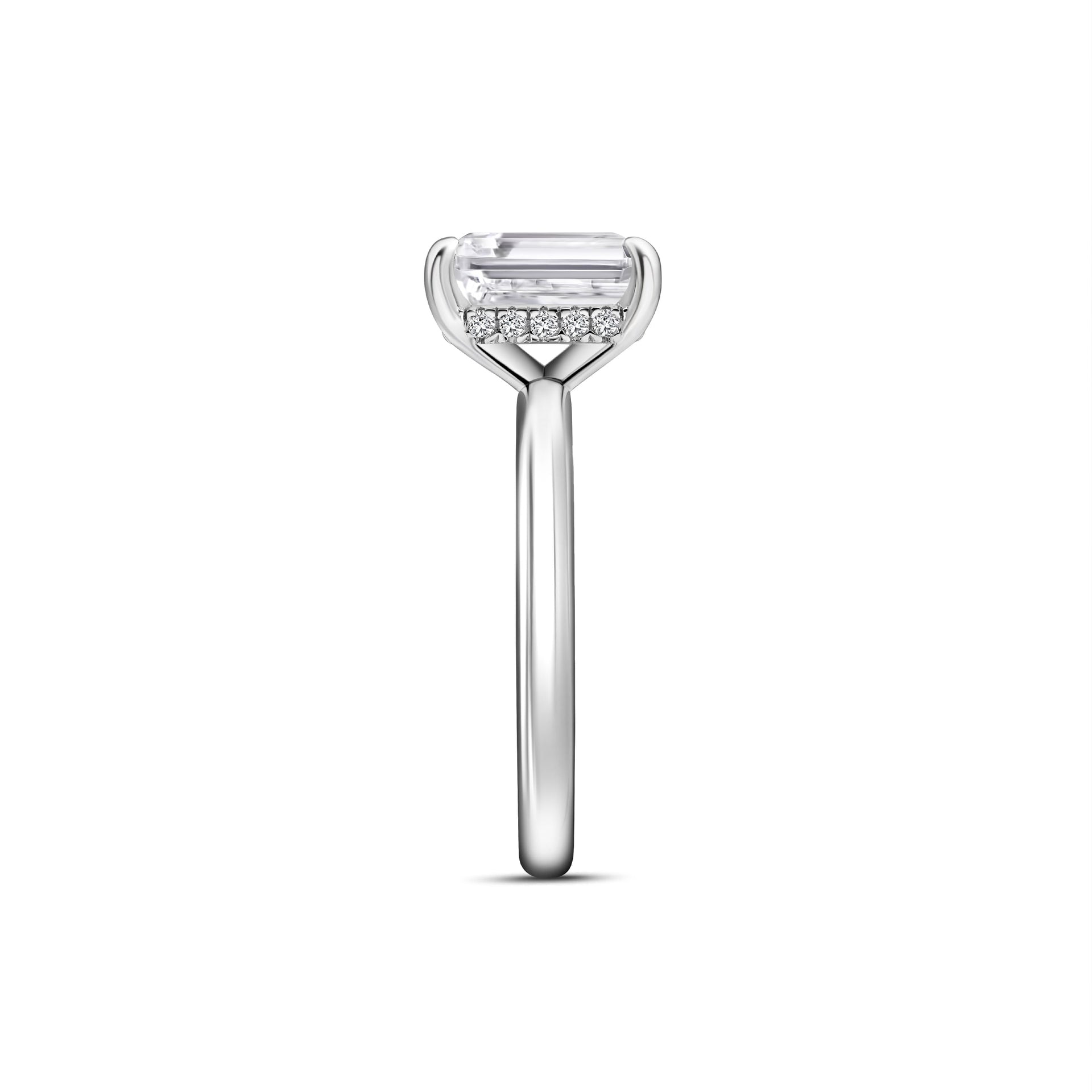 Meet the engagement keep you and everyone around you staring! The Destiny is an eye-catching, 1.5 carat emerald cut ring with a gorgeous hidden halo on a silver solitaire band. This mesmerizing conflict-free center stone is beautifully crafted with symmetrical lines that draw the eyes inward, adding the perfect touch of radiance and sophistication to your finger. The stunning silhouette of this ring pairs perfectly with The Artemis to create a shimmering pattern of stones that elegantly complement your finger, or stack it with The Adeline if you’re searching for that vintage feeling. Also available in gold.