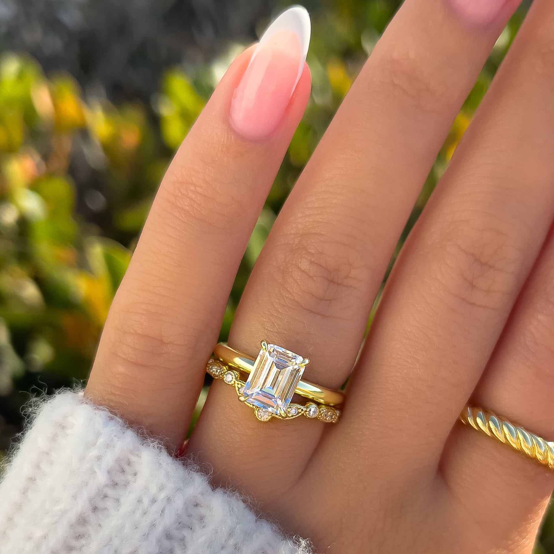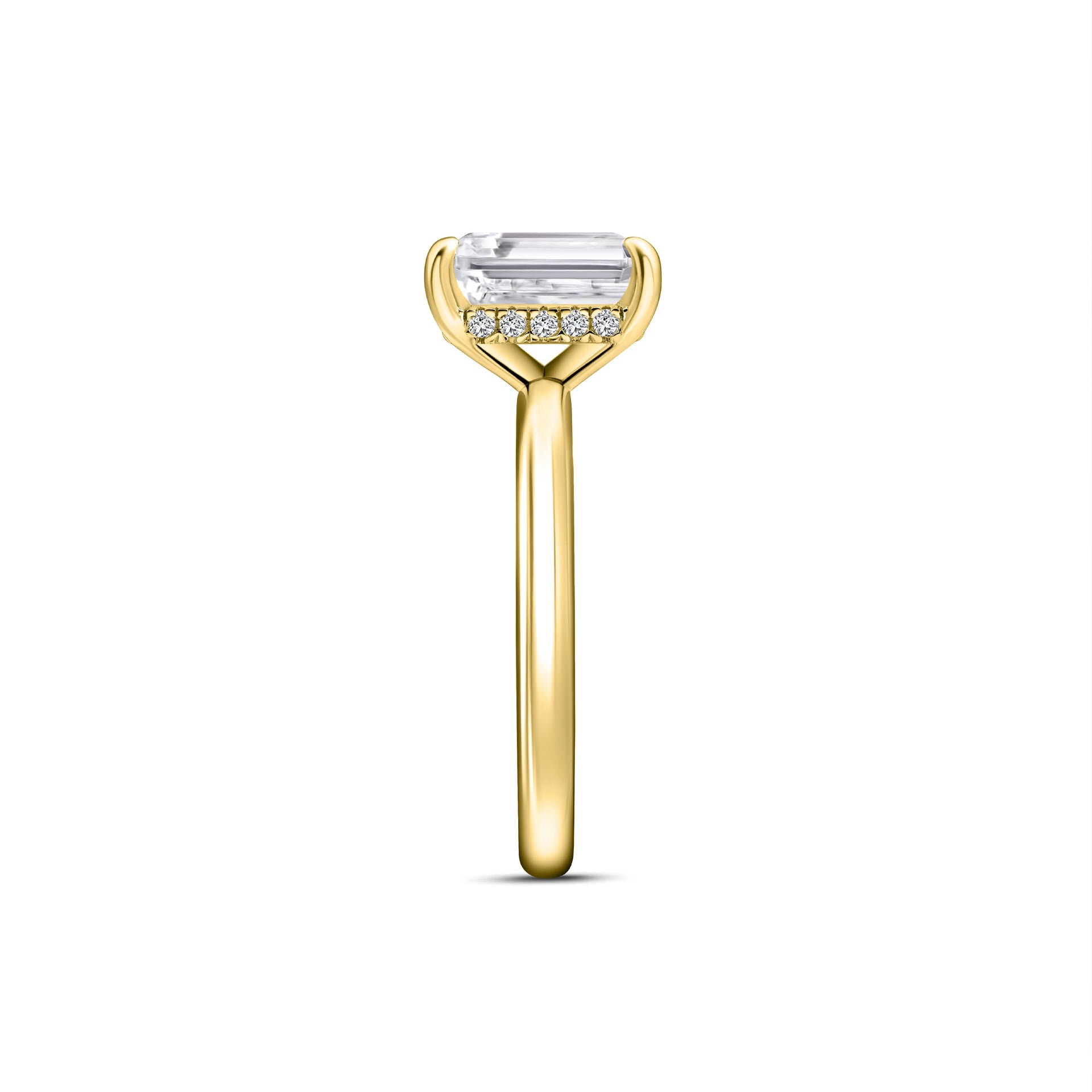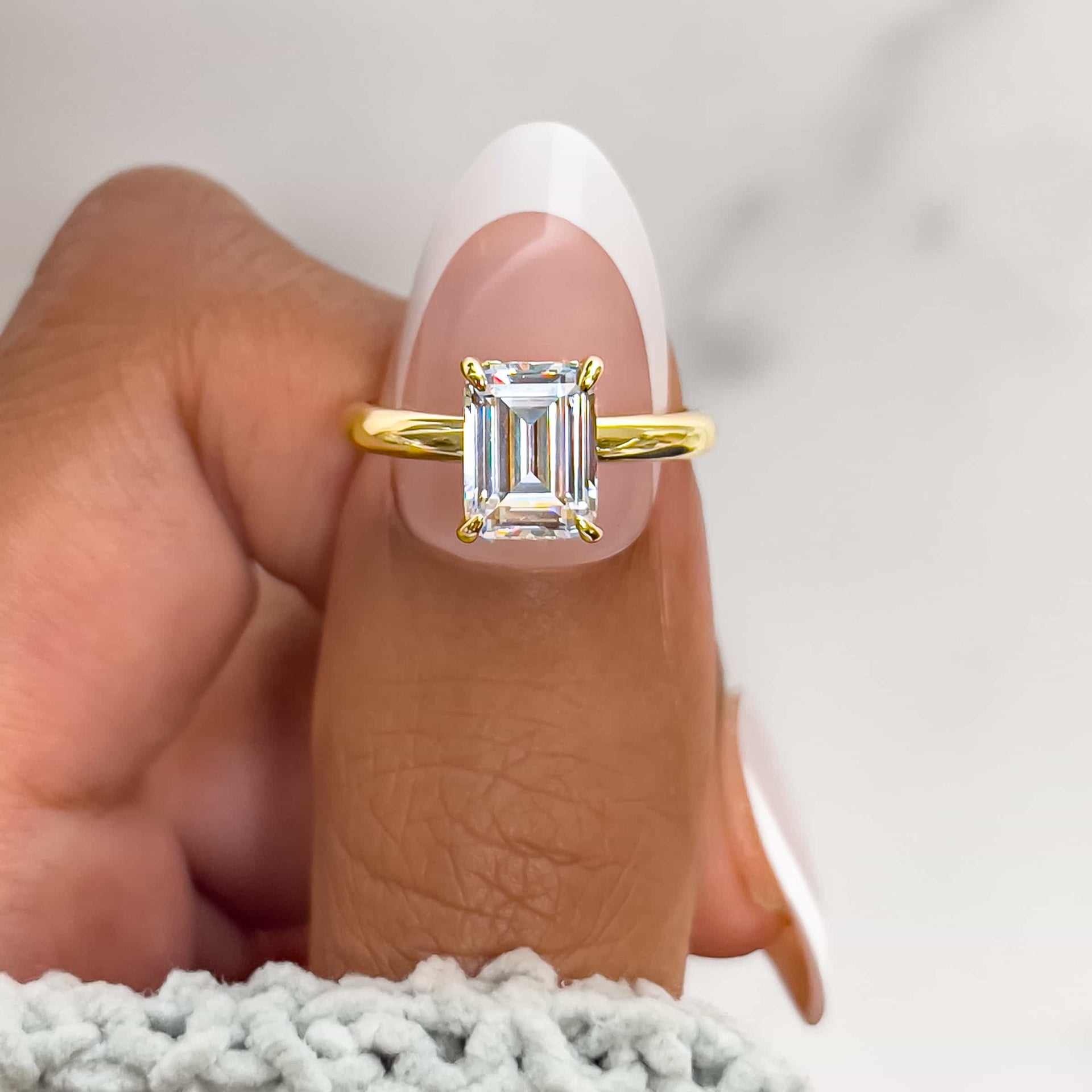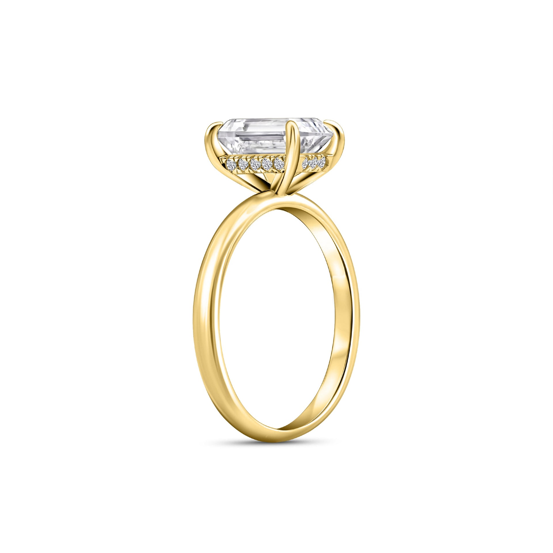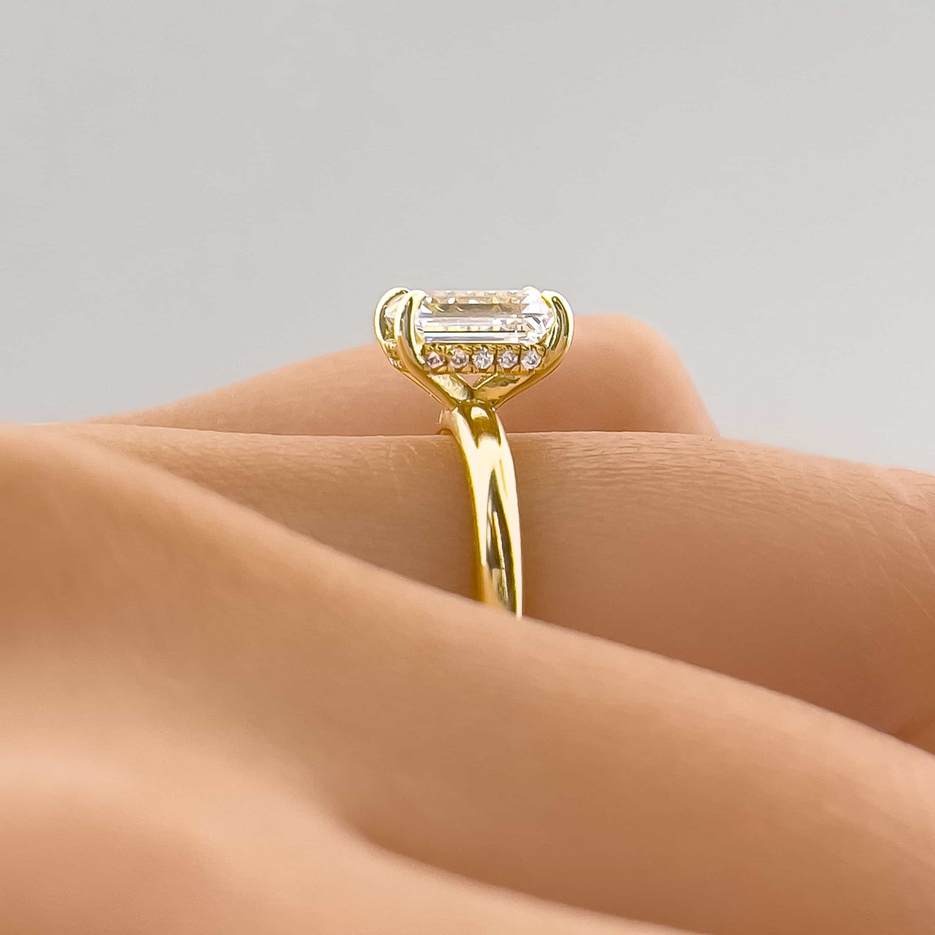 A timeless and traditional design meets modern luxury. The Destiny is a gold engagement ring crafted with a 1.5 carat conflict-free center stone and a shimmering hidden halo that sits beautifully on a solitaire band. This classic ring design offers a warm golden glow that radiates off the band’s smooth surface while the dainty emerald cut stone provides a brilliant sparkle from every angle. The elongated shape of this stone feels like it was meant to be stacked with The Zoey band for a picture perfect pairing, or even with The Promise band to add a glimmering accent. Also available in 925 sterling silver