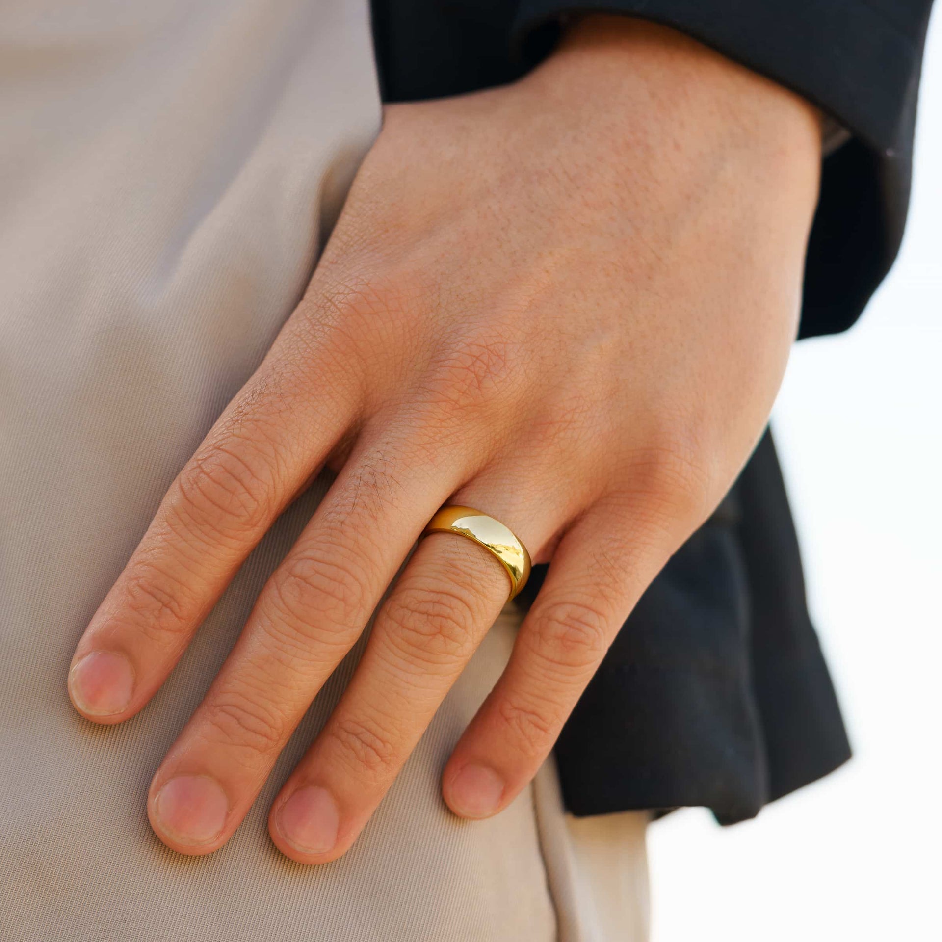 There’s nothing quite like the reflective shine of a golden glowing wedding ring. The Horizon is a unisex band that takes tradition to the next level with a minimalist yet striking design that’s perfect for every style. Crafted from stainless steel with a wide diameter and a vibrant gold finish, The Horizon brings you a wedding band that is both bold and timeless. Its sleek and gender neutral design ensures it fits seamlessly into any wardrobe, whether you’re dressing it up or keeping it casual. As a wedding band or daily accessory, this ring is all about making a statement—without saying a word. Also available in gold, silver, and black colors.