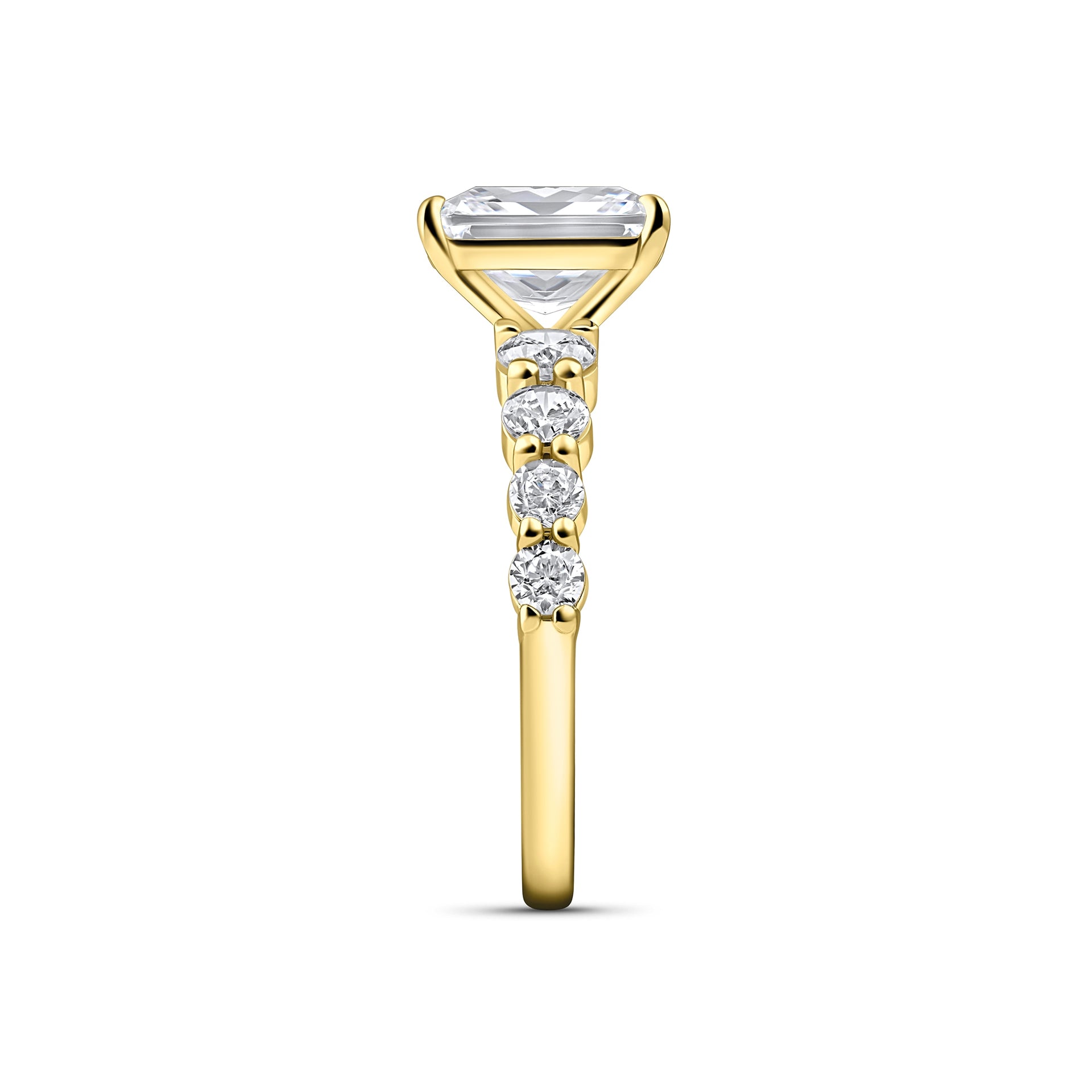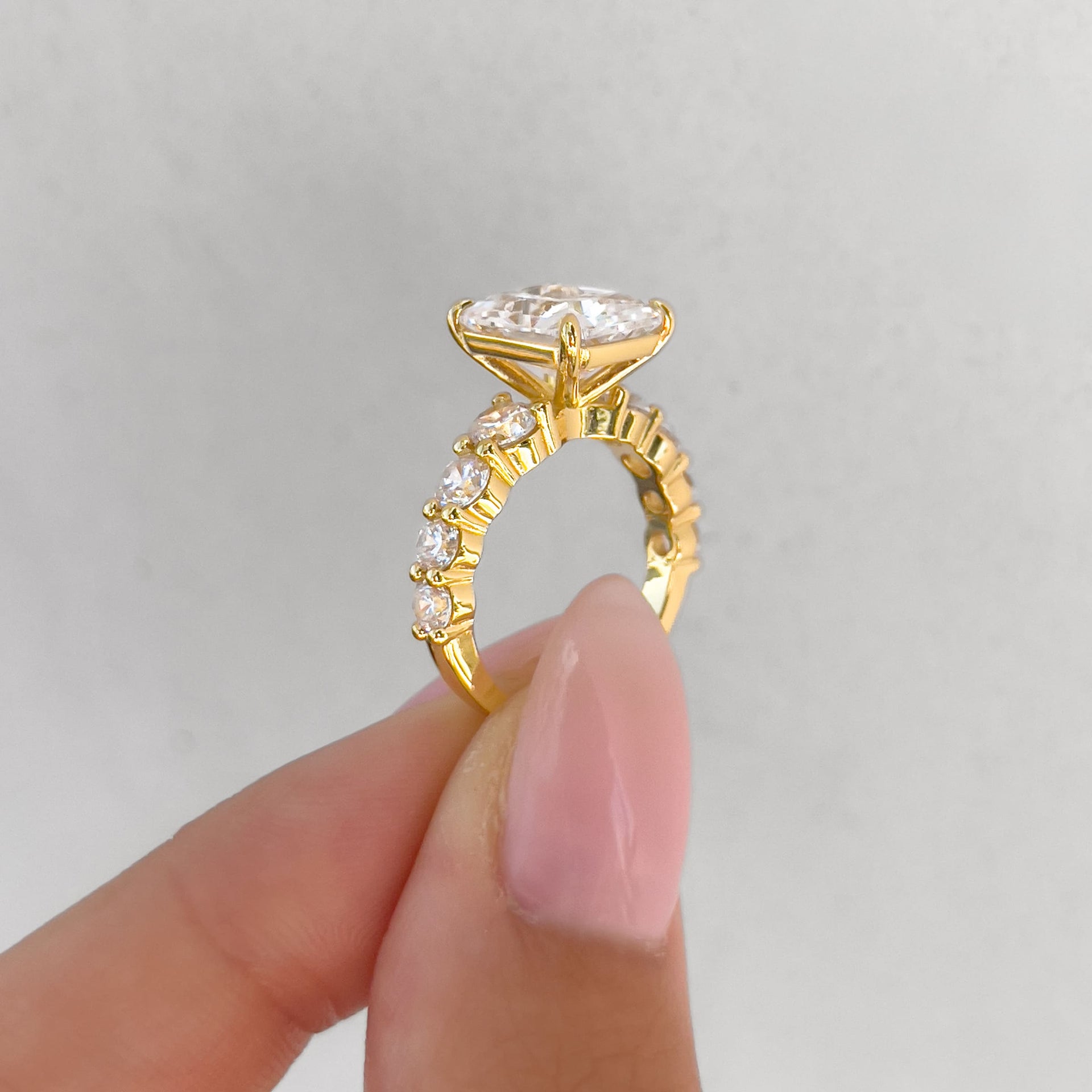 For those who love a bold center piece with a little extra brilliance. The Meredith is a gold engagement ring with a 4 carat radiant cut center stone and a half eternity band made of dainty round cut stones that taper elegantly for a cascading effect. This beautiful row of stones sits perfectly on a polished yellow gold that feels timeless and ready for any moment. With a bold radiant cut front and center and a glowing lineup of round side stones, this design is all about contrast that works. The possibilities are endless with The Meredith. It pairs seamlessly with any of our bands and even stuns on her own, but some of our favorites to see it with are The Artemis and The Eternity. Also available in silver.