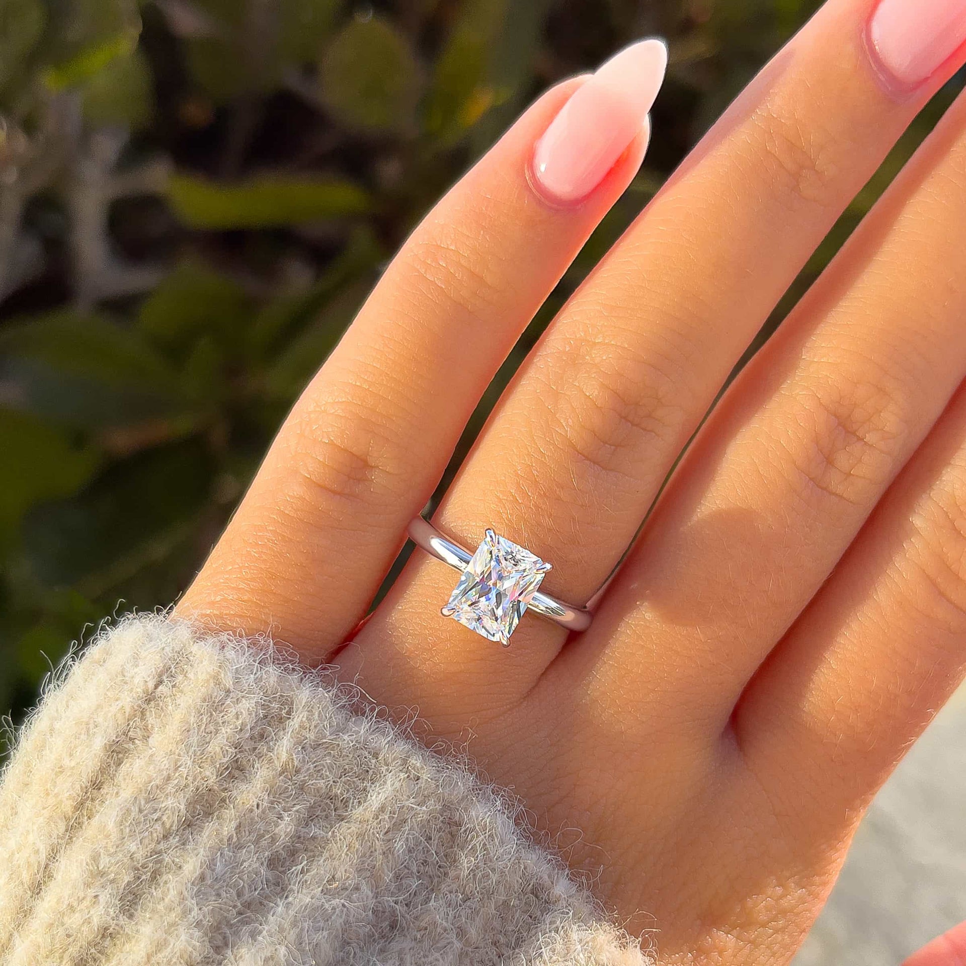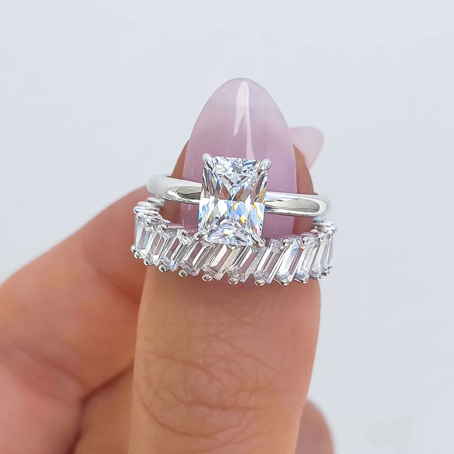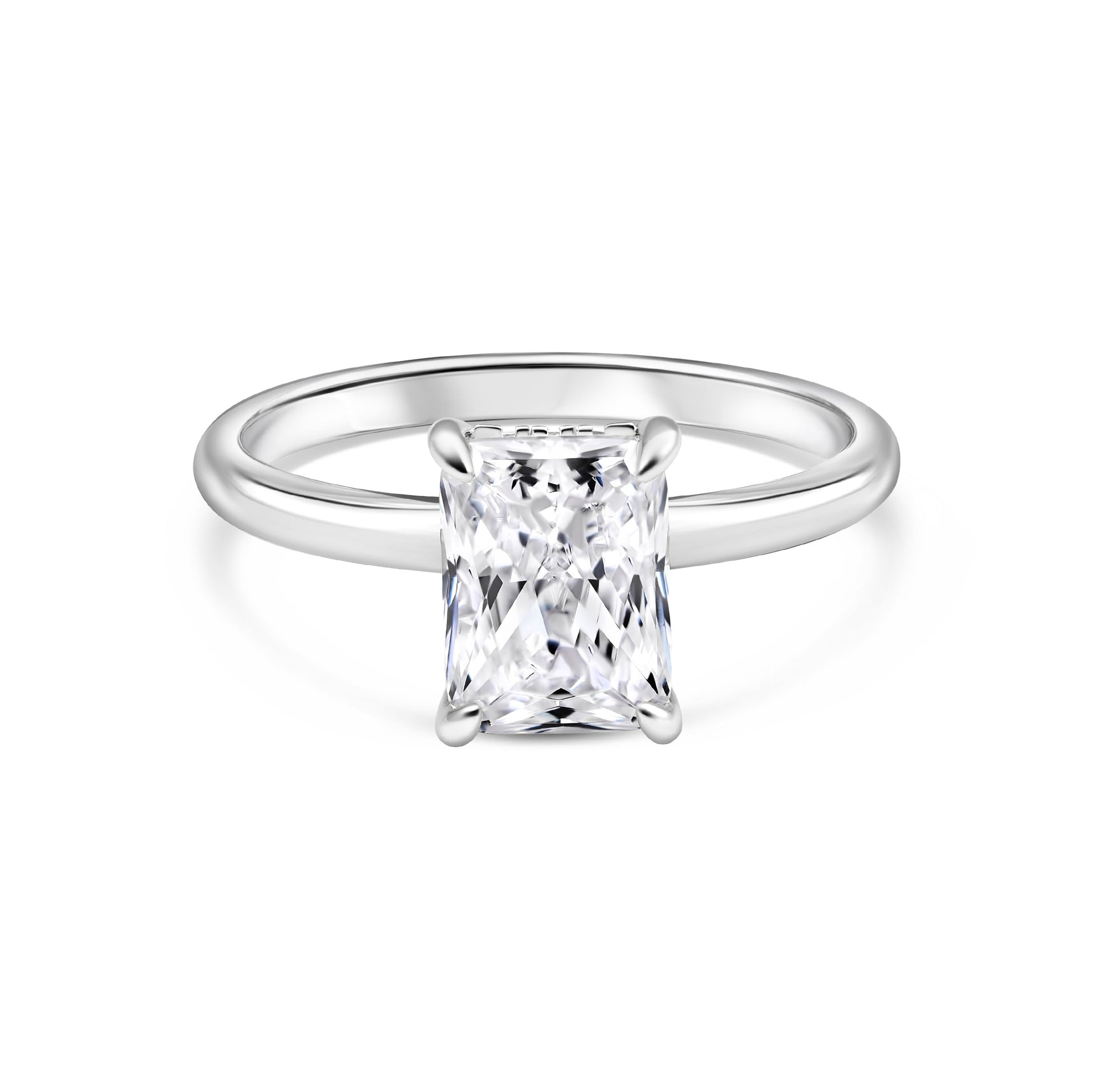 Add a touch of effortless sparkle to every moment with The Michelle. This engagement ring is a dainty masterpiece that is crafted with a 1.5 carat radiant cut conflict-free center stone with a lovely hidden halo sitting atop a sleek 925 sterling silver solitaire band. She’s simple, precious, and carries a hint of classic elegance that shines effortlessly from every angle. The ring’s dainty stone is designed with a classic theme in mind, while the hidden halo provides just the right amount of subtle luxury. As gorgeous as she is on her own, we suggest styling her with The Eternity and The Zoey band for an absolutely breathtaking triple stack, or pair her with The Artemis to create a glamorous shine. Also available in gold.