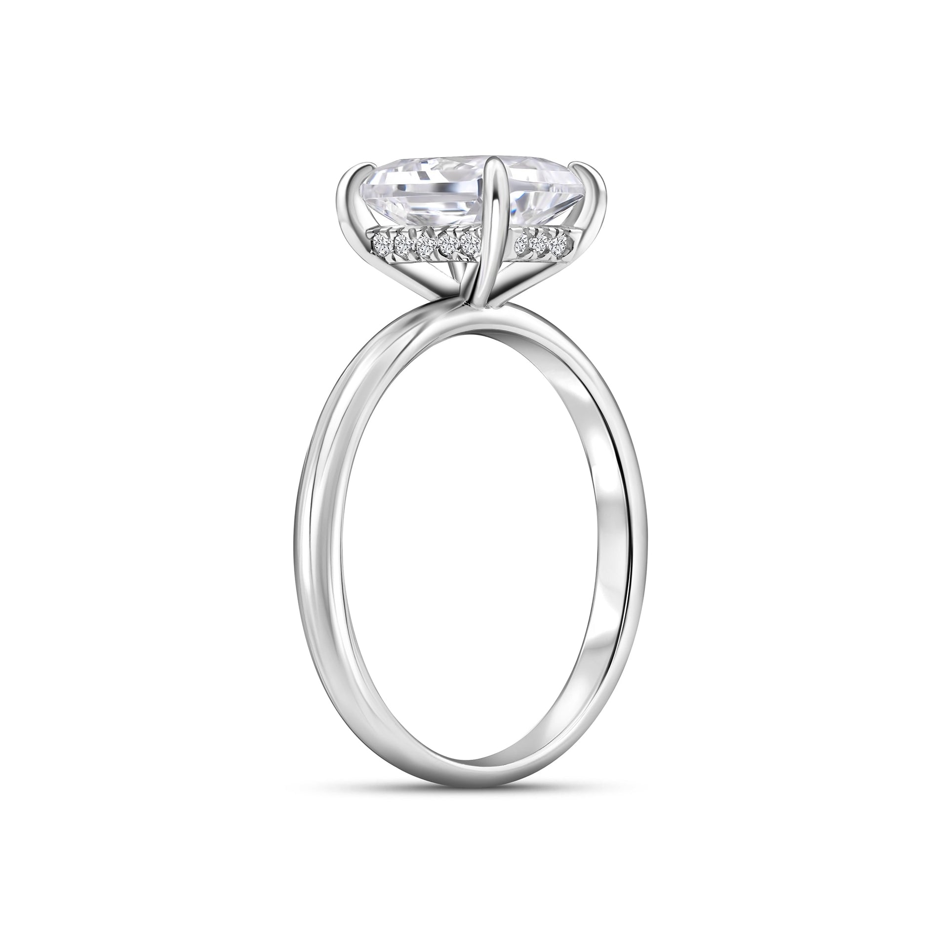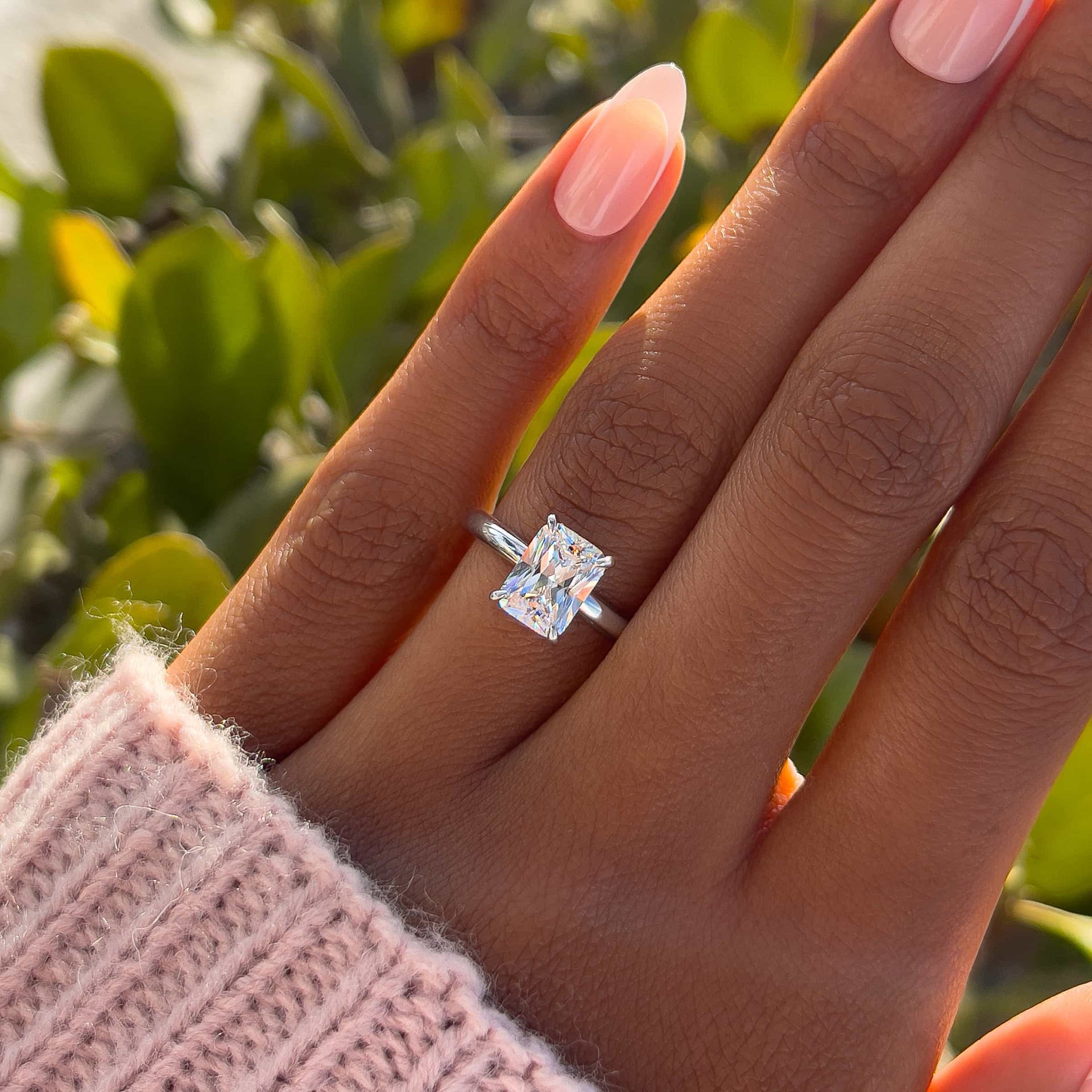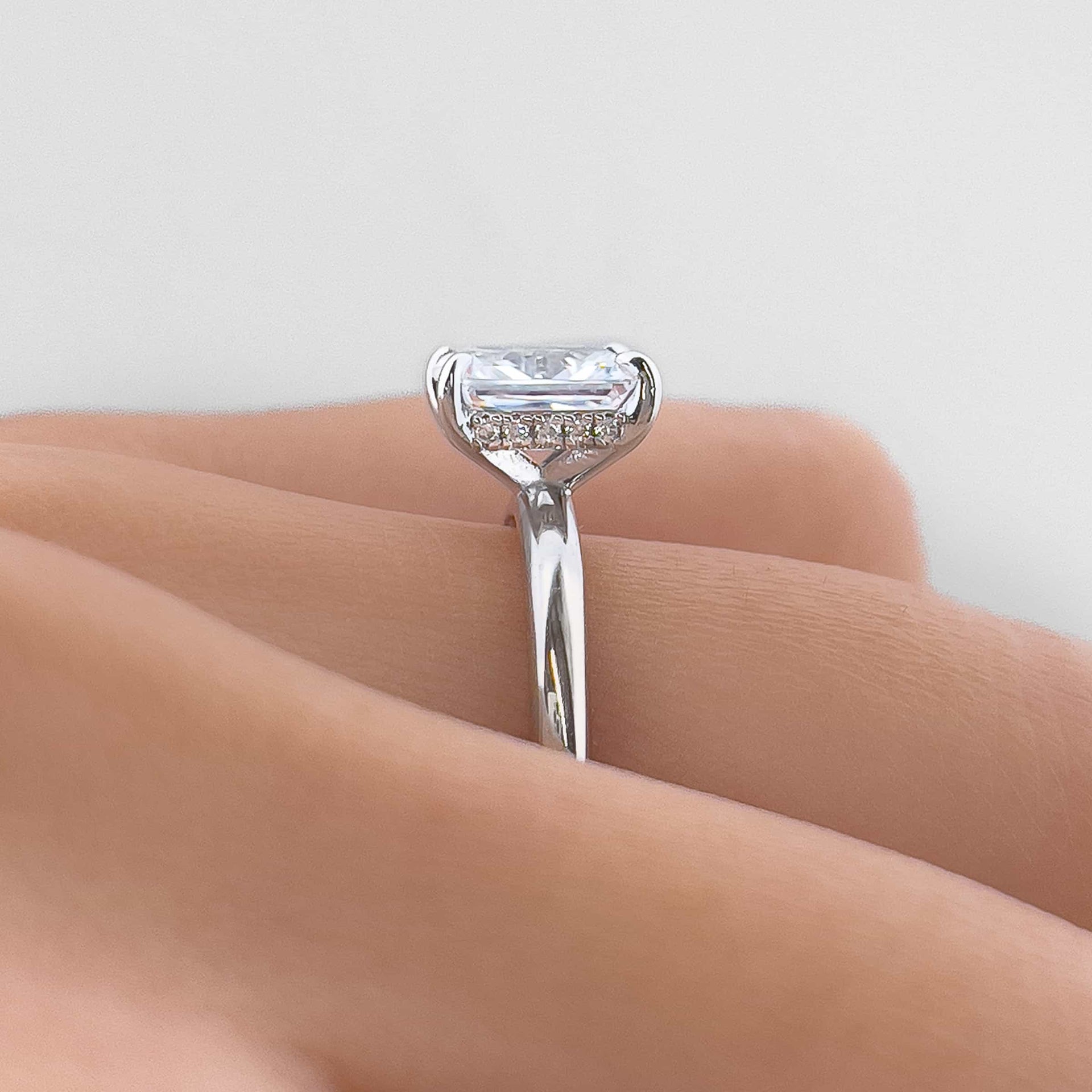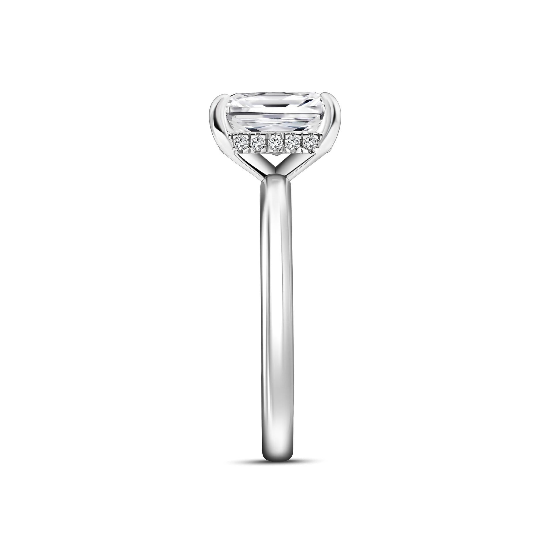 Add a touch of effortless sparkle to every moment with The Michelle. This engagement ring is a dainty masterpiece that is crafted with a 1.5 carat radiant cut conflict-free center stone with a lovely hidden halo sitting atop a sleek 925 sterling silver solitaire band. She’s simple, precious, and carries a hint of classic elegance that shines effortlessly from every angle. The ring’s dainty stone is designed with a classic theme in mind, while the hidden halo provides just the right amount of subtle luxury. As gorgeous as she is on her own, we suggest styling her with The Eternity and The Zoey band for an absolutely breathtaking triple stack, or pair her with The Artemis to create a glamorous shine. Also available in gold.