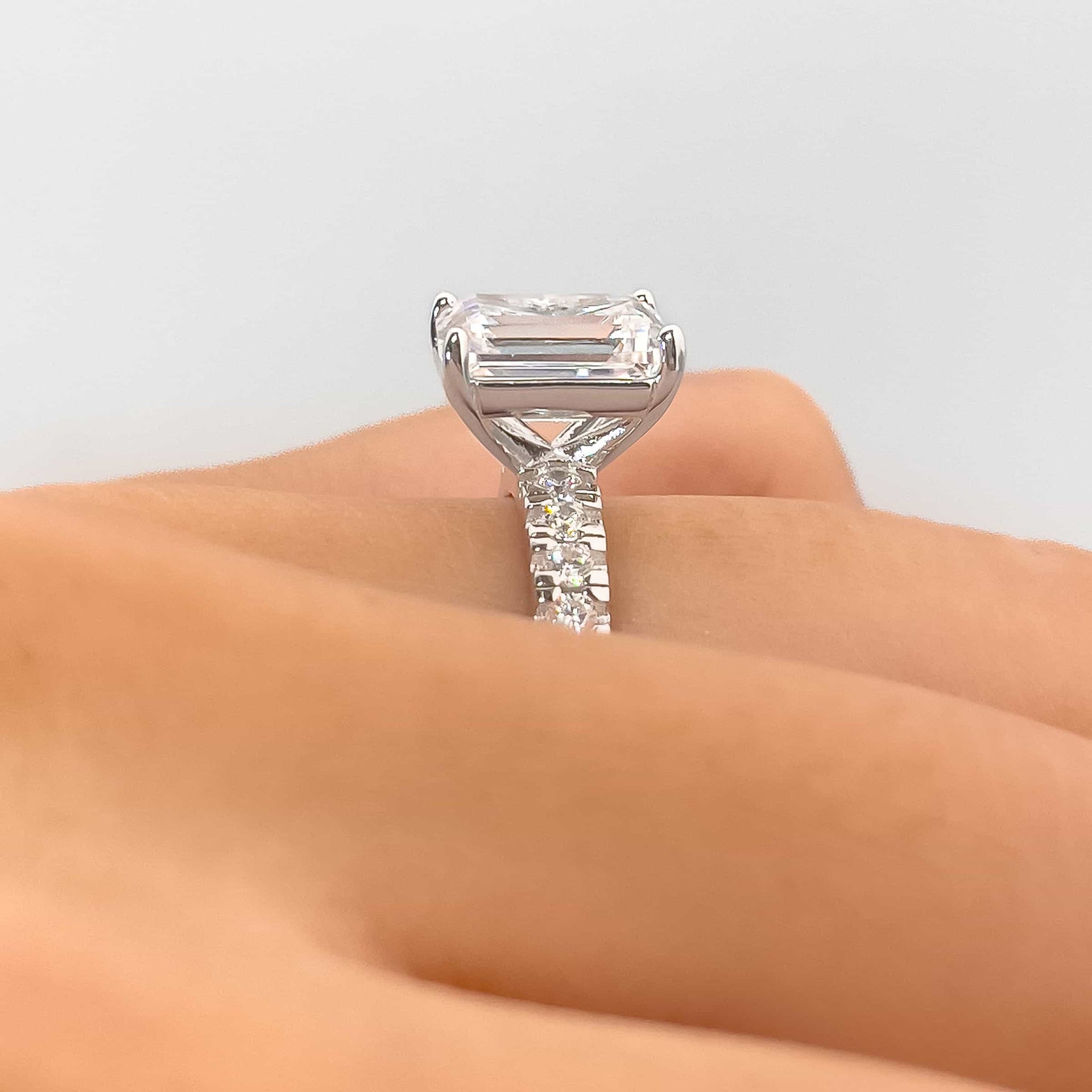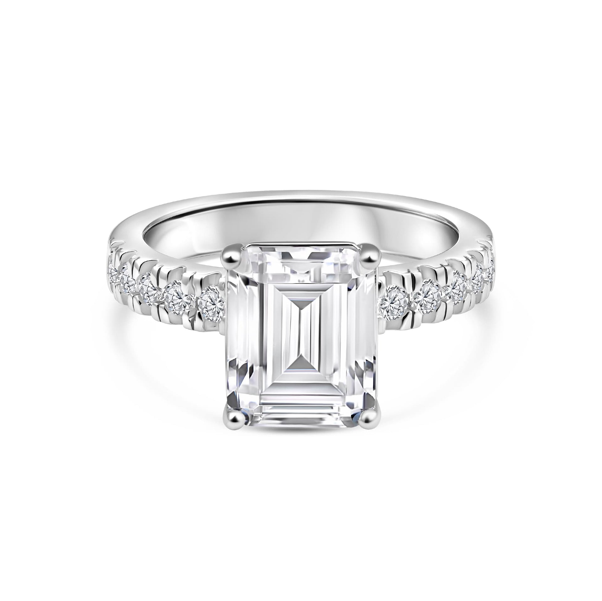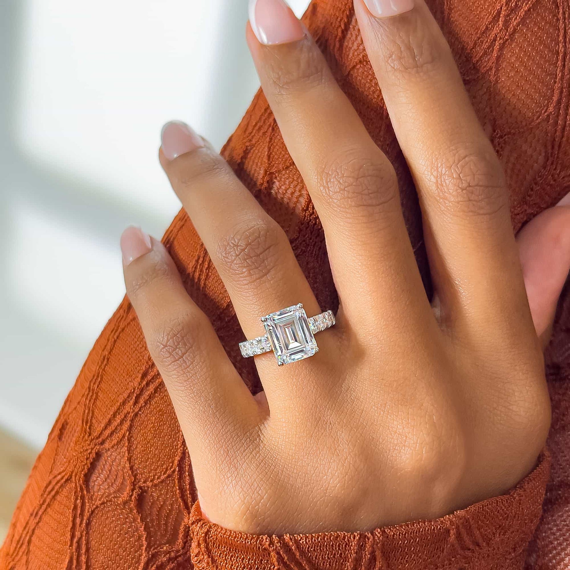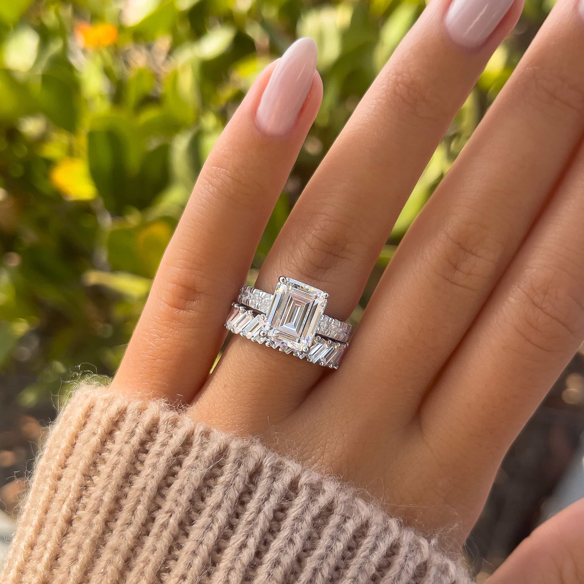 Meet the ring that is both glamour and elegance wrapped up into one. The Riley is a stunning emerald cut with a modern design that was created to withstand the test of time. This engagement ring features a 3.75 carat center stone complemented by a dazzling half eternity band in a 925 silver finish. Its bold center stone and dazzling band will draw non-stop attention for all the right reasons. As gorgeous as she looks solo, we also love to see this beauty with The Mia band for twice the amount of sparkle, or mix it in with The Eternity Set for a lustrous triple stack moment. Also available in gold.