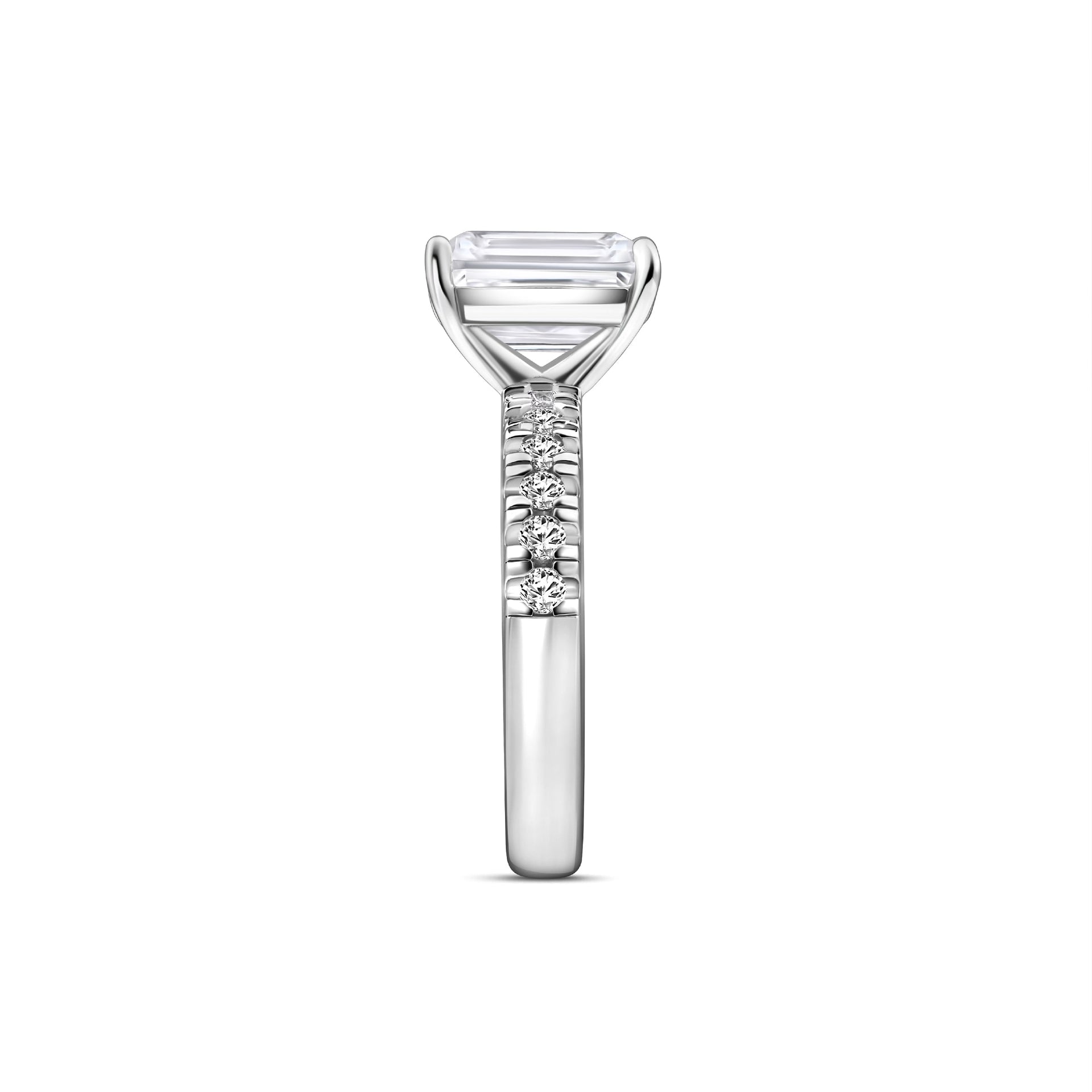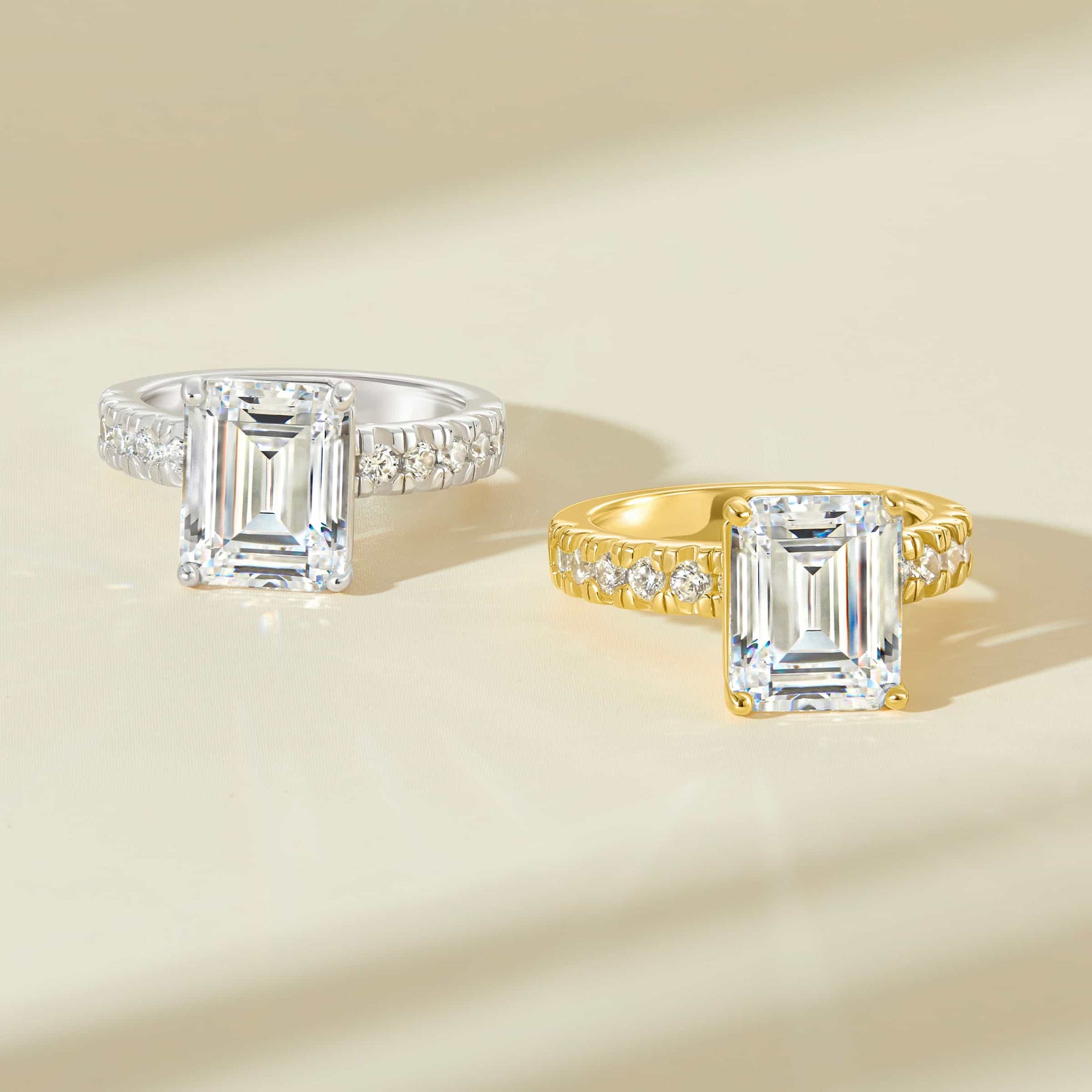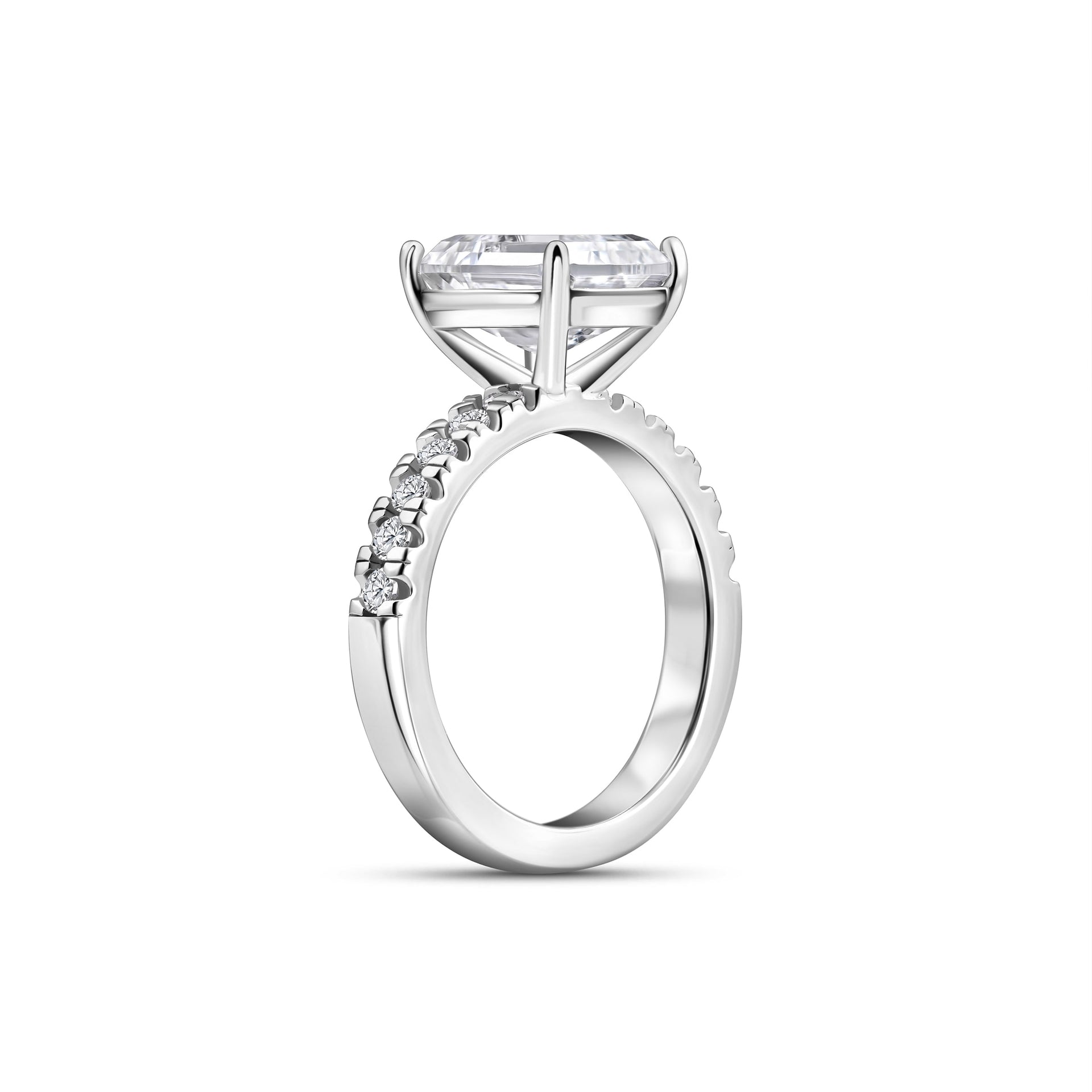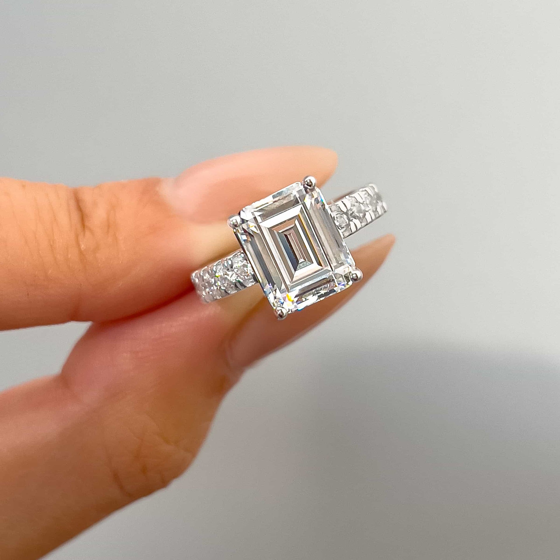 Meet the ring that is both glamour and elegance wrapped up into one. The Riley is a stunning emerald cut with a modern design that was created to withstand the test of time. This engagement ring features a 3.75 carat center stone complemented by a dazzling half eternity band in a 925 silver finish. Its bold center stone and dazzling band will draw non-stop attention for all the right reasons. As gorgeous as she looks solo, we also love to see this beauty with The Mia band for twice the amount of sparkle, or mix it in with The Eternity Set for a lustrous triple stack moment. Also available in gold.