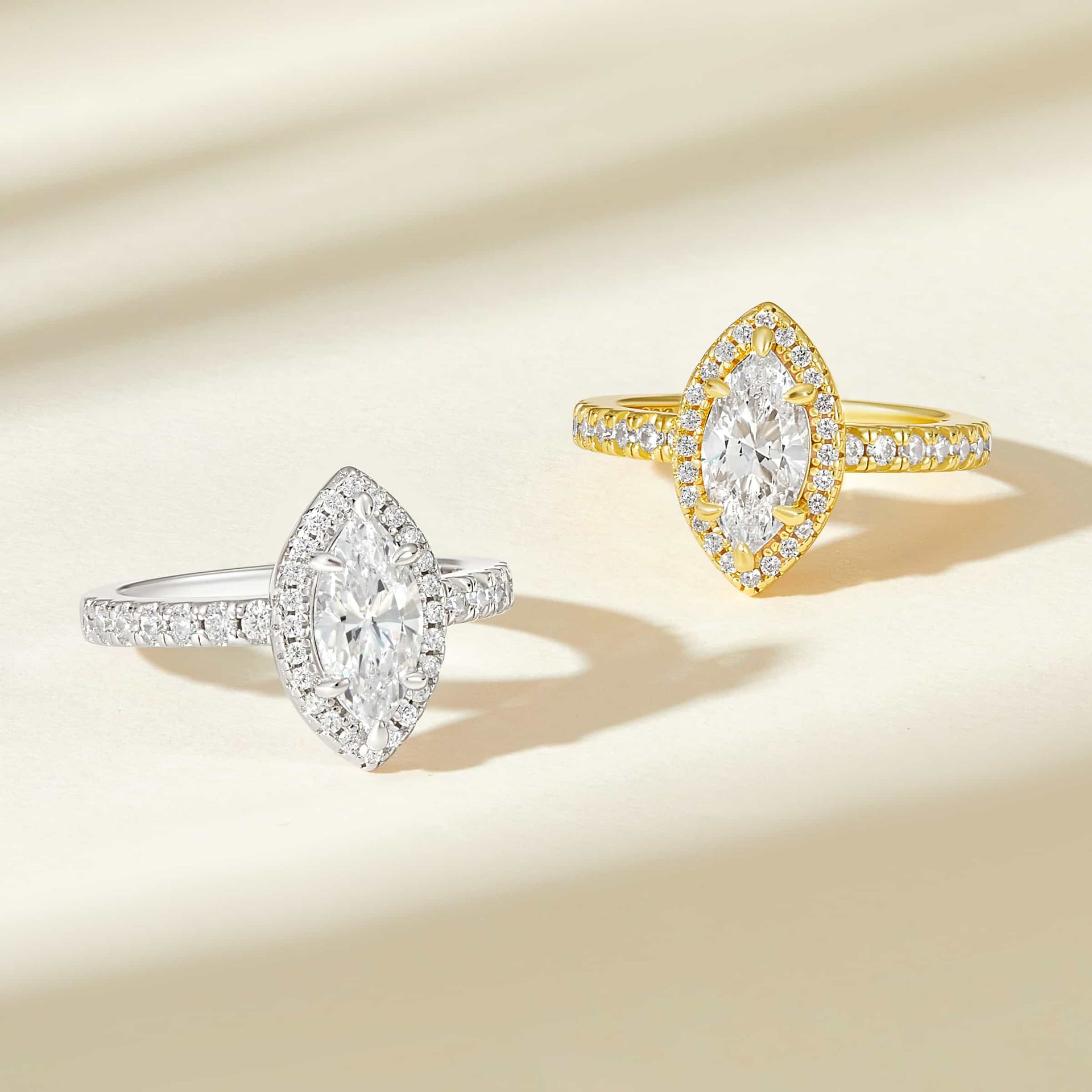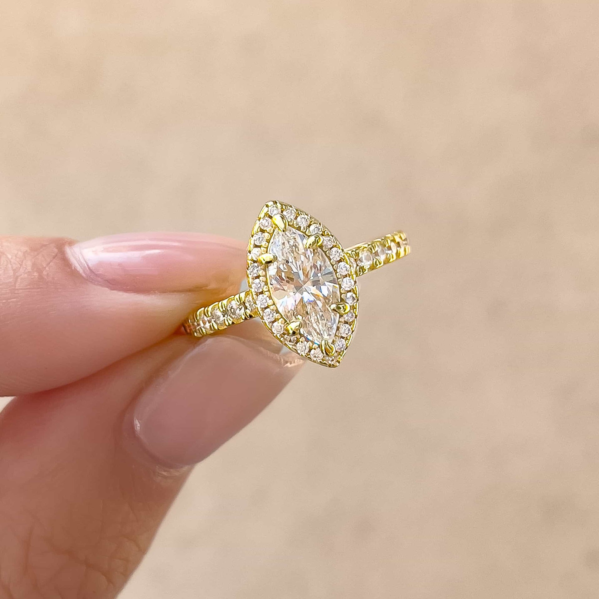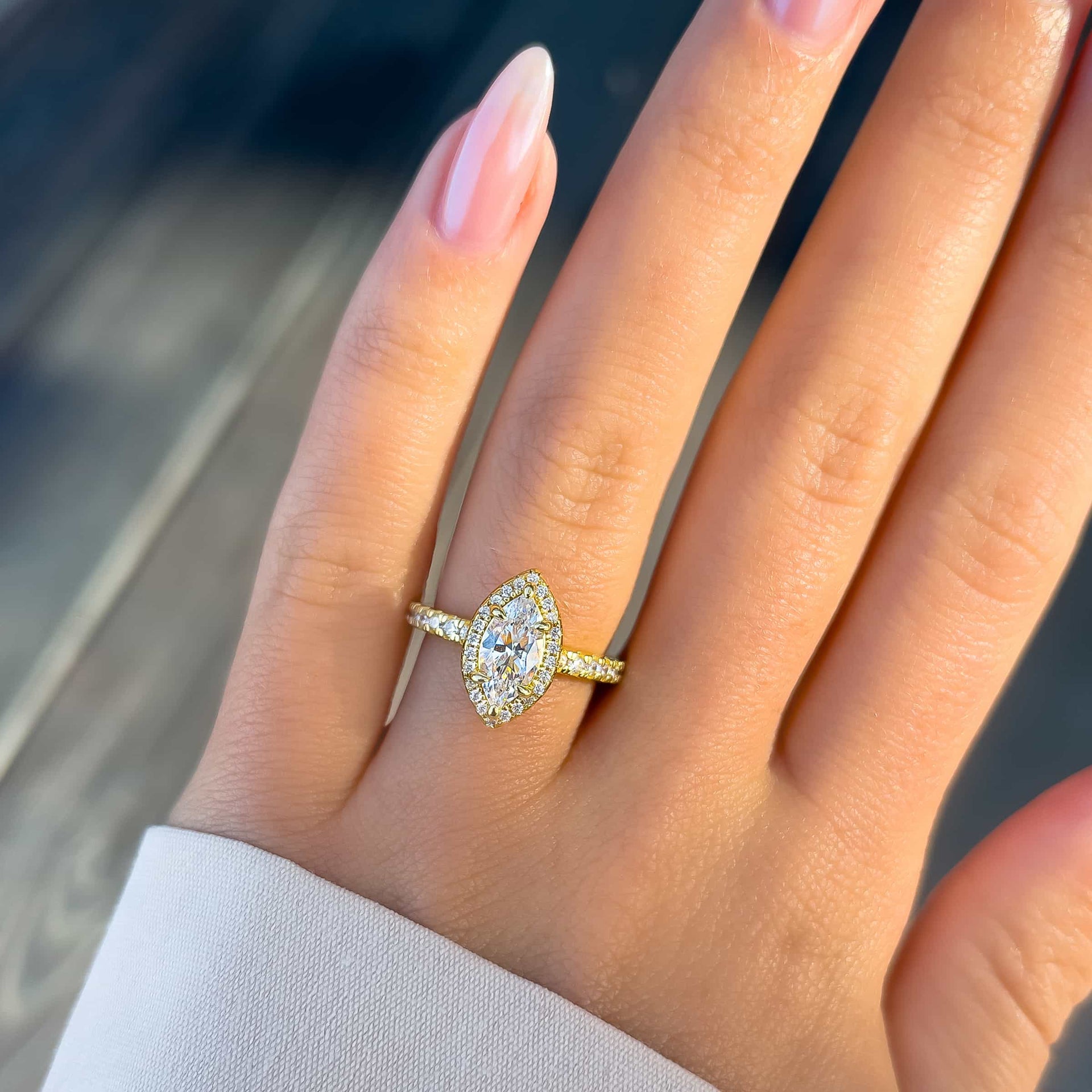 Meet the engagement ring that was meticulously designed to shine with every moment. The Vanessa features a 1 carat marquise cut center stone that’s surrounded by a glowing halo and sits atop a brilliant half eternity band. The small marquise shape brings a vintage tone to a modern style for a bride who wants it all. This blend of detailing creates a breathtaking piece that packs an endless amount of sparkle that will never go out of style. To add even more glamour to your bridal look, match her up with The Adeline and see how well they complement each other or stack her with The Sienna for an even greater shine. Also available in silver.