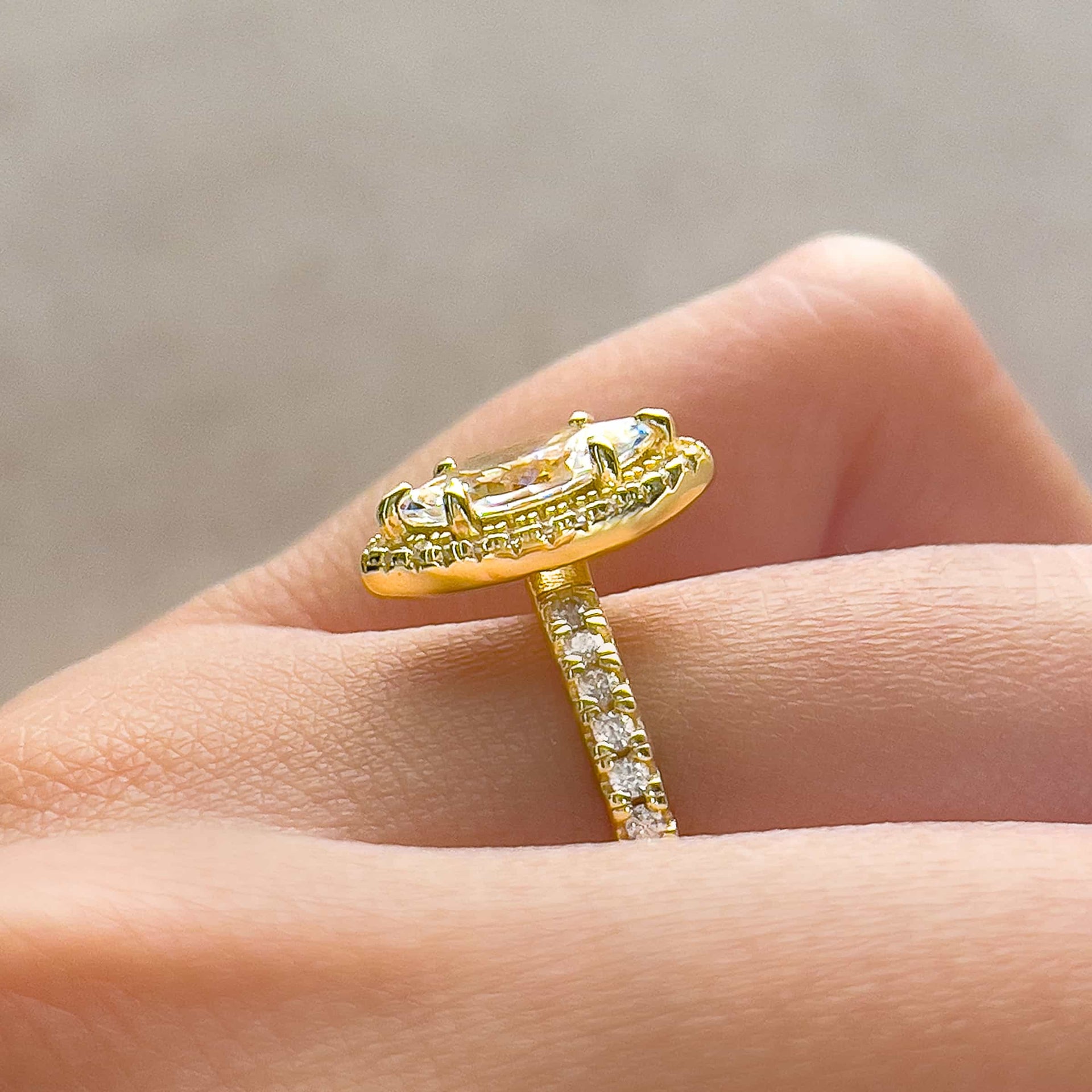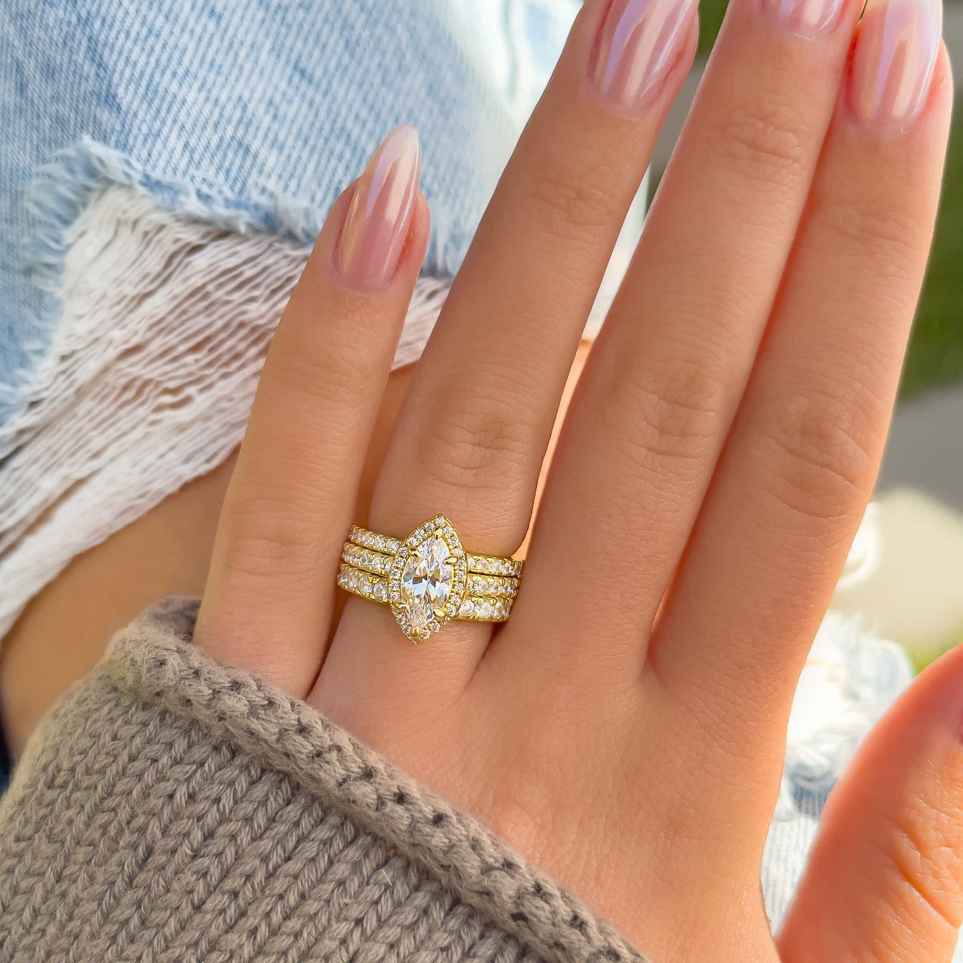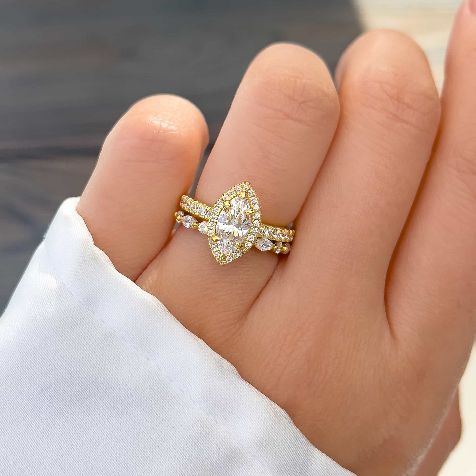 Meet the engagement ring that was meticulously designed to shine with every moment. The Vanessa features a 1 carat marquise cut center stone that’s surrounded by a glowing halo and sits atop a brilliant half eternity band. The small marquise shape brings a vintage tone to a modern style for a bride who wants it all. This blend of detailing creates a breathtaking piece that packs an endless amount of sparkle that will never go out of style. To add even more glamour to your bridal look, match her up with The Adeline and see how well they complement each other or stack her with The Sienna for an even greater shine. Also available in silver.