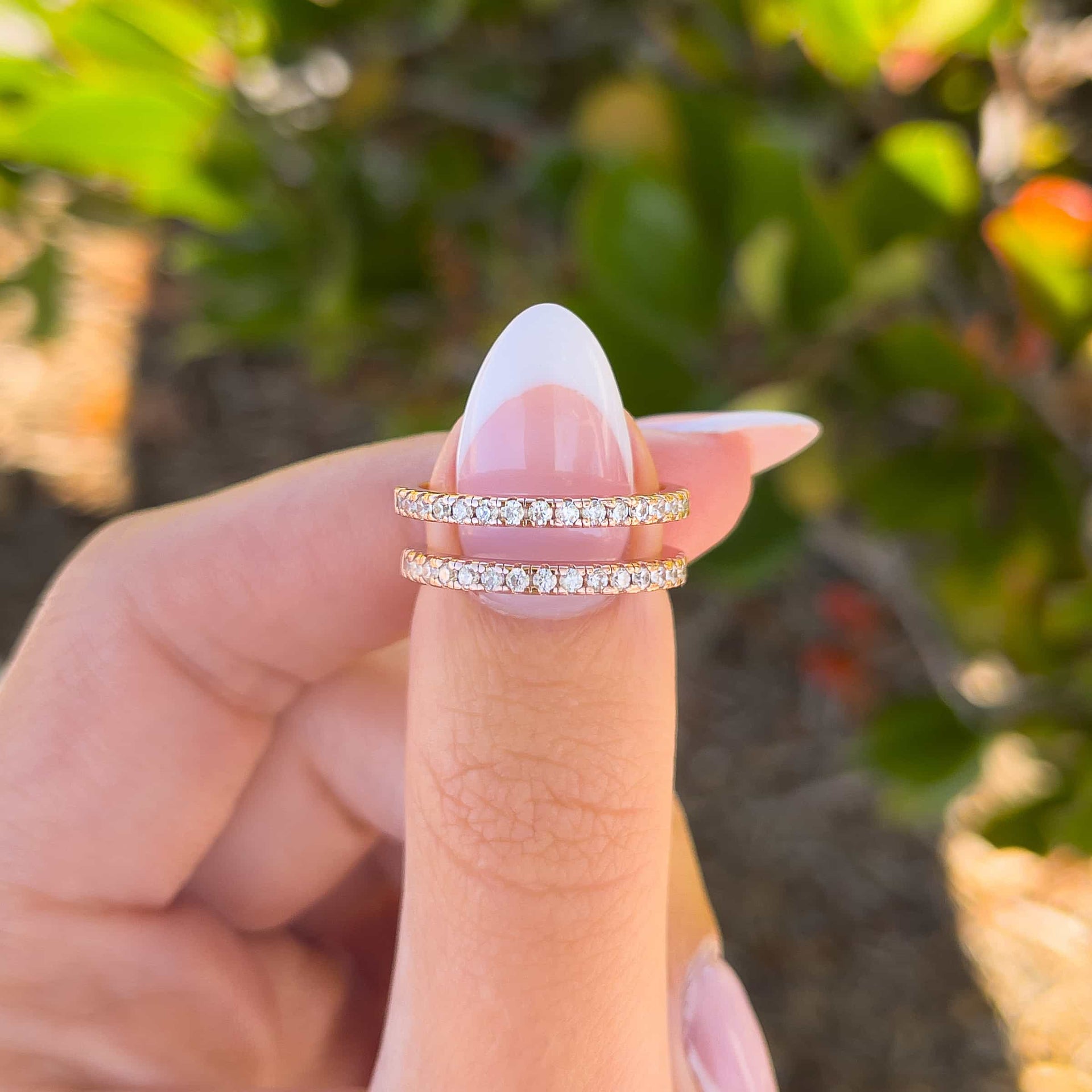 Feel all the romantic vibes when stacking your engagement ring with The Desire Stacking Set - rose gold. The Desire is a true fan favorite with its 2mm width and half eternity band detailing. With two in a set, you can mix, match, and stack to your heart’s content! This wedding band stack is ideal to pair with any style of engagement ring! Stack it with The Kira to create a look that is effortlessly chic or wear it with The Amelia for something truly classic. This stacking set is also available in silver and gold.