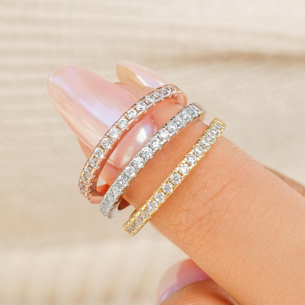 This collection features contoured bands, v-shaped rings, and sleek eternity bands—each thoughtfully crafted to nest alongside solitaire styles or shine solo. Choose from timeless silver, romantic rose gold, or elegant yellow gold finishes, all made with durable, tarnish-resistant metals designed for daily wear.