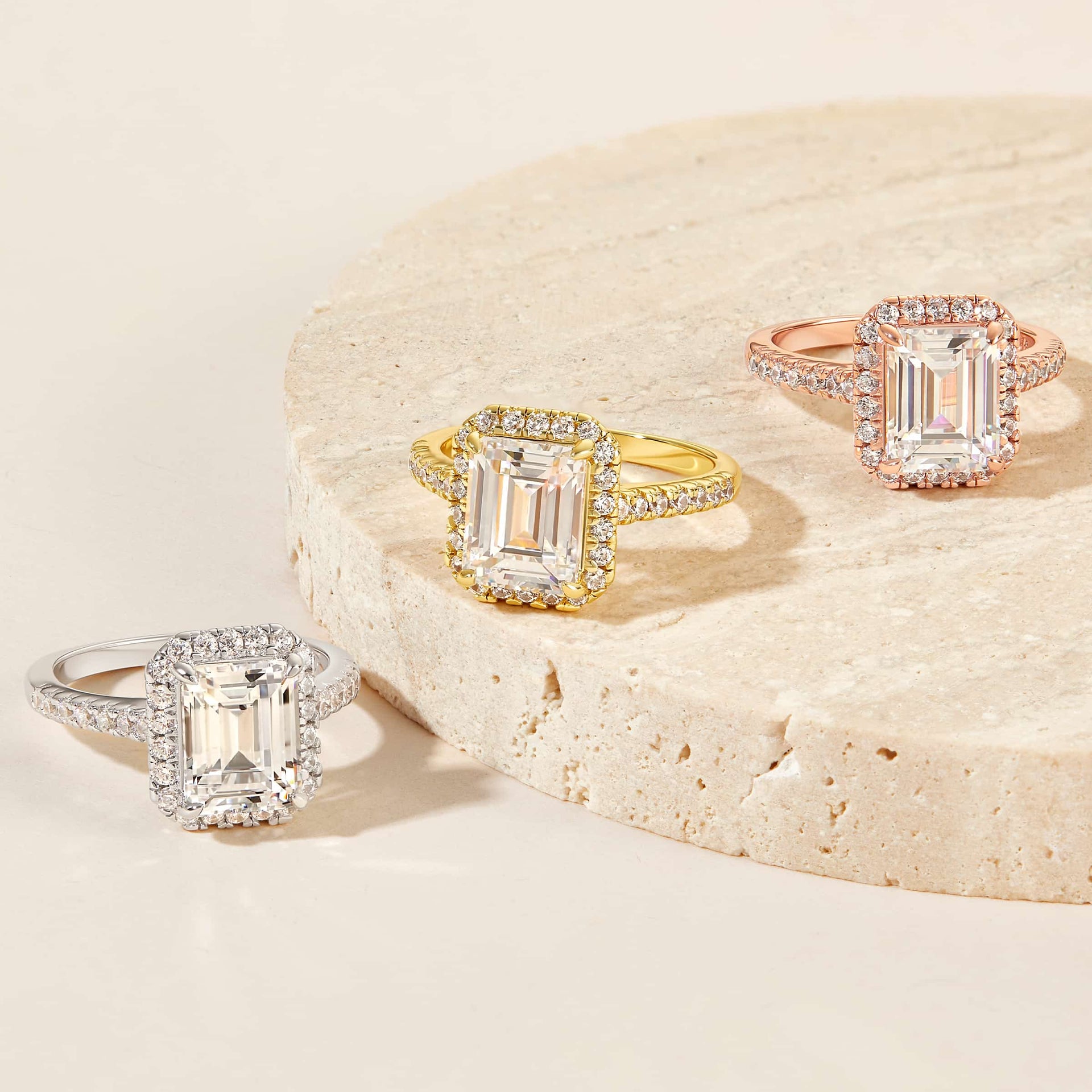 Level up your look with The Blair in this breathtaking gold color. A 3 carat emerald cut with a dazzling halo and half eternity band. Crafted with detailed perfection, this piece expresses effortless beauty and sophistication. The radiant shine captures the essence of luxury, making it a great addition to any wardrobe. This stunning emerald cut is a statement of unparalleled style and glamour.