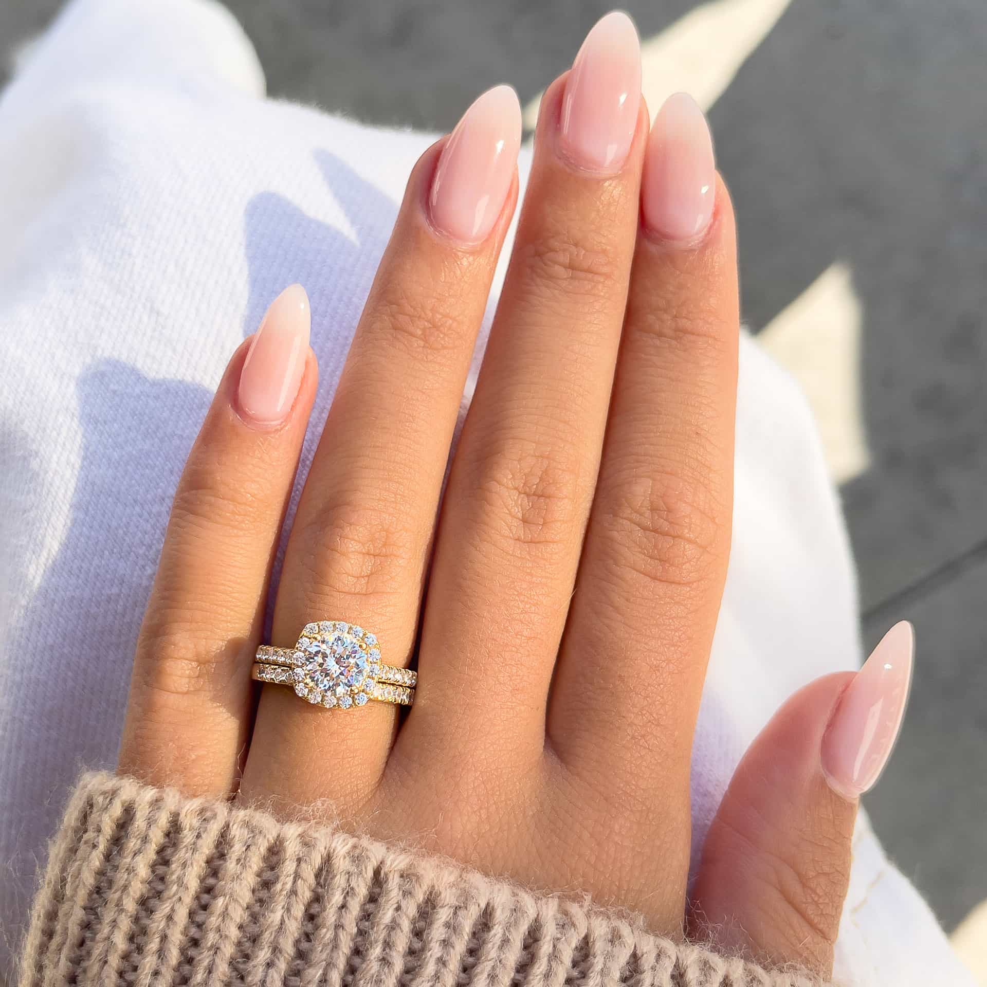 When you can’t decide between a round shape or a cushion – why not get both? The Evermore combines both elements by taking a 1.5 carat round cut stone and a glimmering yellow gold cushion shaped halo. Bright, feminine, and shiny, this one of a kind ring comes with a matching half-eternity band that sits perfectly flush to complete your wedding set. Want to add even more bling? Pair it with a desire for a matching band, or mix it up with the Sadie or the Forever. Also available in silver and rose gold.