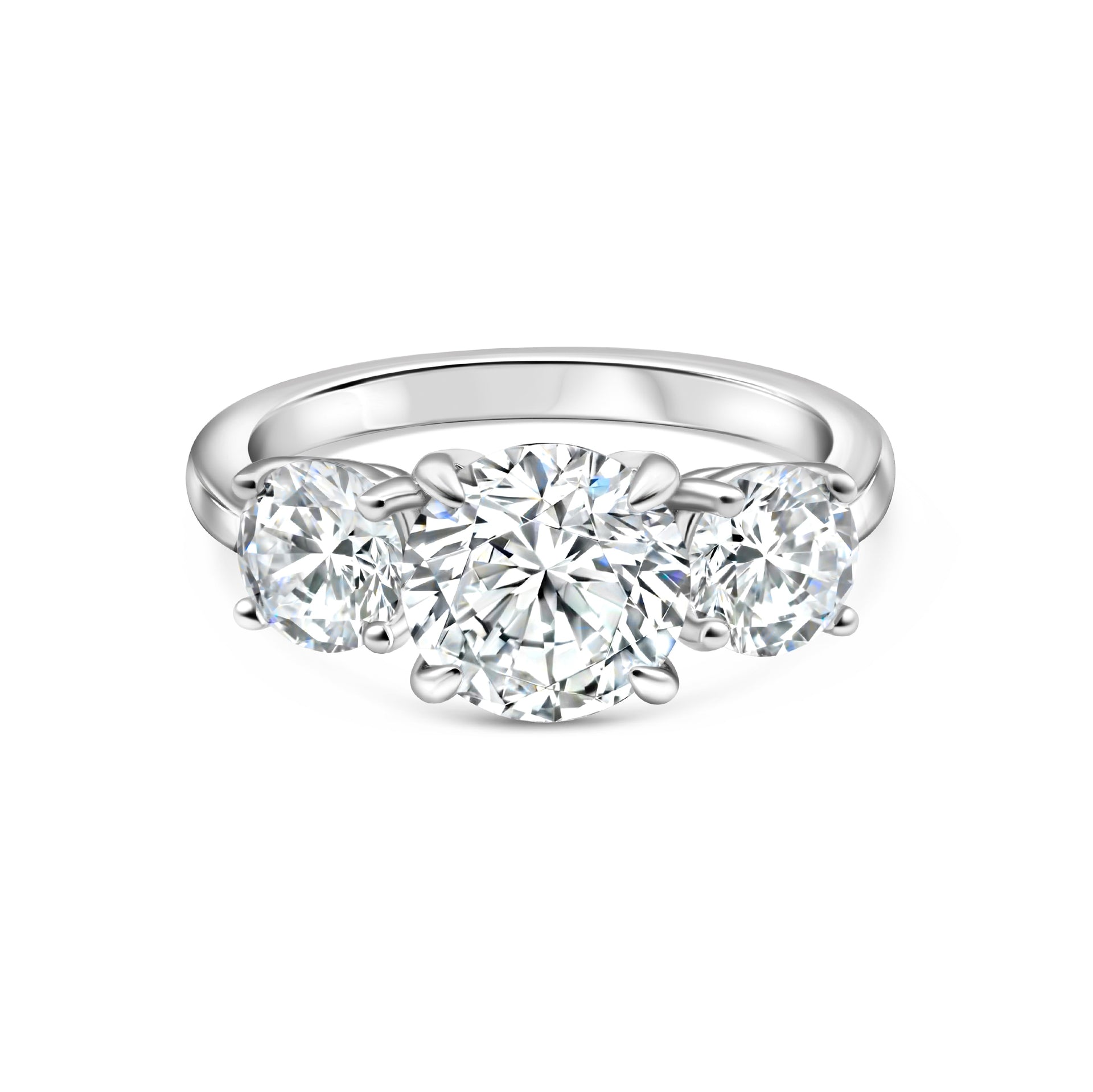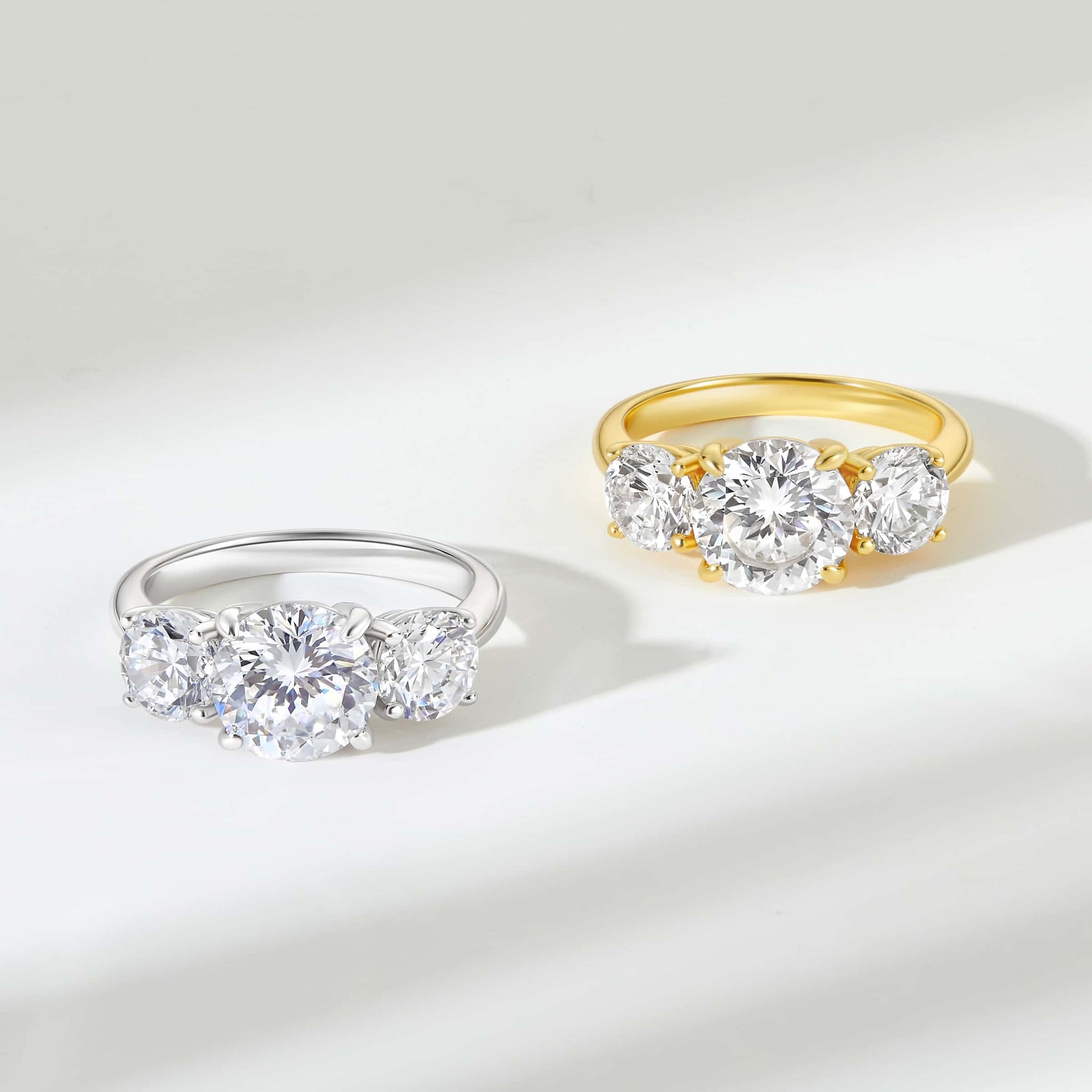 If you’re looking to escape ordinary engagement ring trends while maintaining a classic touch, then this is exactly what you’re looking for. The Trinity is a stunning wedding ring that redefines tradition with its striking three-stone design. This trilogy ring is designed with a 2 carat round cut center stone with 2 additional 1 carat round cut stones at each side sitting on top of a sleek solitaire band in a yellow gold finish. It offers a harmonious blend of elegance and boldness for those who want to stand out, but in sophisticated fashion. And to make this bridal look even more impressive, pair this beauty with The Adeline for a vintage touch or stack it with The Zoey to add a sparkly element. Also available in silver.