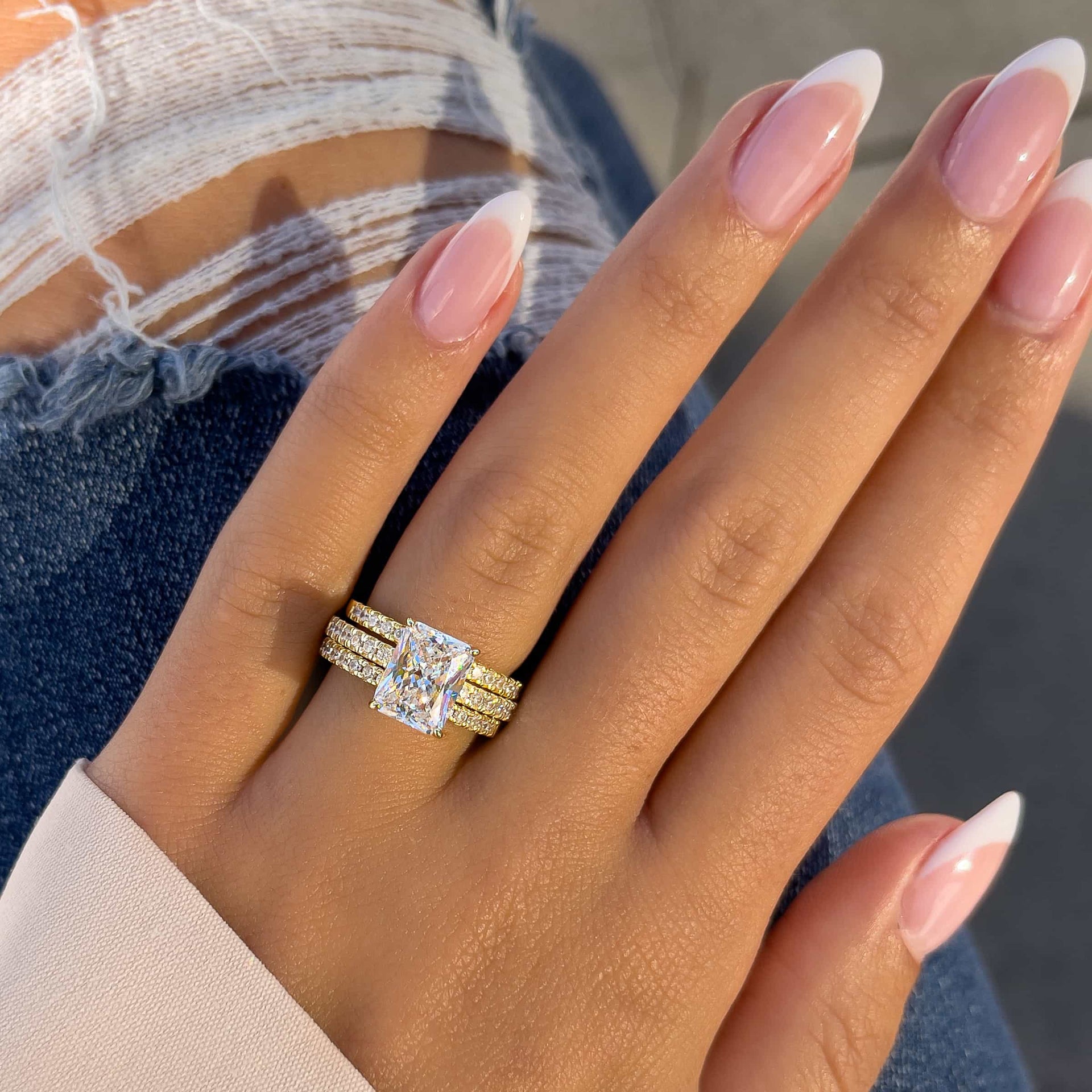 The gold duo that you’ve been dreaming of! Brighten up her world with The Promise Stacking Set. Made up of two eternity bands with delicately placed stones, this set gives nothing but pure shine. Each band is handcrafted with simulated diamonds and 925 sterling silver plated with a glistening 18k yellow gold creating a set that is not only high quality, but also affordable. Stack it with another wedding band for an effortless triple stack moment, or create a statement piece with any of our engagement rings. Try wearing this set with The Bliss or The Evermore for a show stopping combo. This versatile stack comes in gold, rose gold, and silver, meaning the styling possibilities endless!