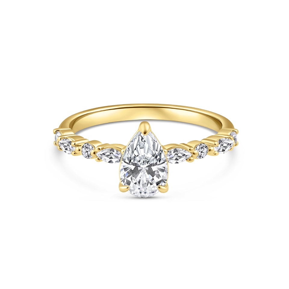 Take your bridal look to the next level with The Christine, a vintage-inspired engagement ring that is effortlessly striking. This ring features a 1.5 carat conflict-free pear cut stone that sits above a breathtaking half eternity band. The Christine’s band includes a beautiful pattern of dainty marquise and round cut stones that gives this piece a charming and eye-catching design in a stunning gold finish. She’s a perfect choice for brides who love classic styles but still want something that feels fresh and modern. Pair her with similar wedding bands like The Forever or The Melanie for the perfect matching set, or with The Zoey Stacking Set for a masterpiece triple stack. Either way, this is a ring that will never go unnoticed.