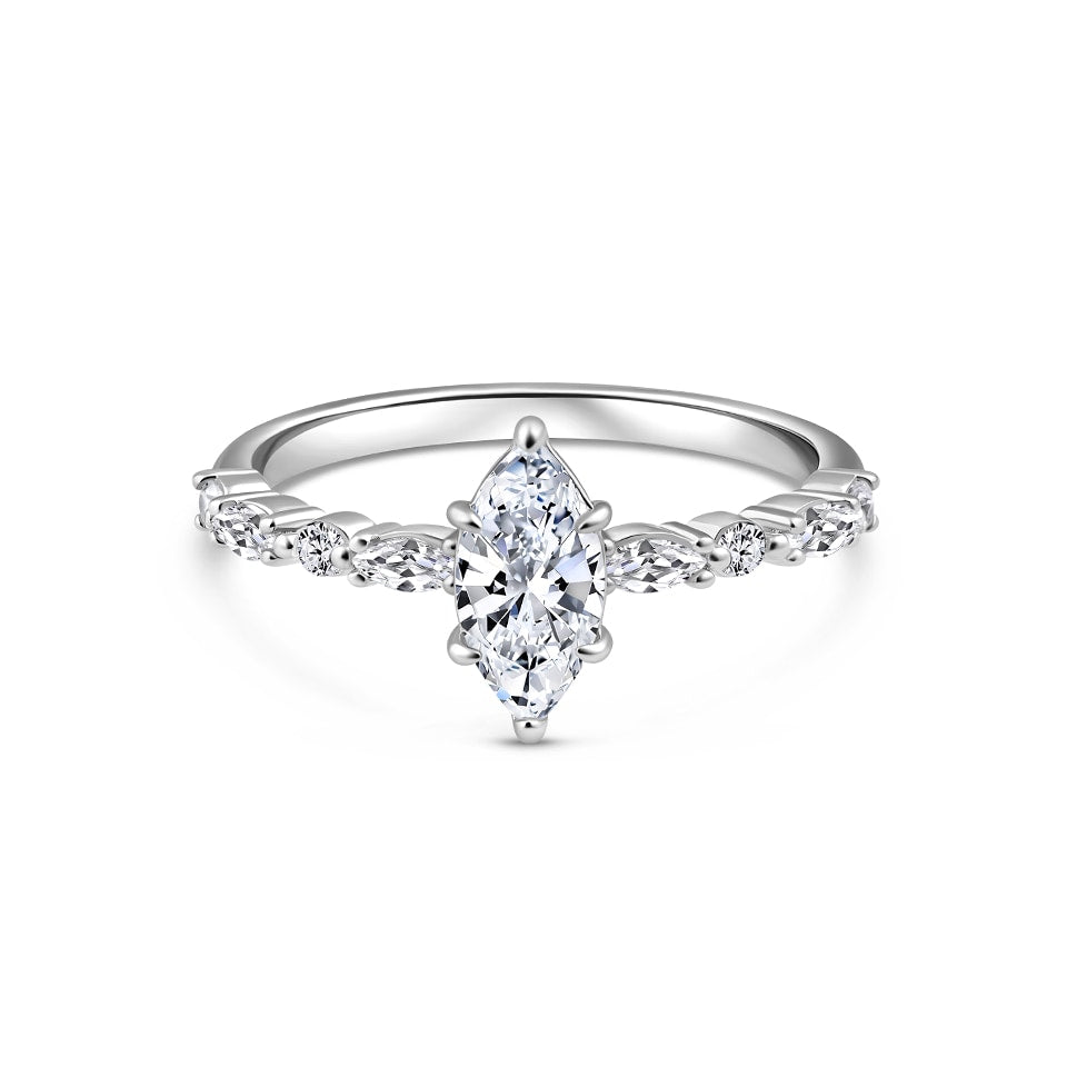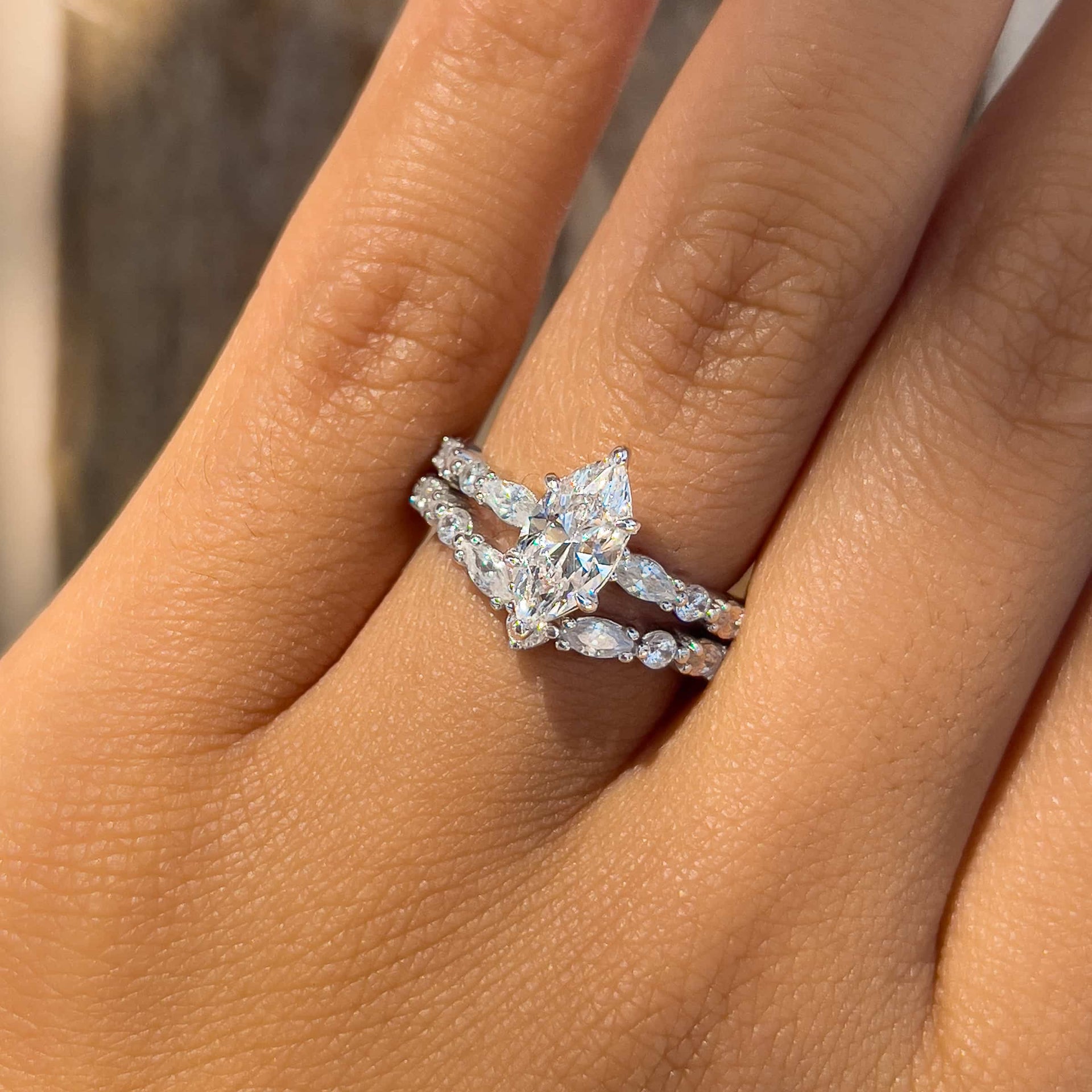 A little vintage, a little modern, and a whole lot of sparkle! The Mila is an eye-catching engagement ring loaded with unforgettable charm. This ring features a 1 carat marquise cut conflict-free center stone sitting above a half eternity band that’s made of dainty marquise and round cut stones in a uniquely beautiful pattern. Finished in a sleek and polished 925 sterling silver, The Mila is the ideal ring for those in search of a trendy look with a subtle touch of vintage. Create the perfect match by stacking her with similar detailed bands like The Adeline and The Mia, or complement the center stone with The Elsa. With a ring this iconic, there are truly no wrong answers.