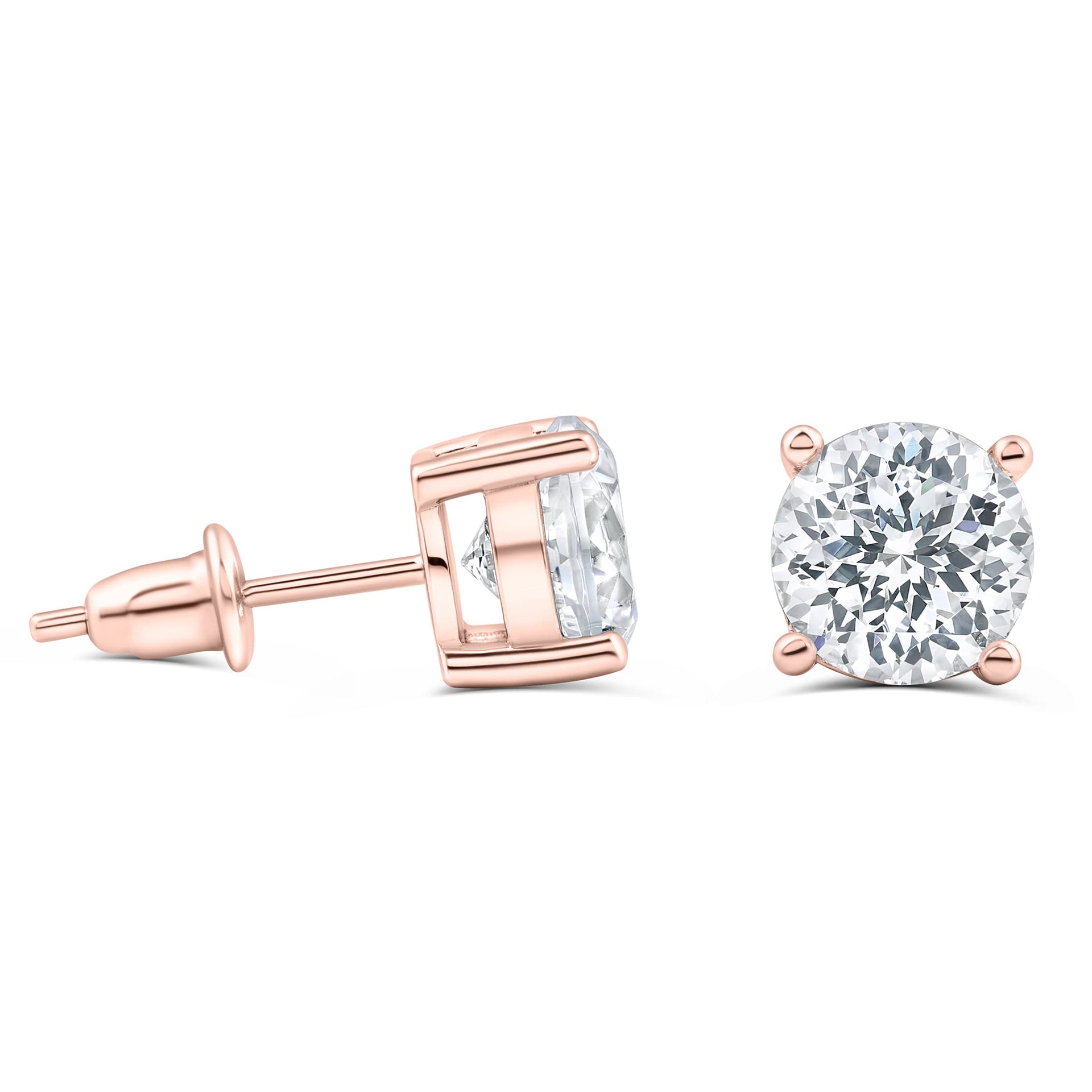 Glamorous, glitzy, and sophisticated, this pair of earrings will make you feel like a million bucks! Featuring gorgeous 1.25 carat conflict free simulated diamond studs, in a 925 sterling silver setting plated in Rose Gold. These simulated diamond studs complement all kinds of jewelry! These are a perfect addition to a proposal, can be used as a gift for a special occasion, or just to say, “I Love You.” These rose gold plated stud earrings are also available in silver and gold.